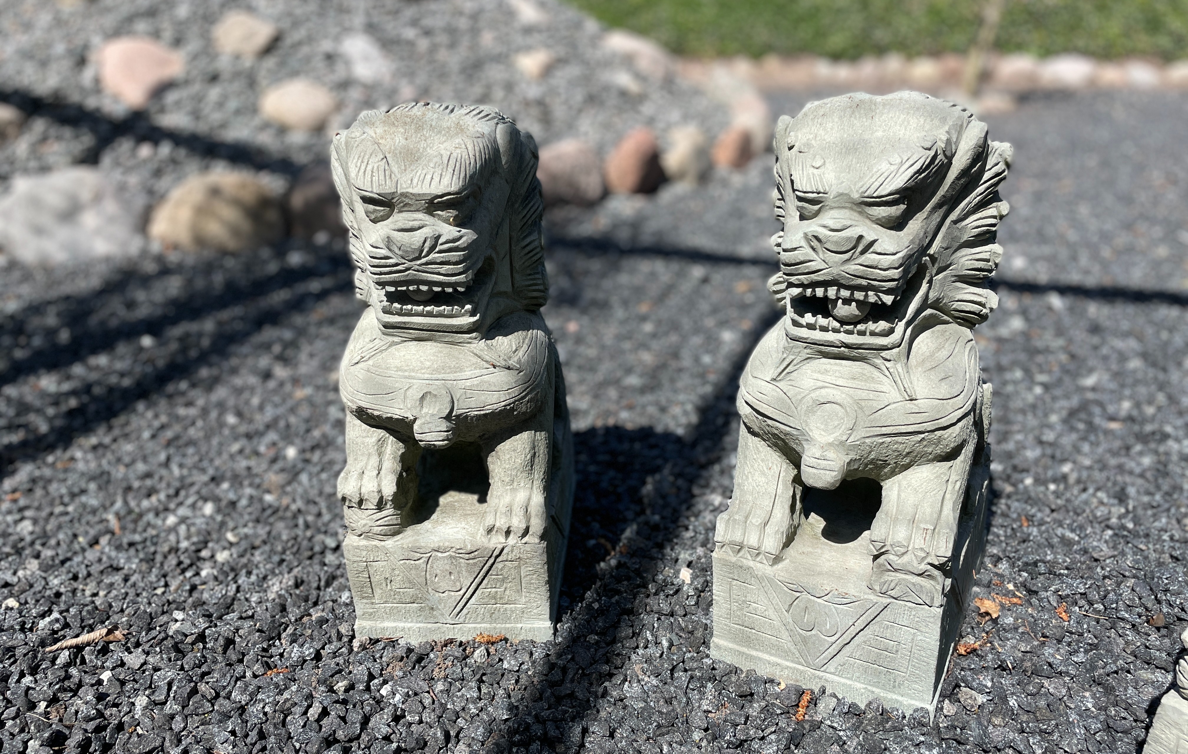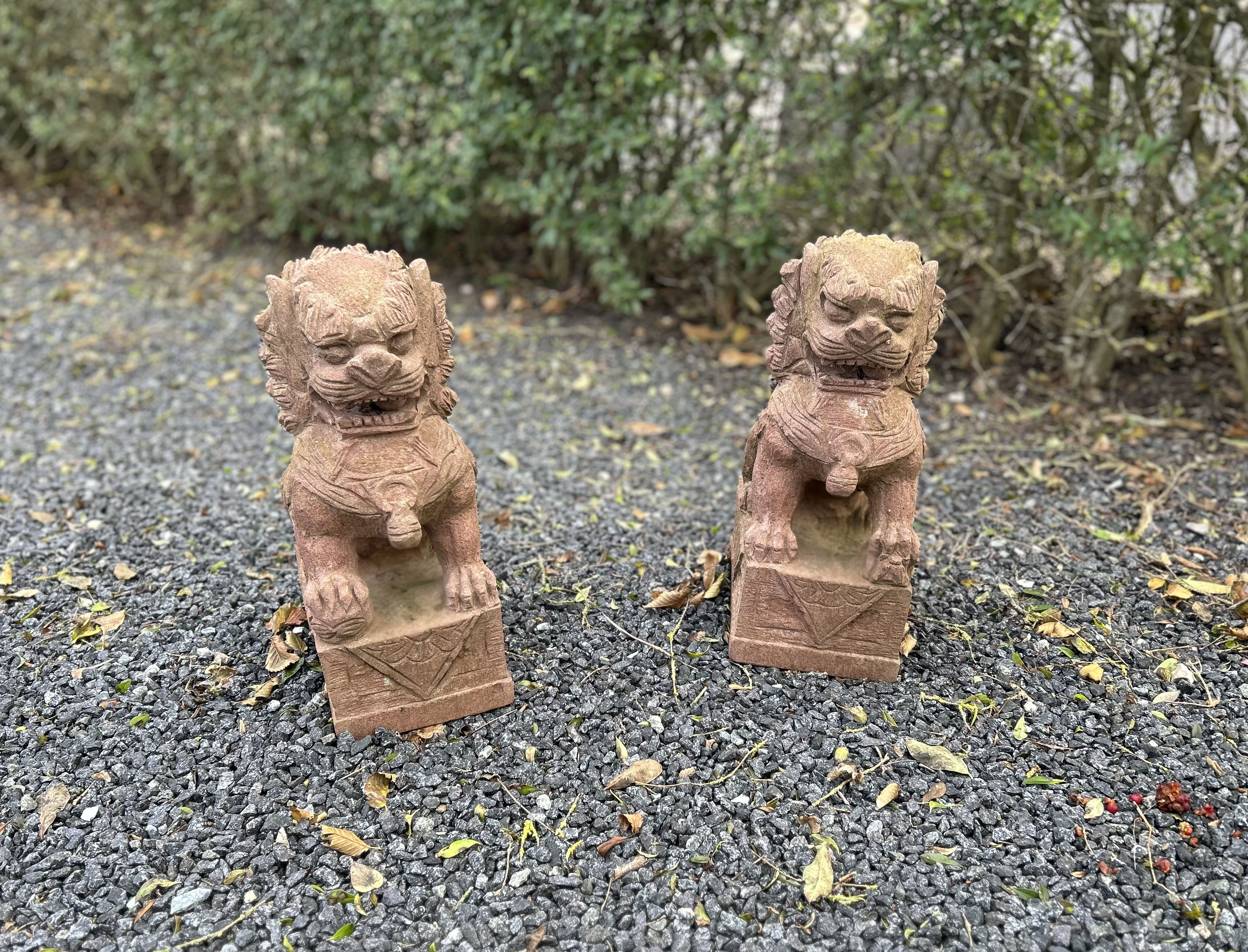 Løvepar i enten rød eller grøn sandsten. Sættet består af to løver. To kinesiske løver i haven eller ved indgangen skulle efter sigende bringe held og lykke.