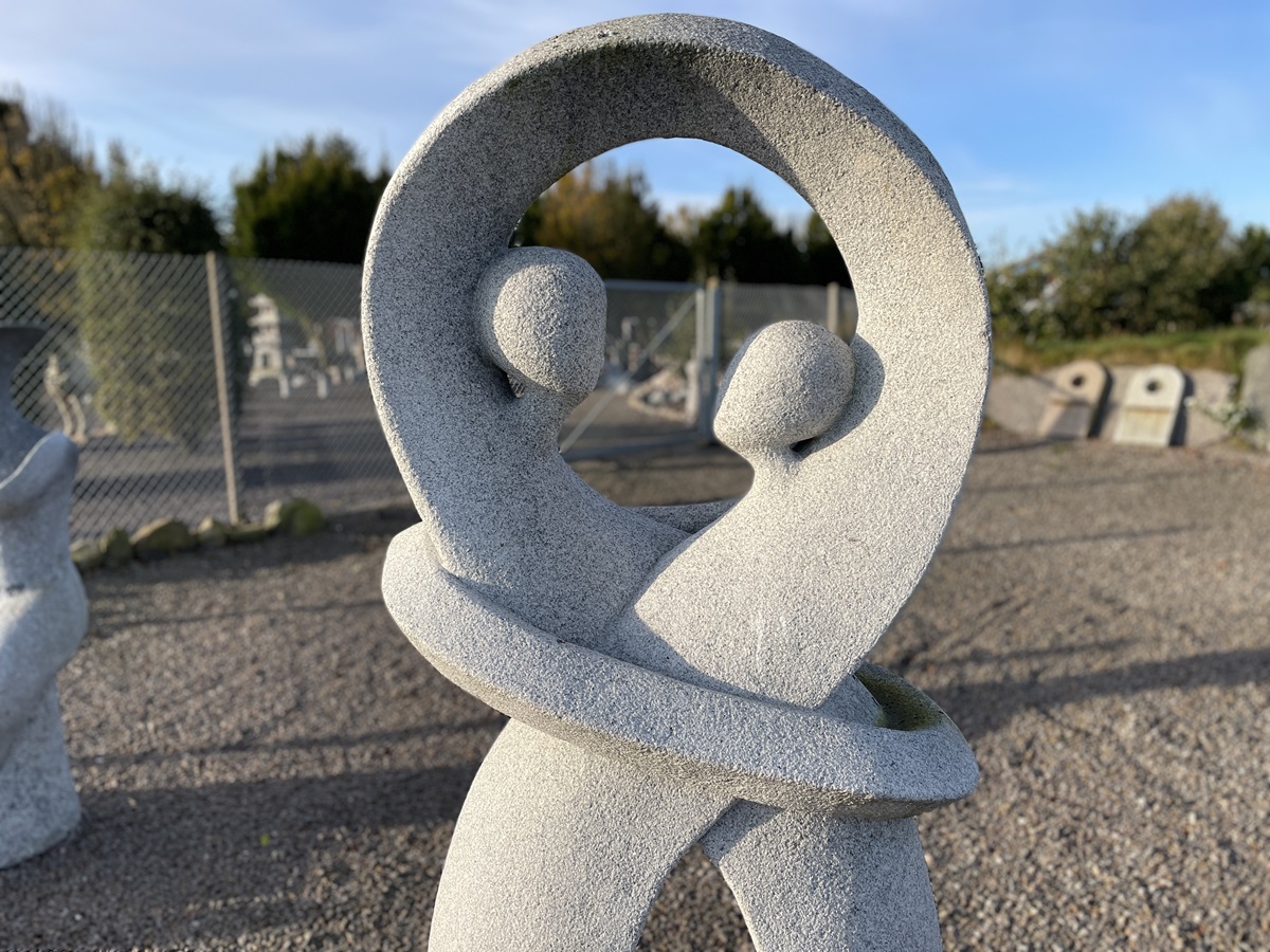 Skulpturen er udhugget i lysegrå granit, med bløde og afrundede former, som forestiller et par, der holder hinanden tæt. Skulpturen symboliserer kærlighed og sammenhold, og vil være et smukt element der vil passe ind i de fleste haver og indretninger.