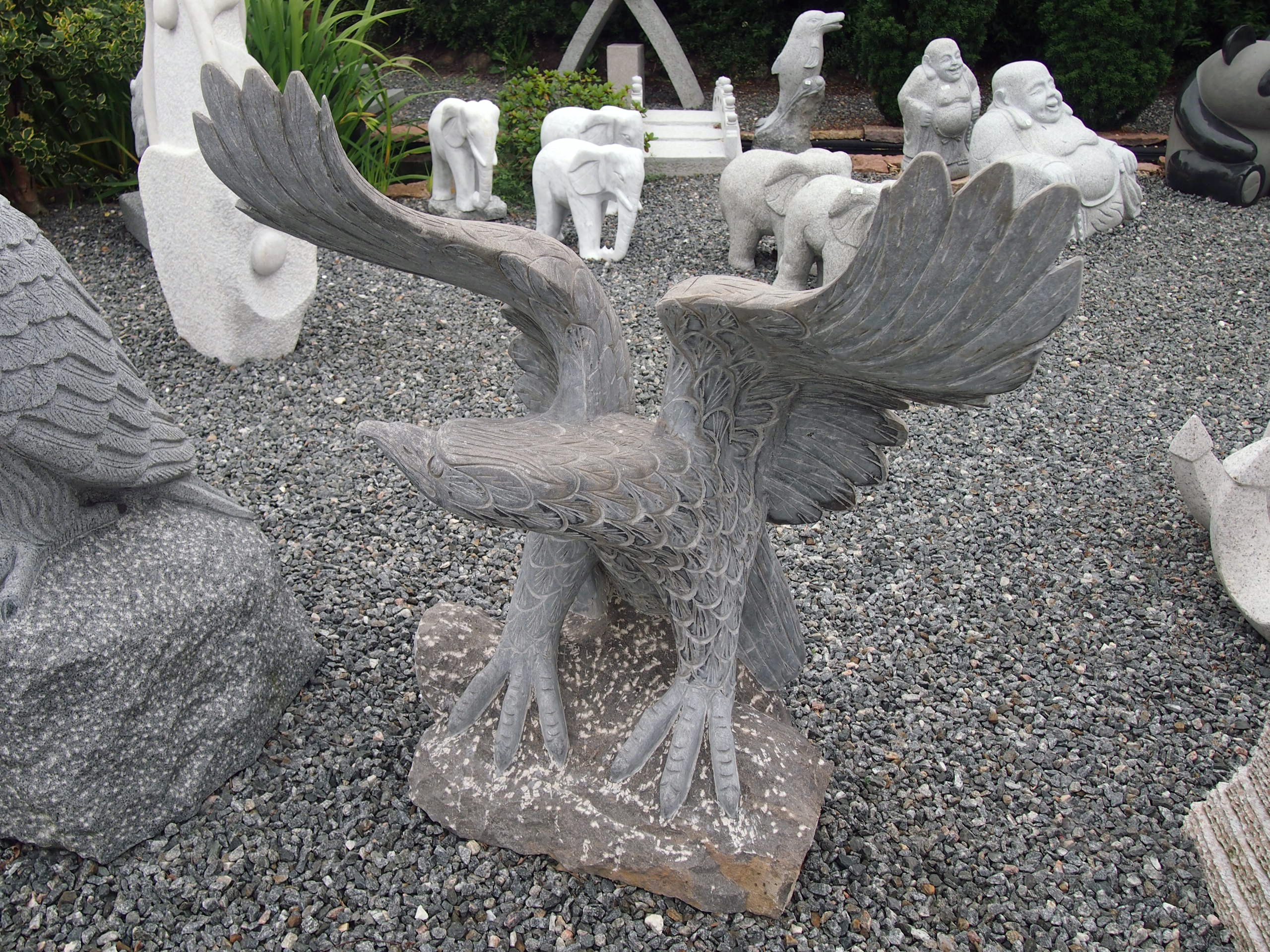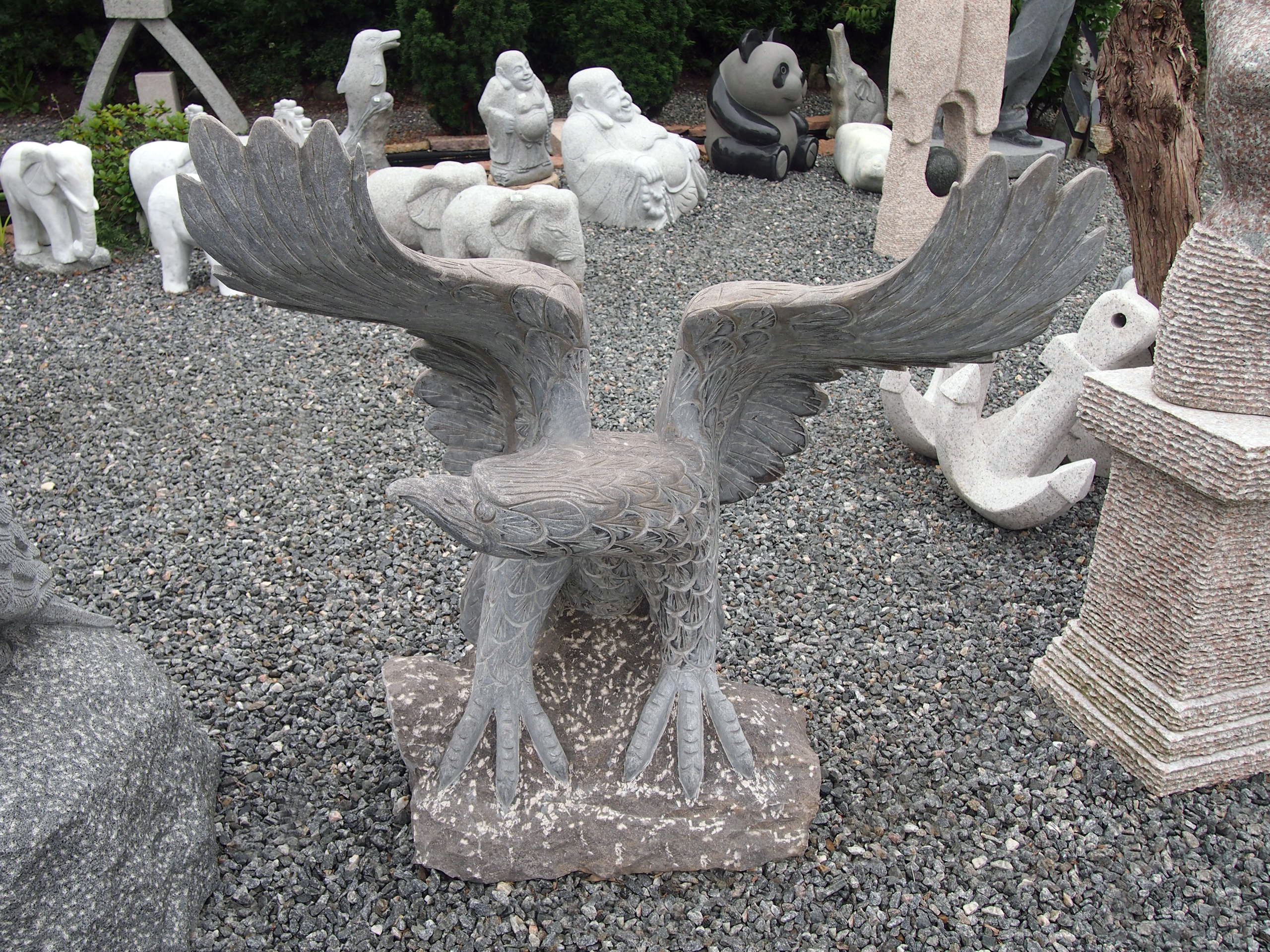 Ørn med spredte vinger på pedestal af rustik limestone. I modsætning til løven som er dyrenes konge, anses ørnen for at være himlenes konge. Ørnen har et stort vingefang og fremstår derfor somom den er på vej til at lette på jagt efter et bytte.
