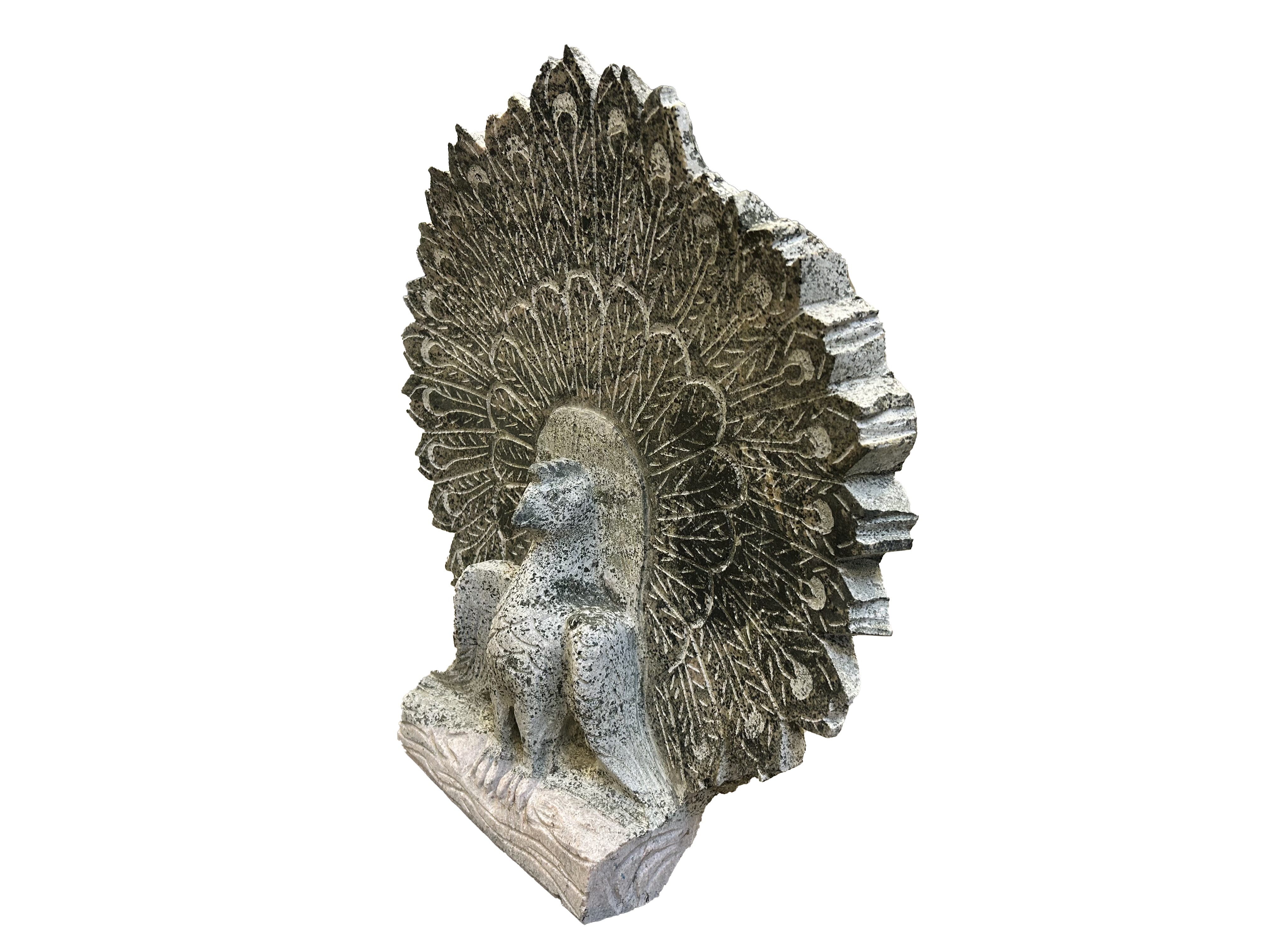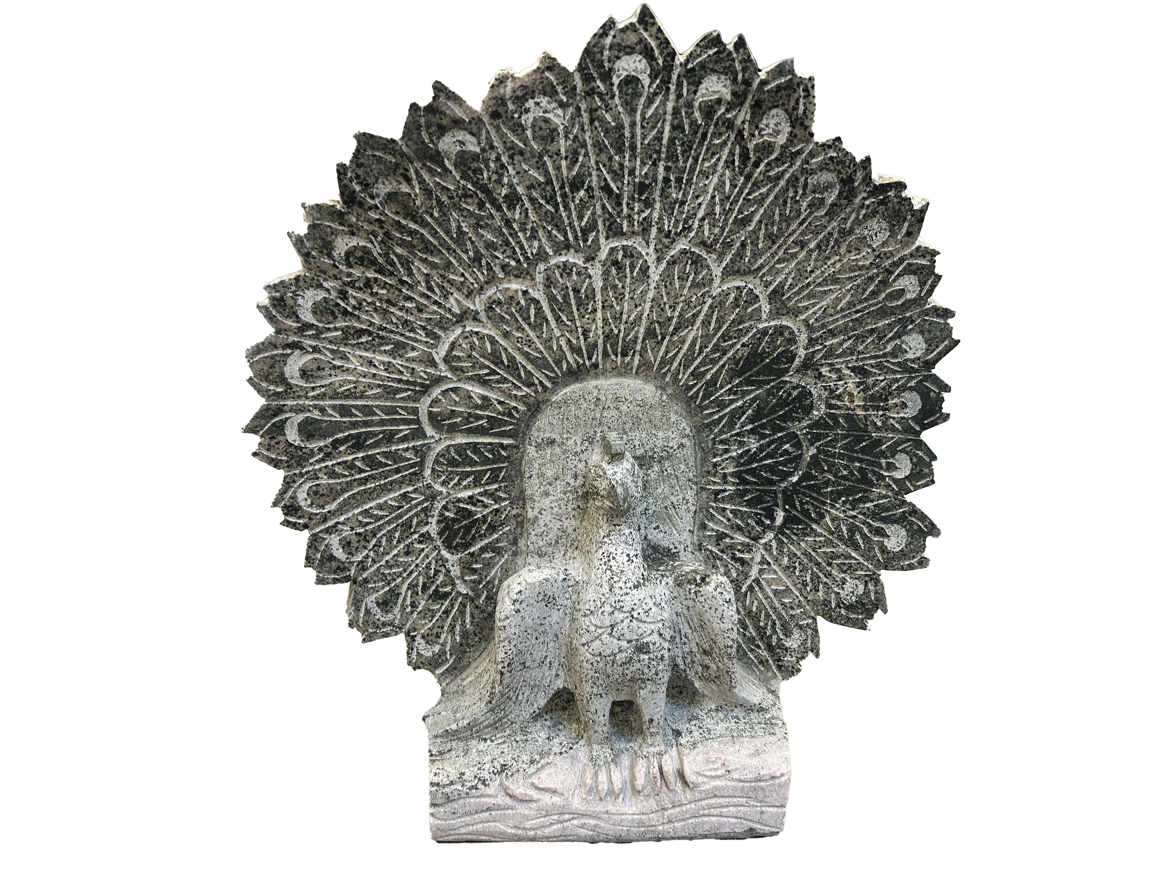 Påfugl i grønlig/rosa granit. Denne utroligt flotte og livagtige påfugl er en unika med de flotte kontraster i stenen. Det flotte farvespil mellem de grønlige og rosa farver viser blot et udpluk af påfuglen flotte fjerdragt.