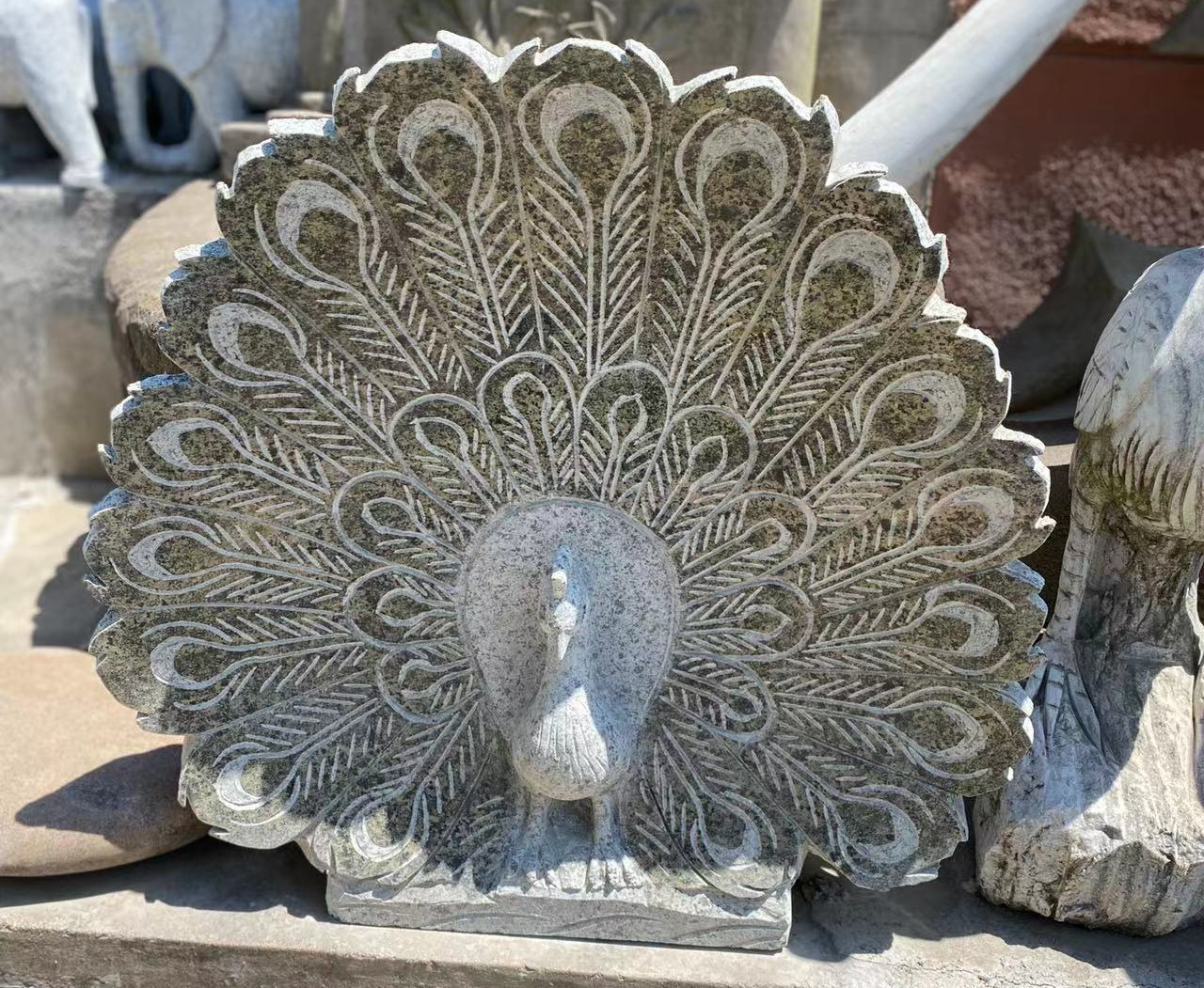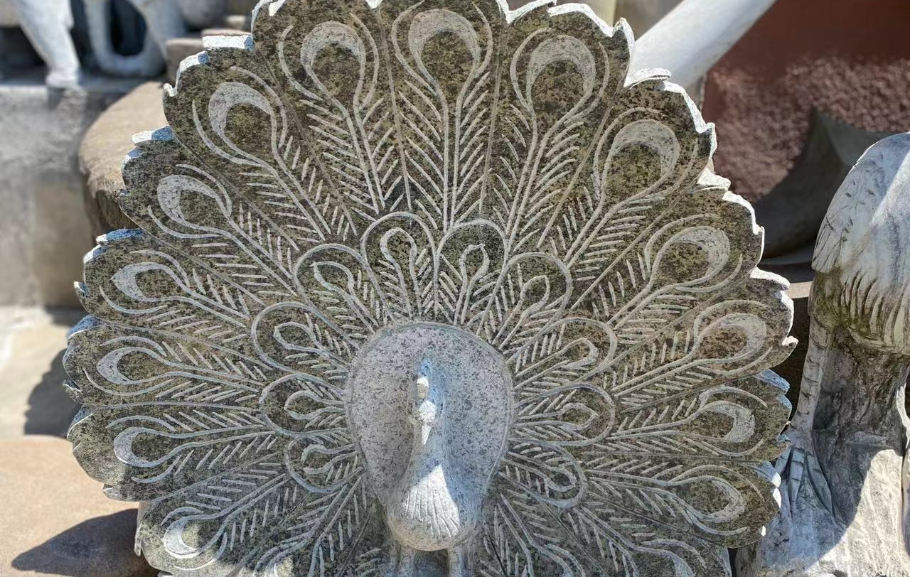 Påfugl udhugget i rødlig granit.