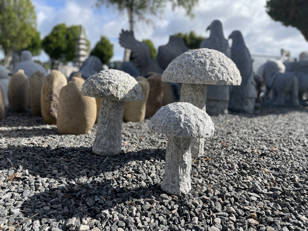 Paddehatte i grå granit i 3 forskellige højder. Toppen af paddehatten er løs, så den nemt kan tages af og flyttes. Det er selvfølgelig muligt at lime de to dele sammen med polymer lim, så paddehatten bliver stabil.