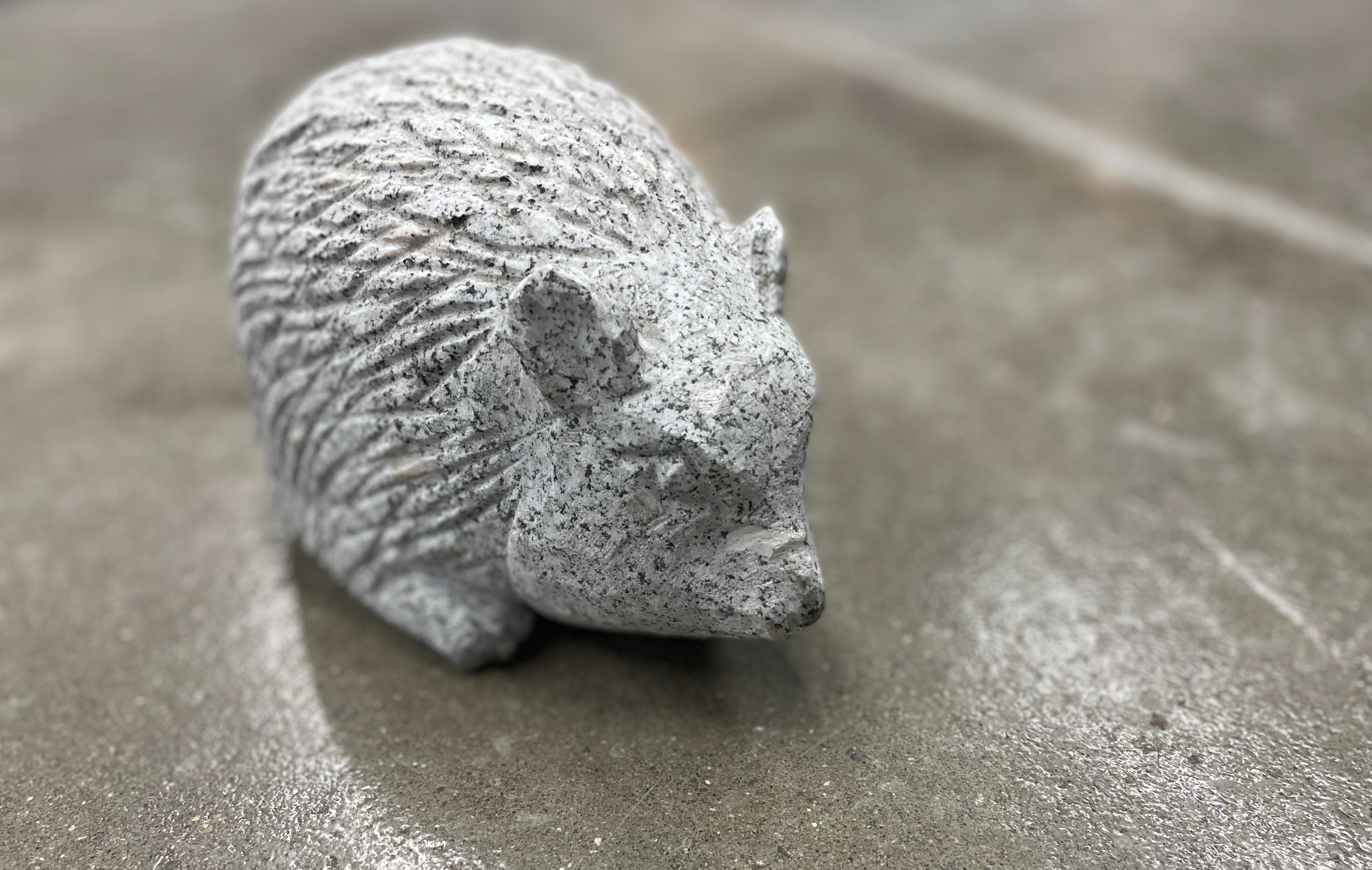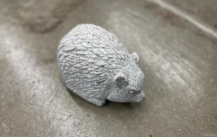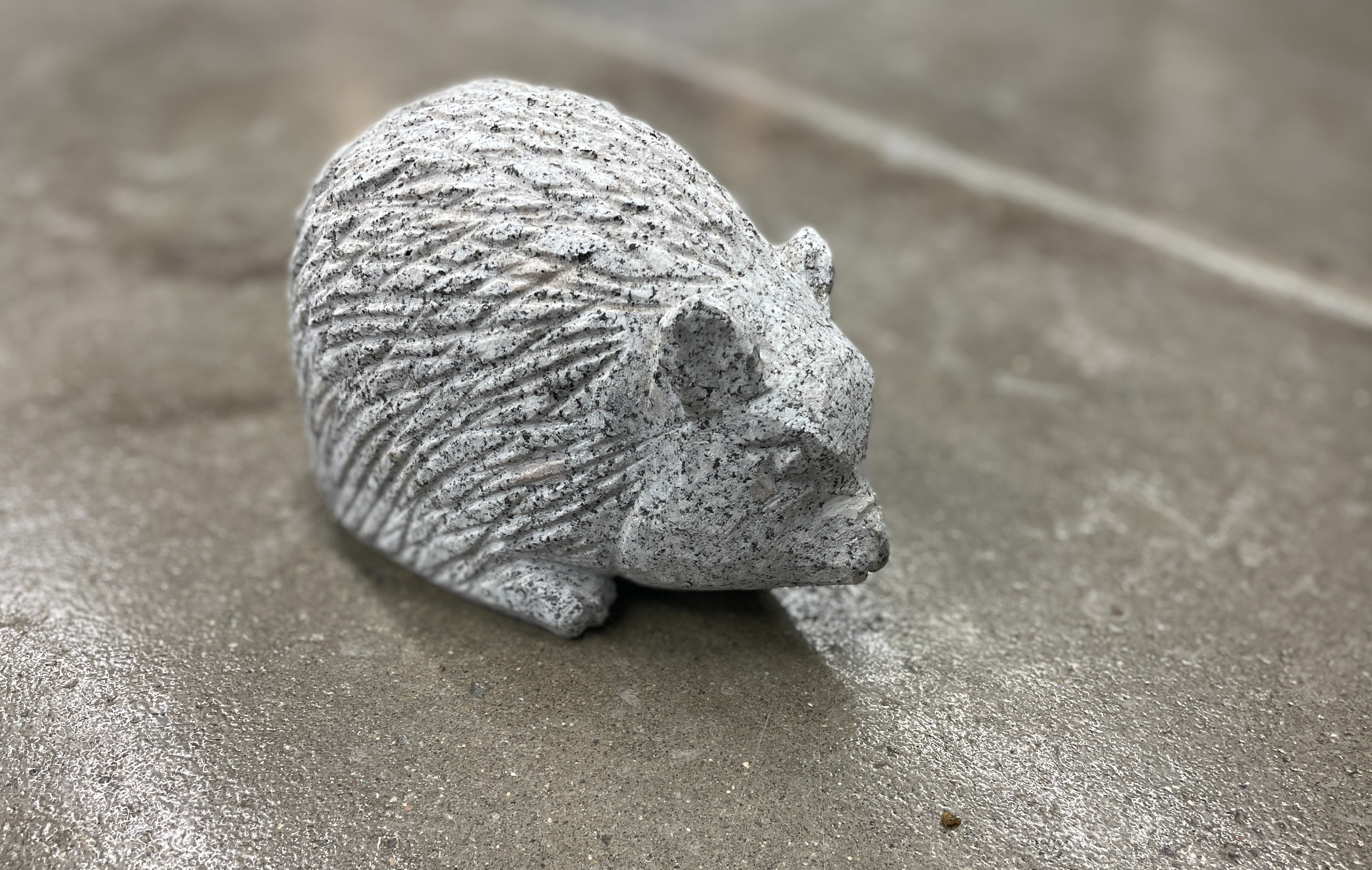 Lille pinsvin i lys grå granit med riller skåret i stenen, så de ligner pigge. Det lille pindsvin med det søde hoved passe perfekt i haven eller i hjemmet. Findes også i mørkegrå længde 25 cm
