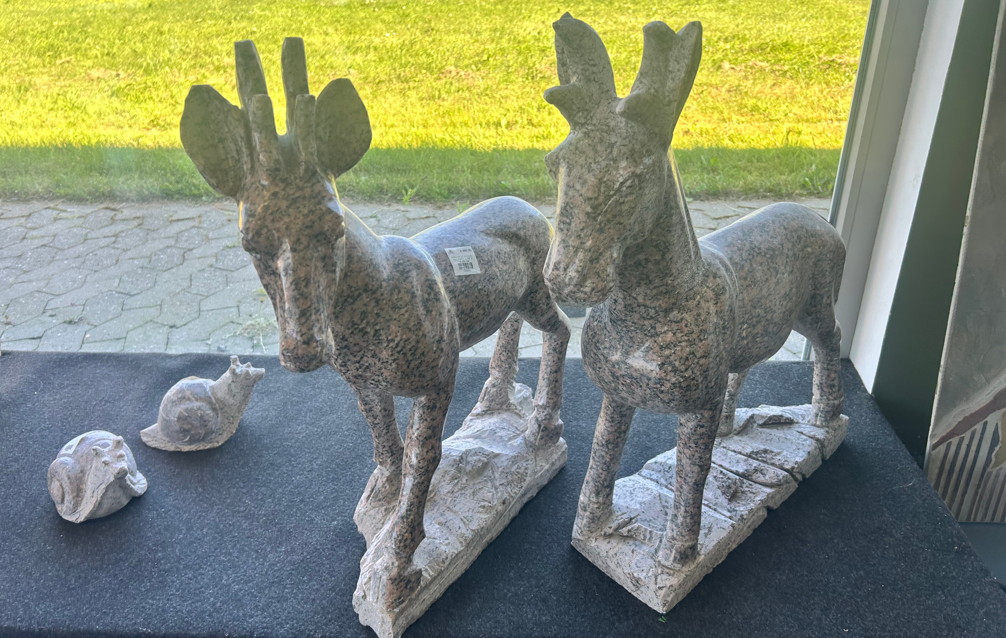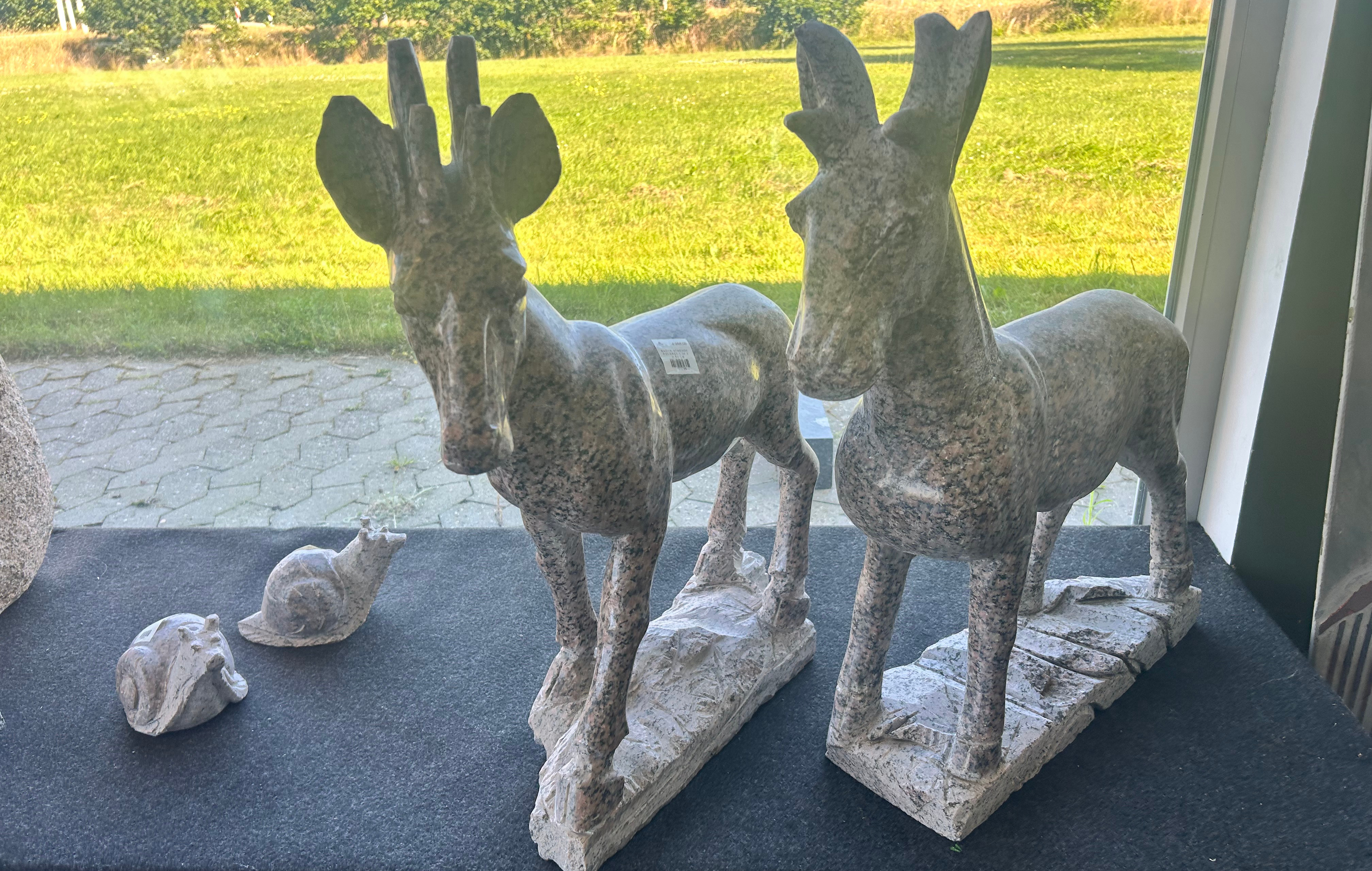 Rådyr stående i rød poleret granit med enten hoved ligefrem (til højre) eller drejet hoved (til venstre).