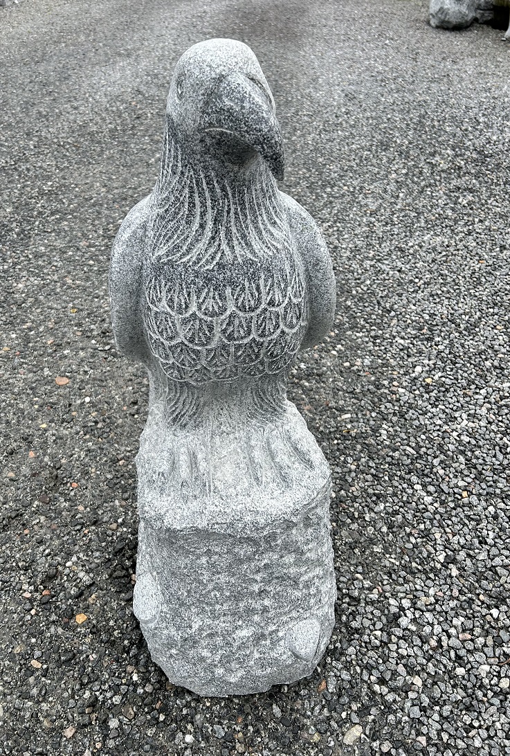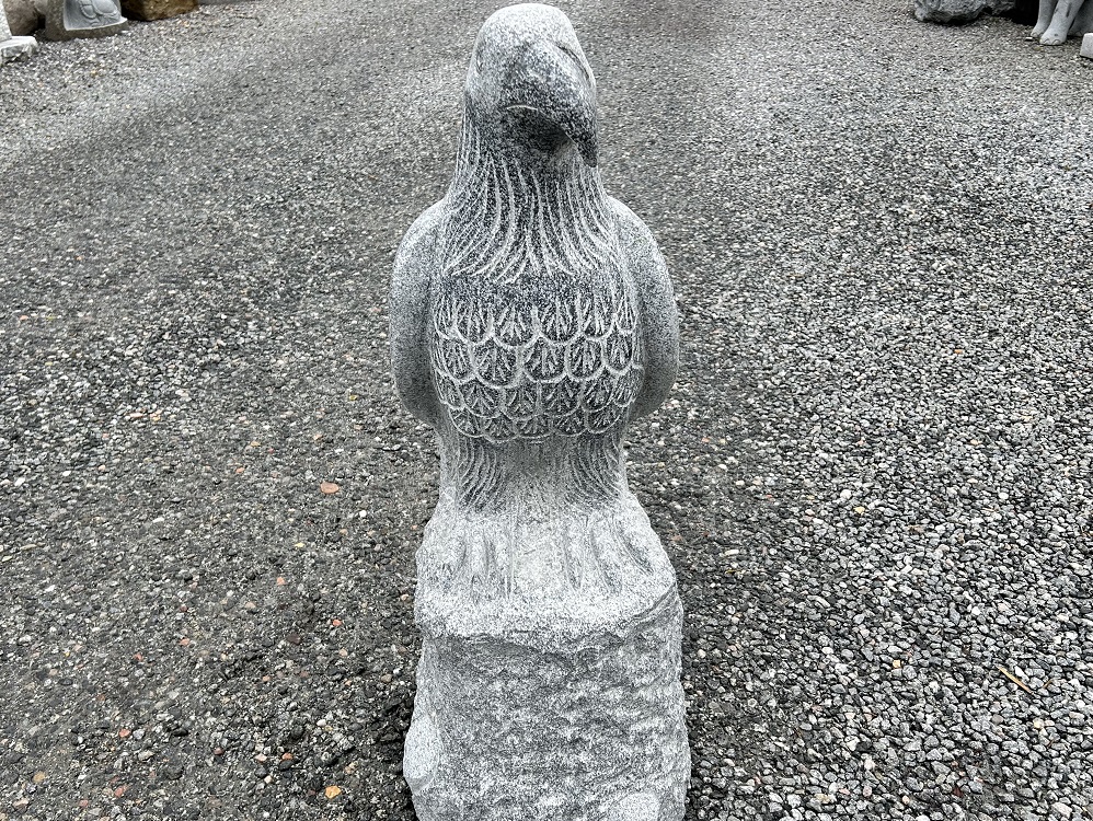 Gråsort poleret granit ørn på sokkel ud-i-et. Ørnen sidder med samlede vinger og holder øje med sine omgivelser. Fuglen er en dekorativ figur, som beskytter sine ejere. En ørn symboliserer magt og guddommelighed, og dette gør denne fugl i sandhed også. Fuglen hoved og næb er drejet, så den kan holde øje med sine omgivelser.
