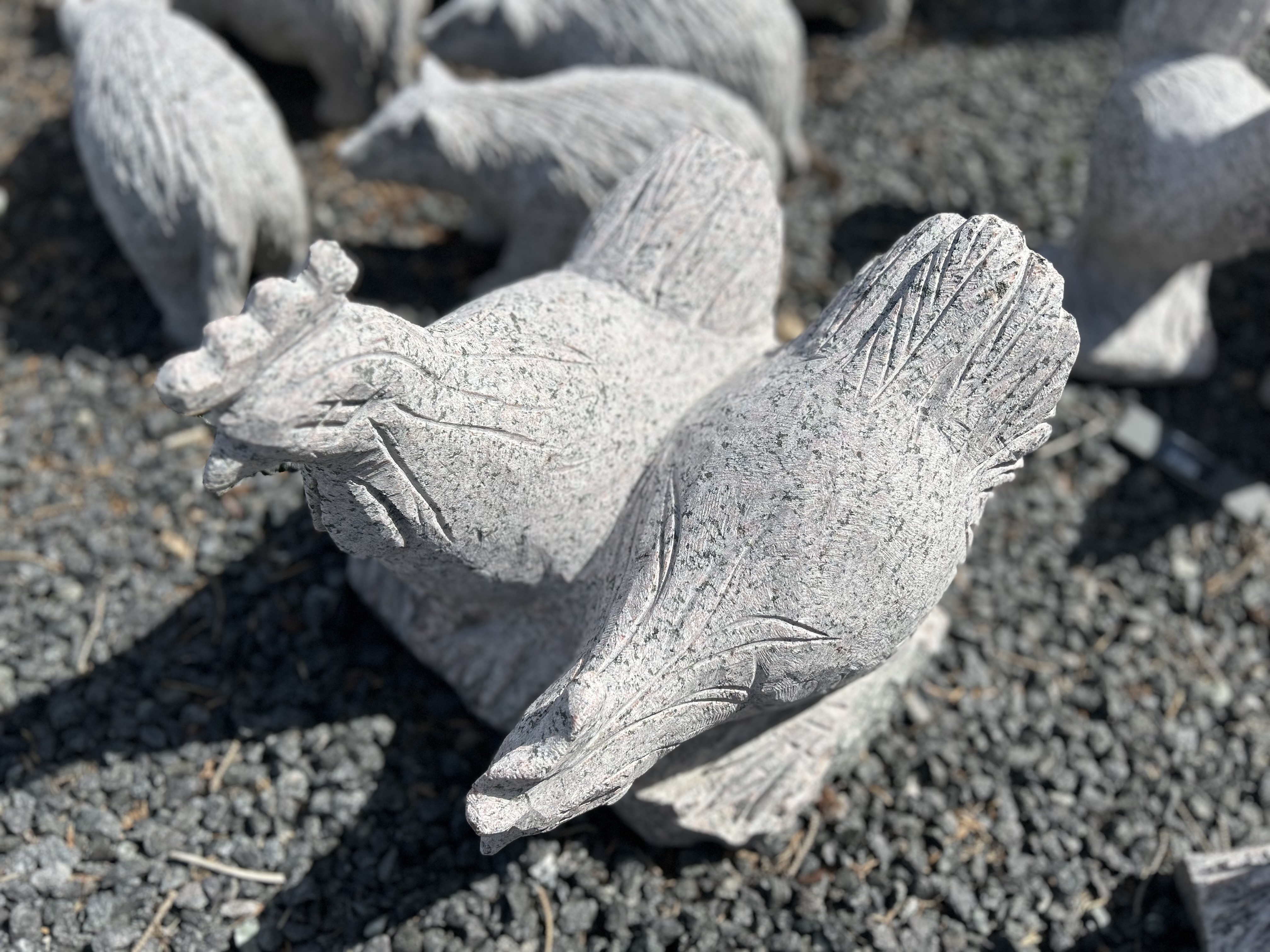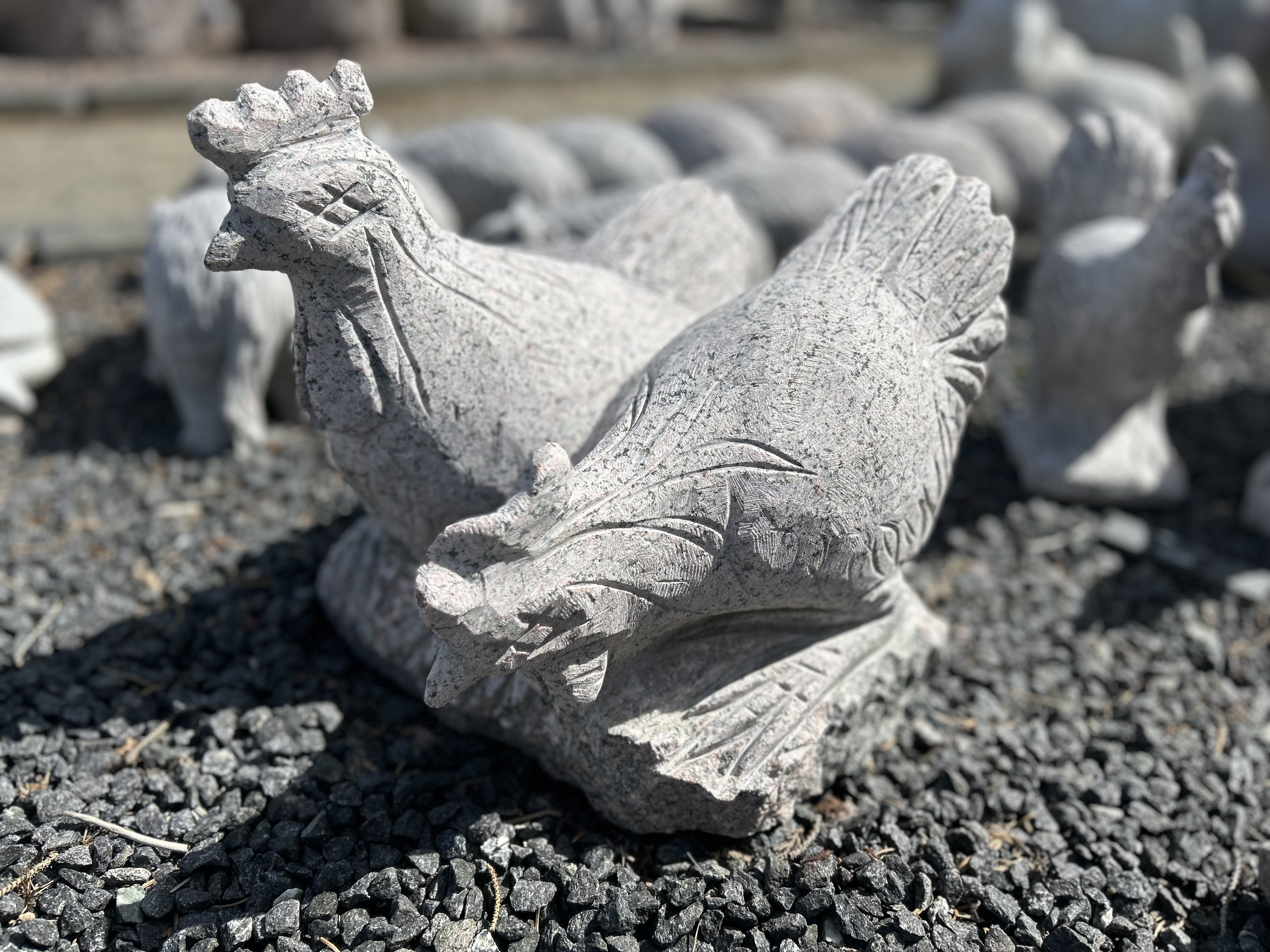 Hønsepar udformet i grå granit, stående helt tæt. Det hyggelige hønsepar er udformet så livagtigt, at man nærmest skal kigge to gange for at være sikker på at de ikke klukker. En rigtig sød stenfigur at have til at sprede hygge i haven eller på terrassen.