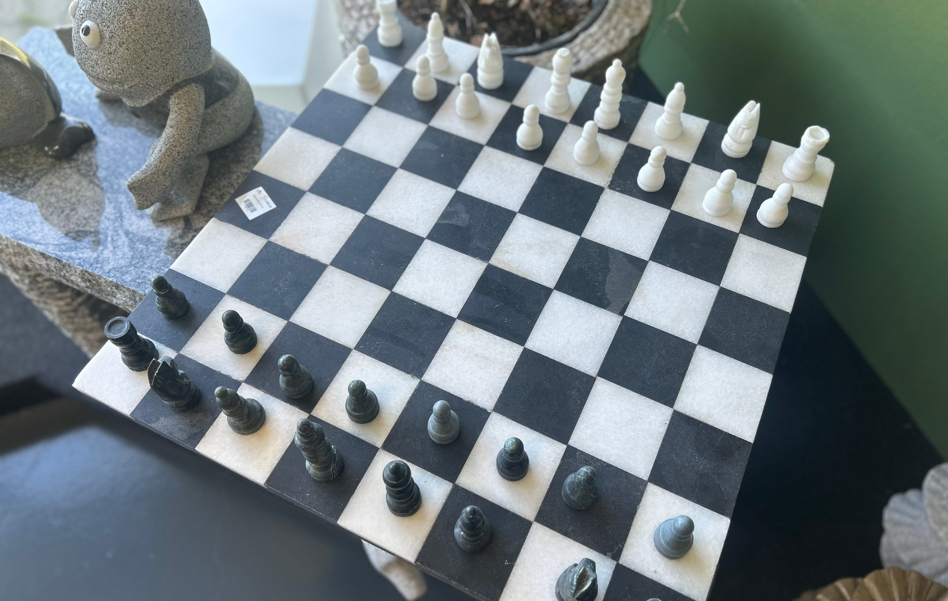 Skakspil i sort og hvid marmor med 32 brikker i samme materiale.
