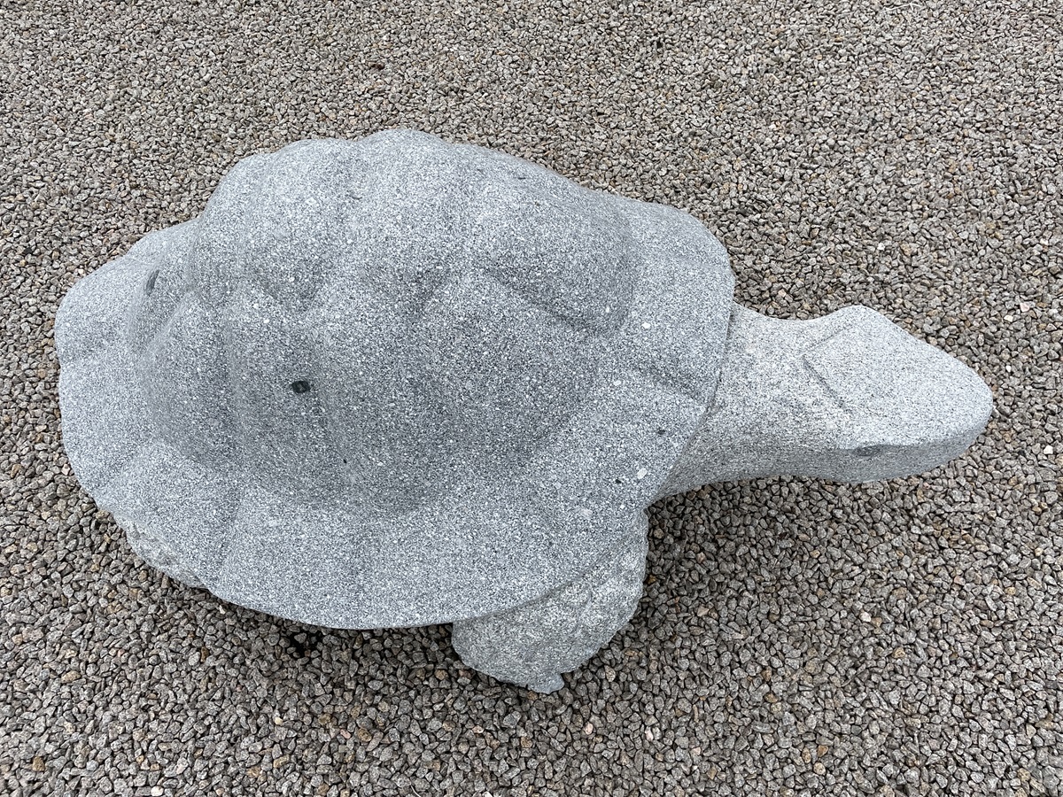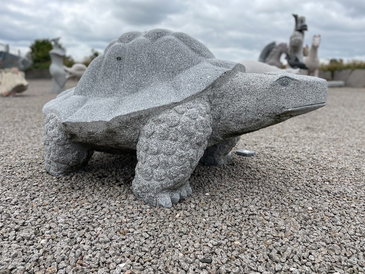 Grå granitfigur af skildpadde. Stor og imponerende skildpadde skulptur, lavet i grå granit. Med sine fine detaljer og robuste udtryk bringer den et tidsløst udtryk og ro til enhver have eller udendørs rum.