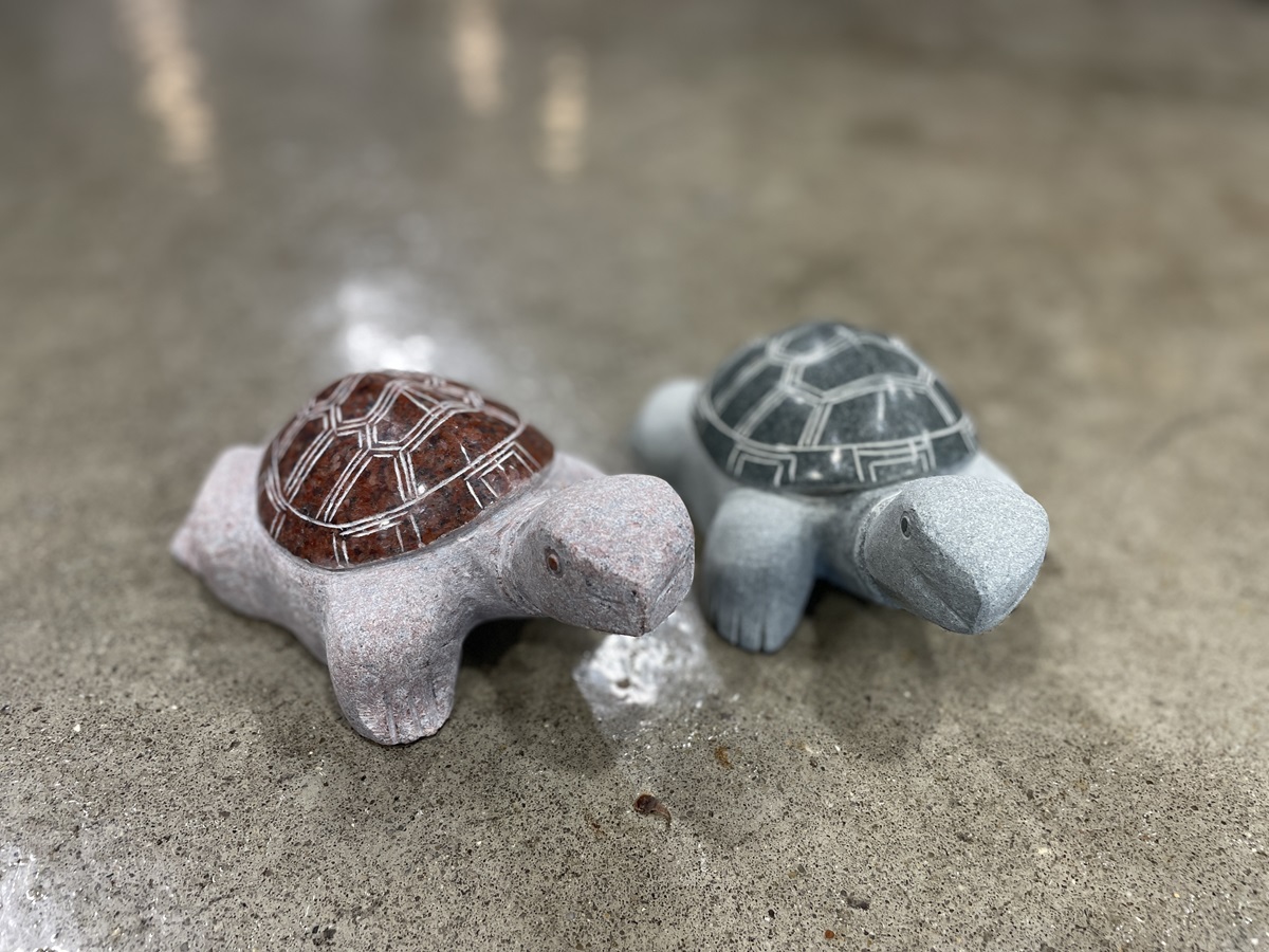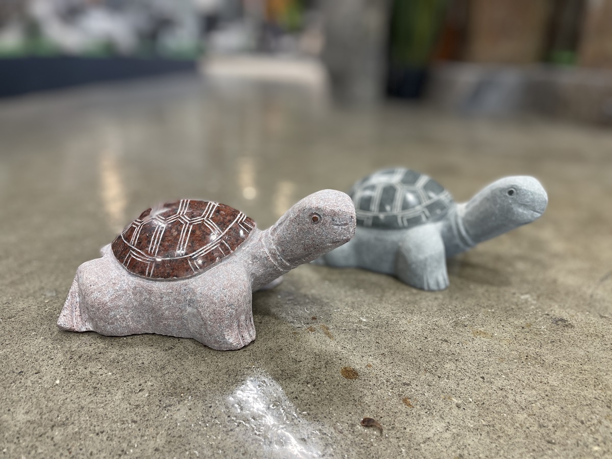 Sød granitskildpadde i rød eller grønlig farve med poleret og detaljeret skjold og øjne. Skildpadden kan være en sød detalje i blomsterkrukker/bede eller ved indgangen. Man kan med fordel stille to - en i hver farve - sammen for at skabe lidt kontrast og liv.