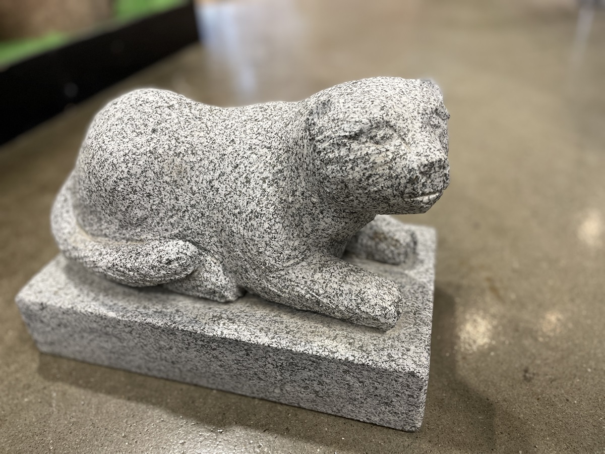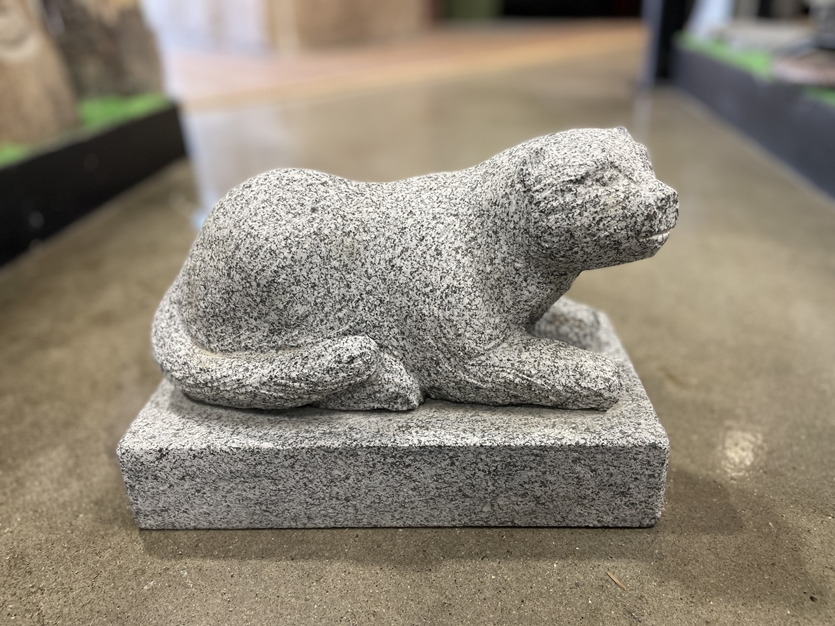 Granitfigur af en mink på sokkel udhugget i gråsort granit. Minken er udformet liggende på en sokkel med fine detaljer.