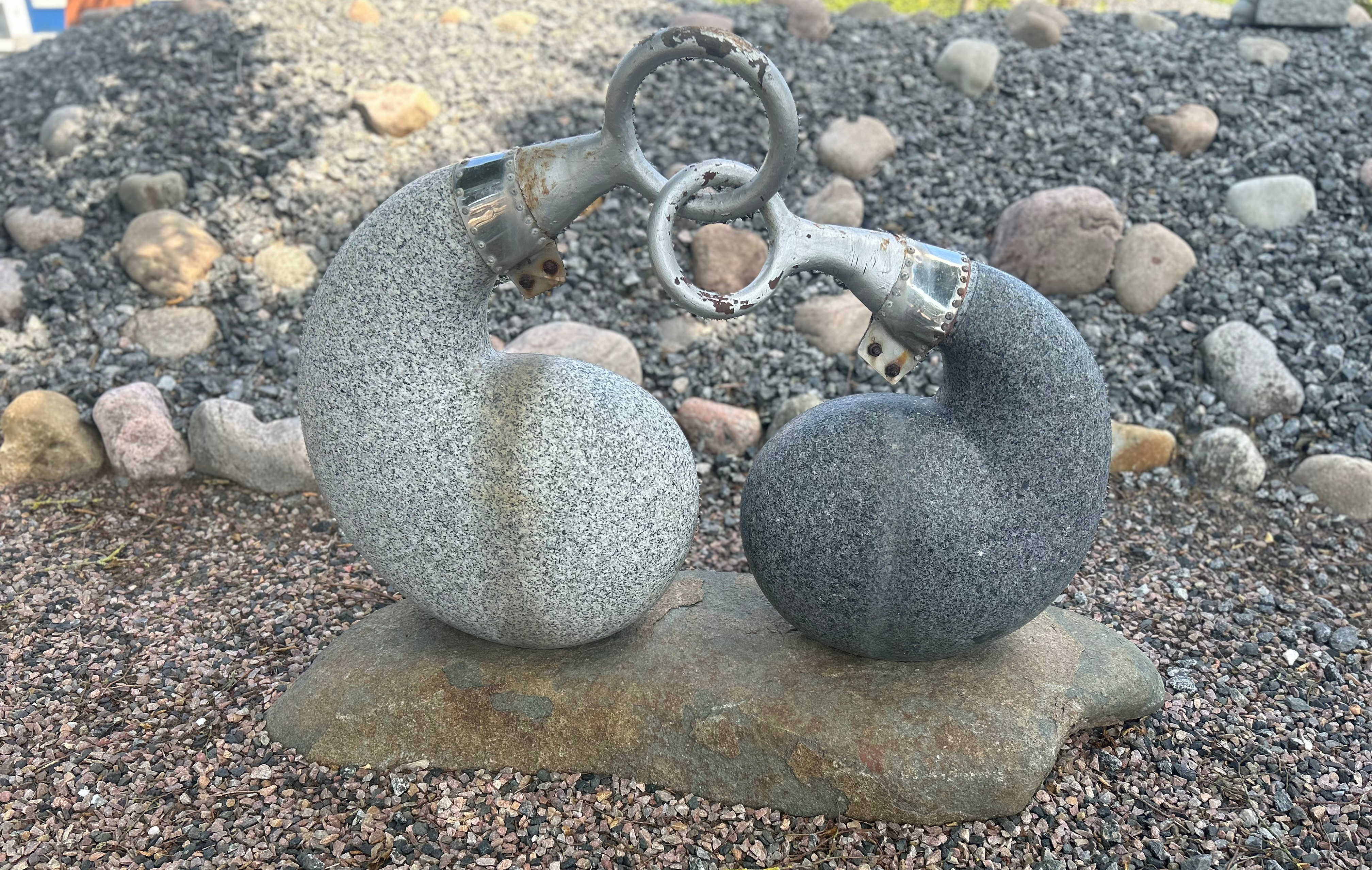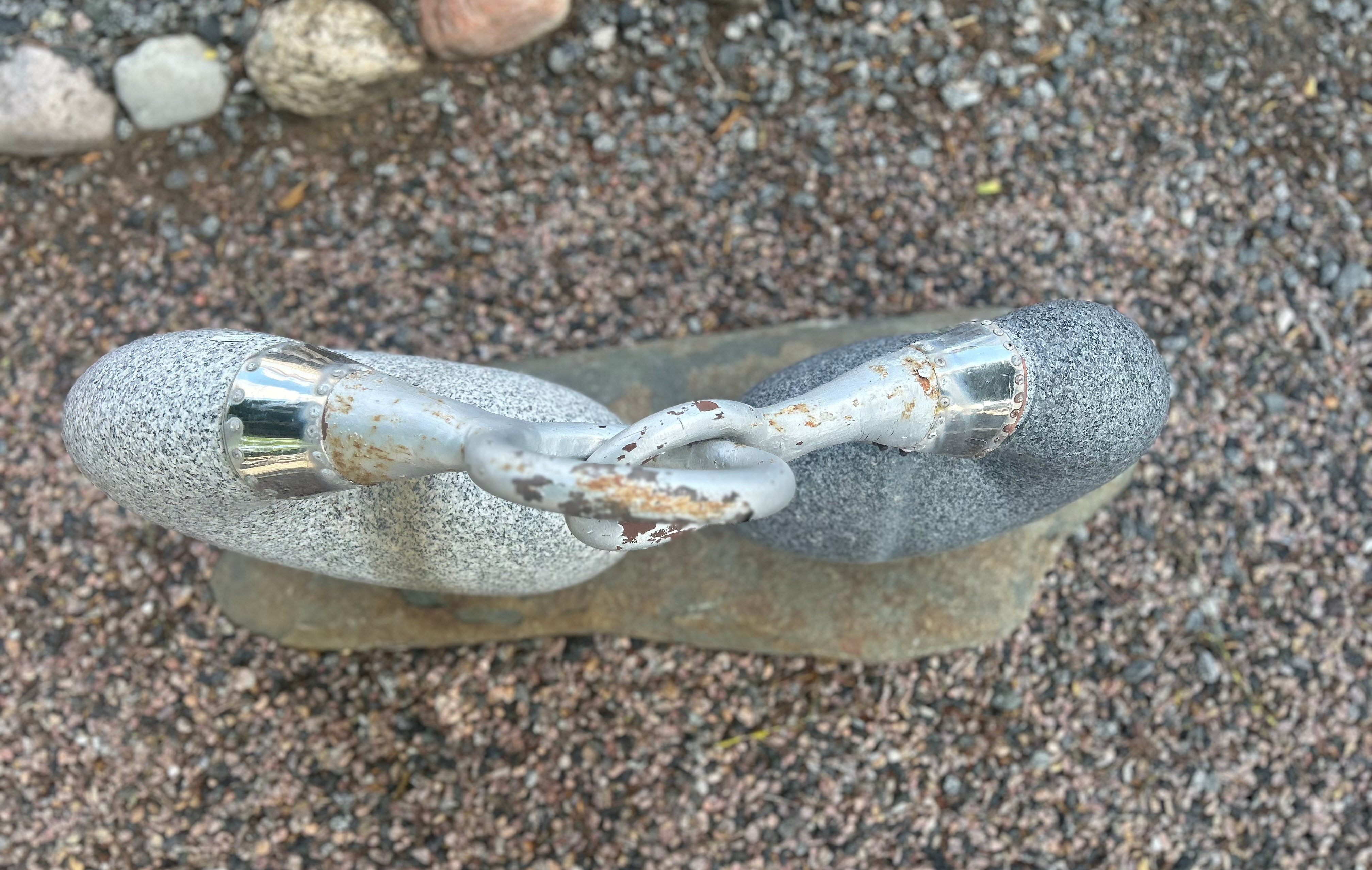 Skulptur sammenhæng i gråsort og lys grå granit som yin og yang. De er kædet sammen af jern løkker, som trænger til en gang maling. Den samlede skulptur står på en sokkel i brunlig natursten.