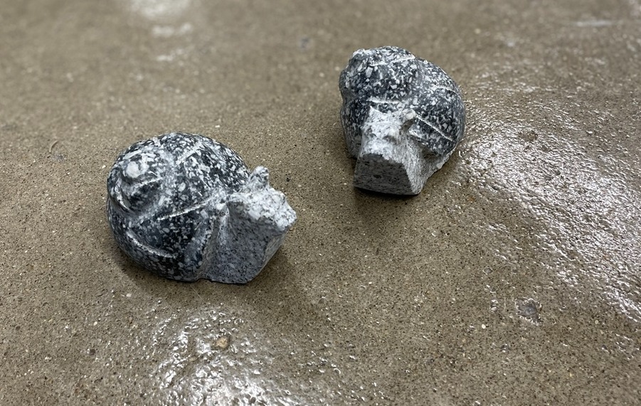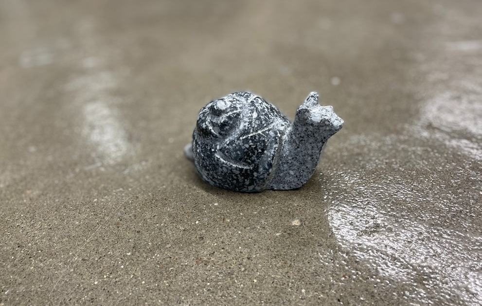 Sneglens hus er poleret, så der er kontrast mellem snegl og hus. Denne lille fætter er perfekt i et bed eller ved fuglebadet.