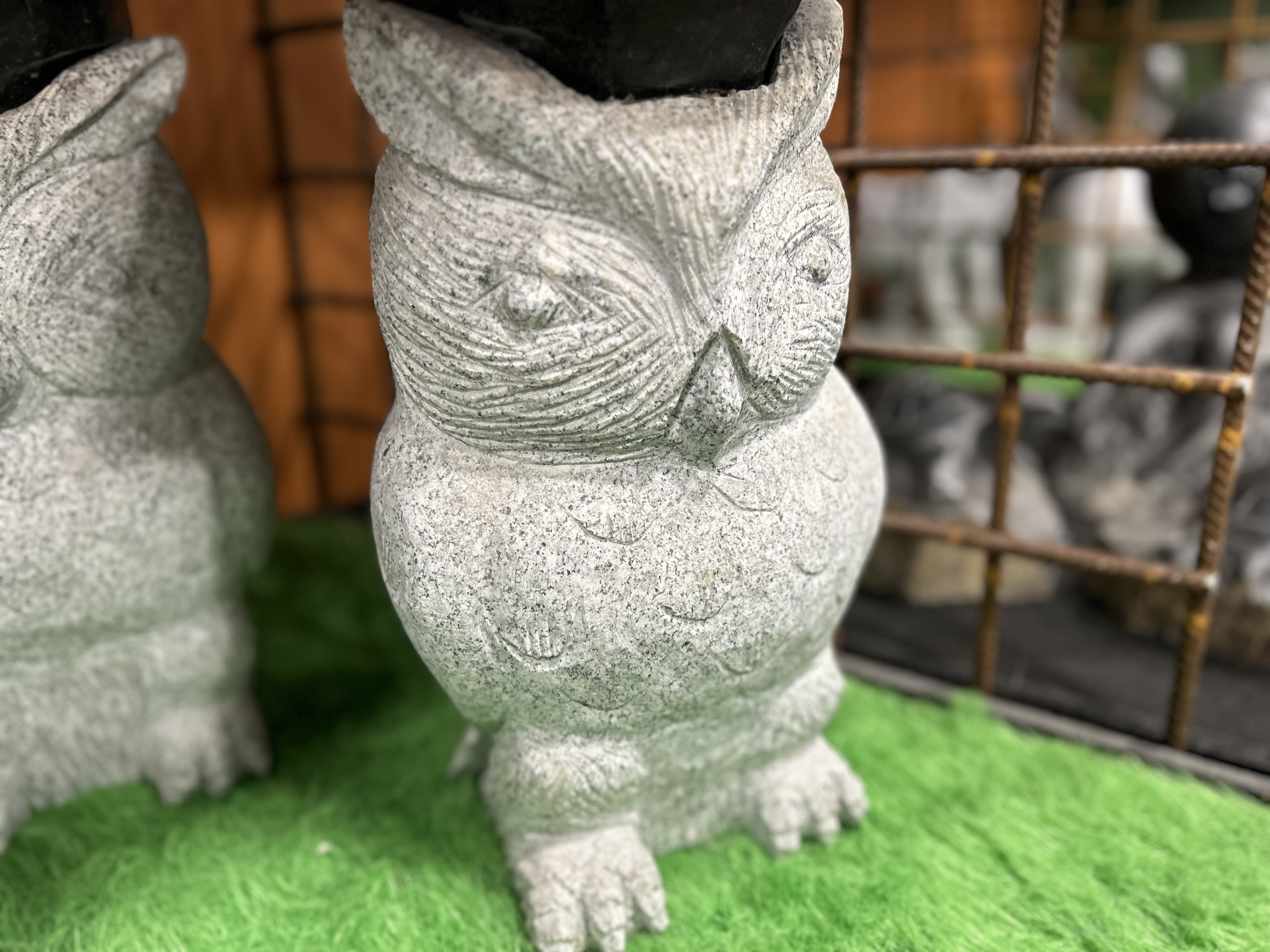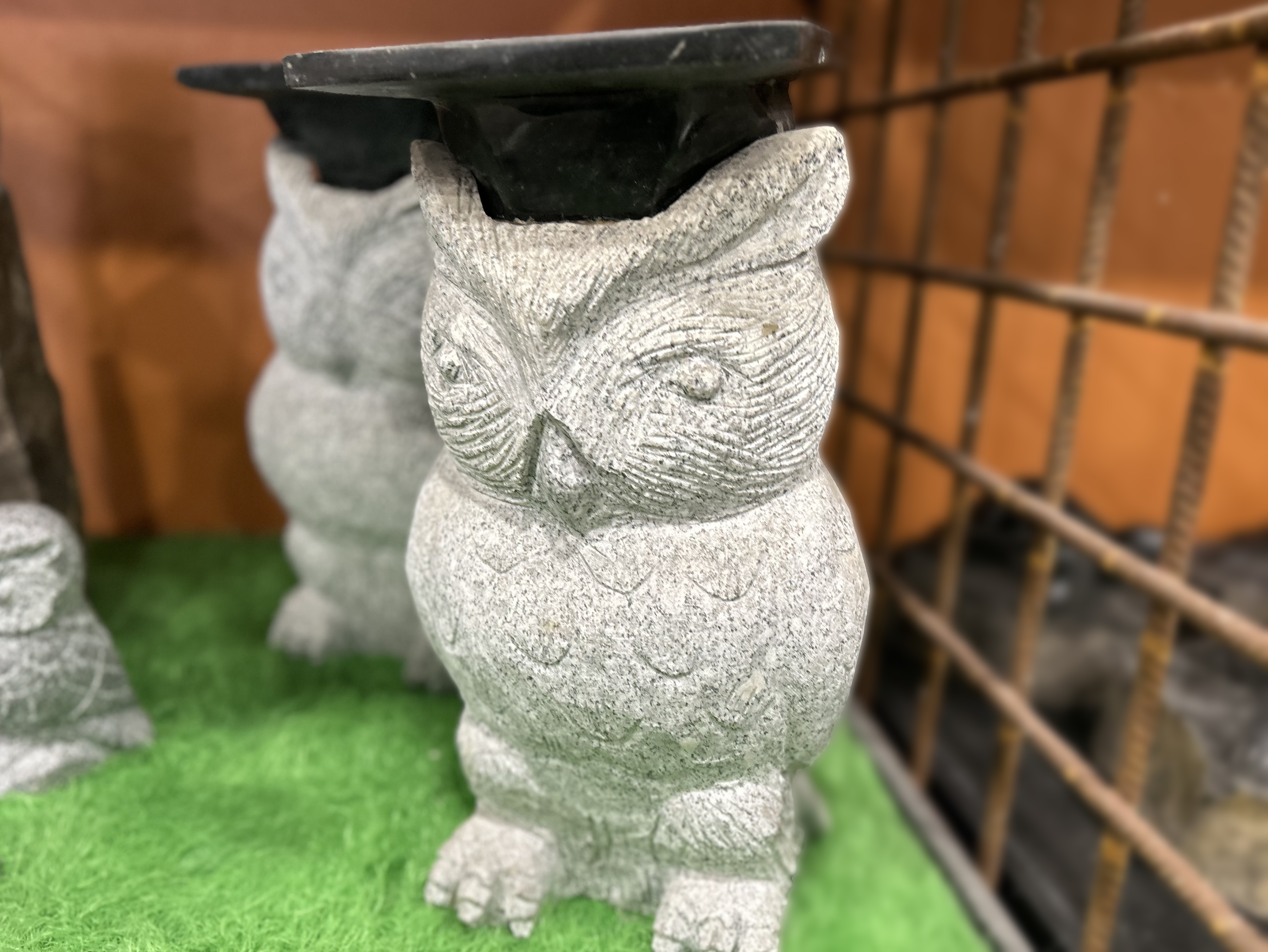 Ugle i lys grå granit med sort kandidathue.