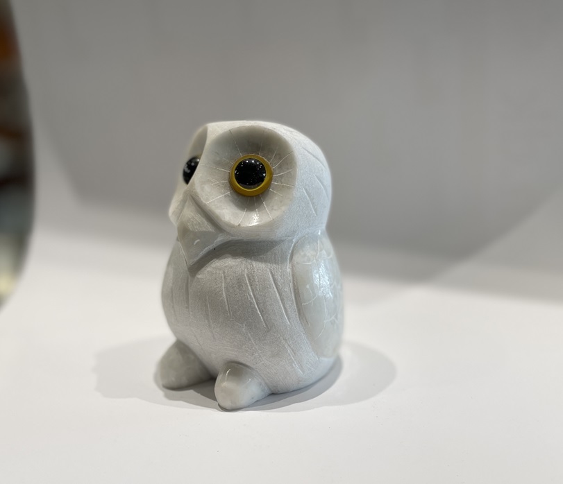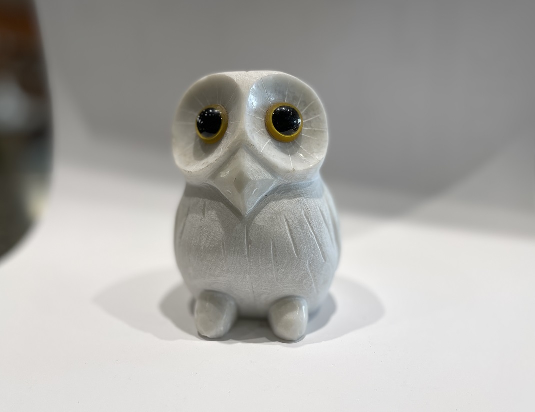 Sød ugle lavet i hvidt marmor, som står på fødder og har fine polerede detaljer. Uglen har mørkegule øjne, som er limet på - de skaber dybde og bryder med den hvide farve.