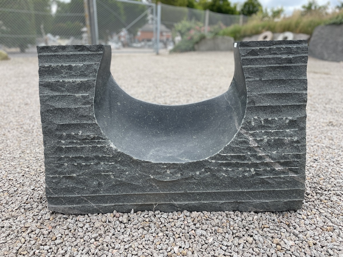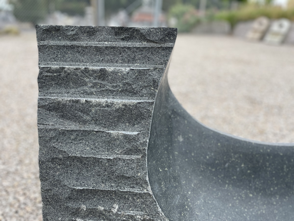 Denne smukke og skulpturelle figur er lavet af sort granit. Den har et poleret "sæde" og en rå, kantet yderside, der nærmest indbyder til at tage plads og nyde øjeblikket - dog er dette ikke en bænk.