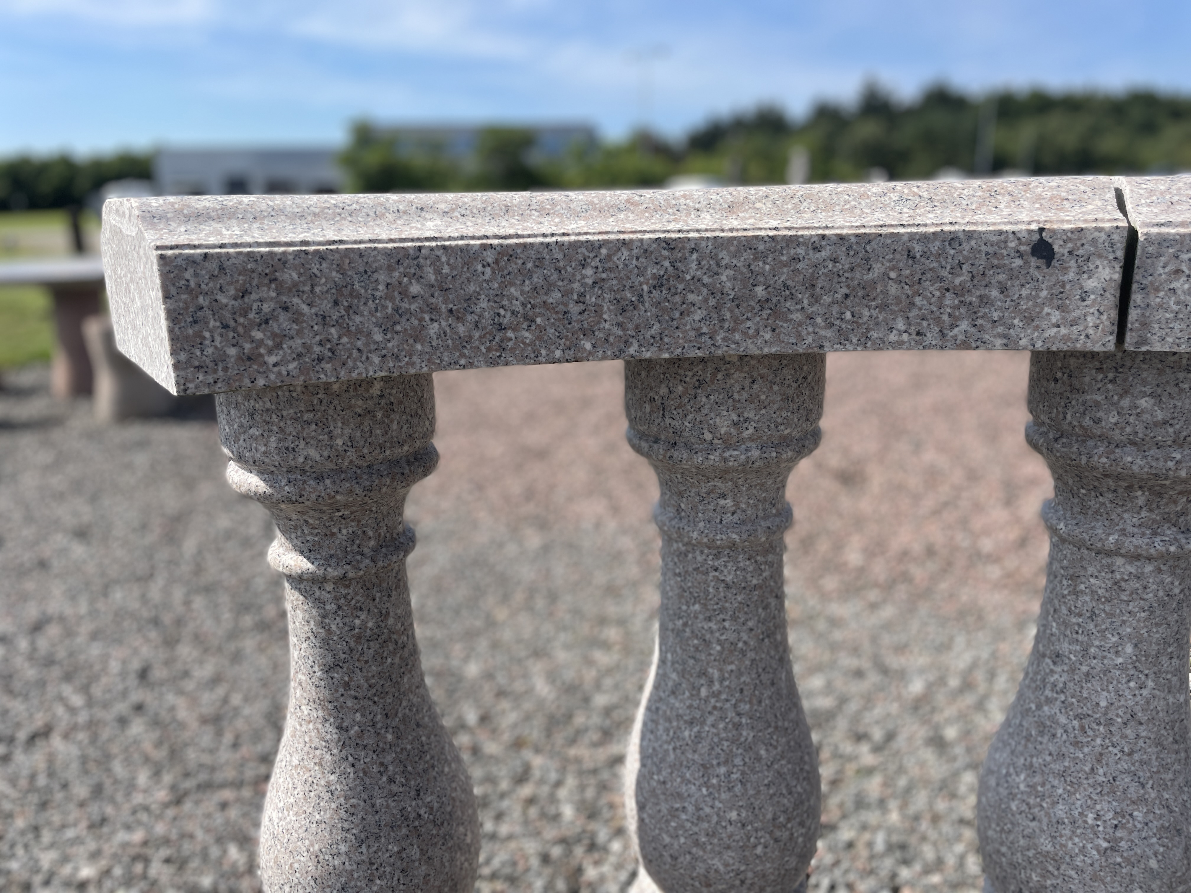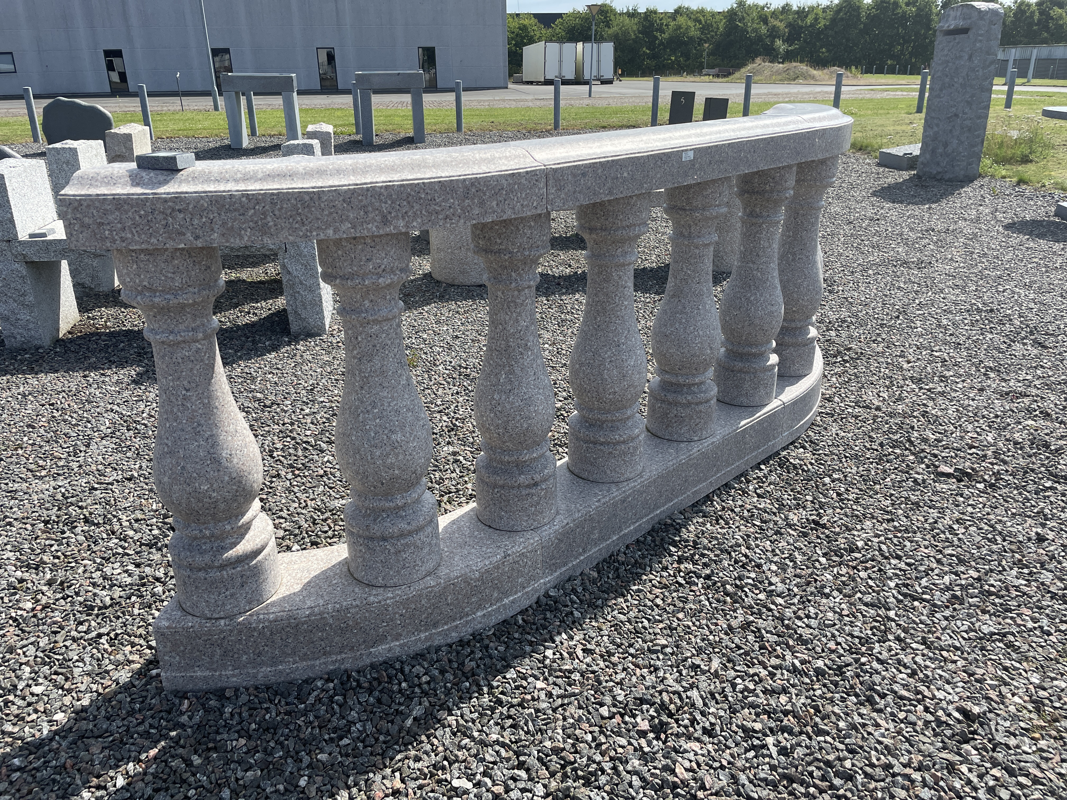 Balyster 3-dele i rosa poleret granit. Sætter består af en lige del og to dele som drejer. Samlet mål er ca. 239 x H 93 x 24 cm. De buede stykker har en længde på ca. 70 cm mens det lige stykke måler ca. 99 cm