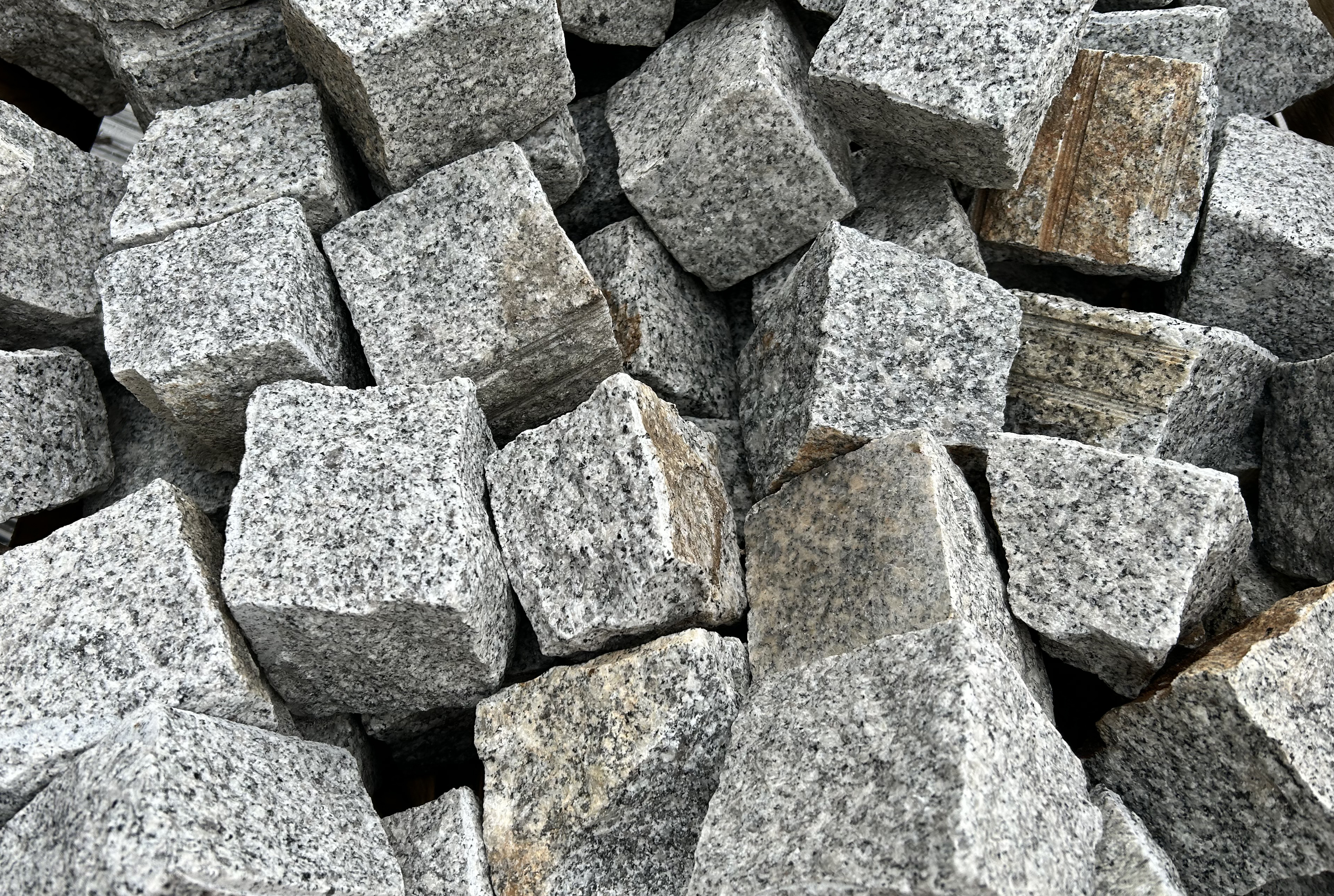 Chaussesten i lysegrå granit i flere grålige forskellige nuancer.