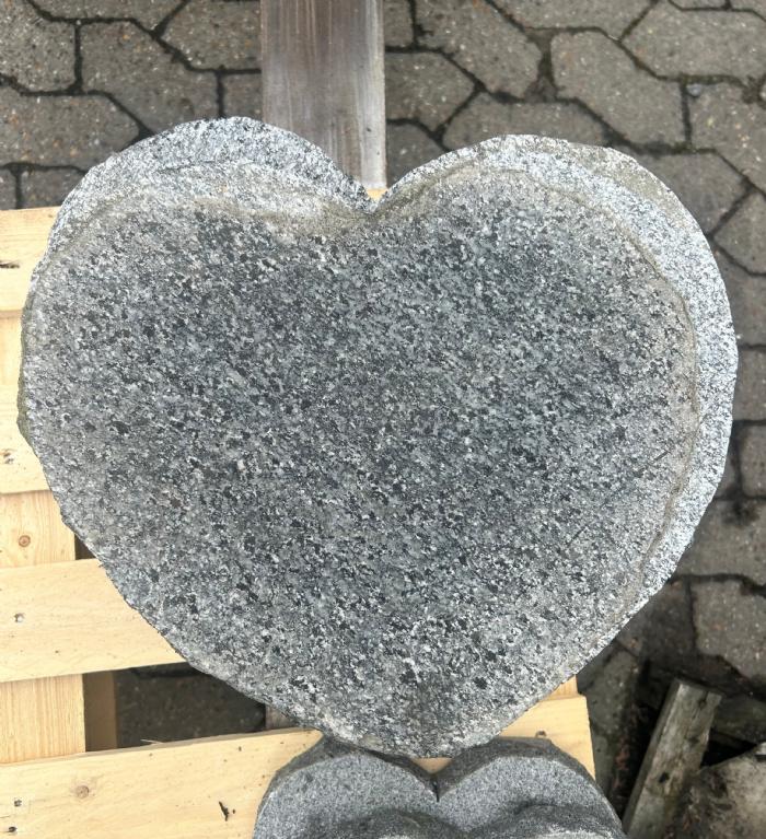 Trædesten i gråsort granit - trædestenen har form som et hjerte. Dem er velegnet som dekorationselement i et havebed eller ved et grav-/mindested.