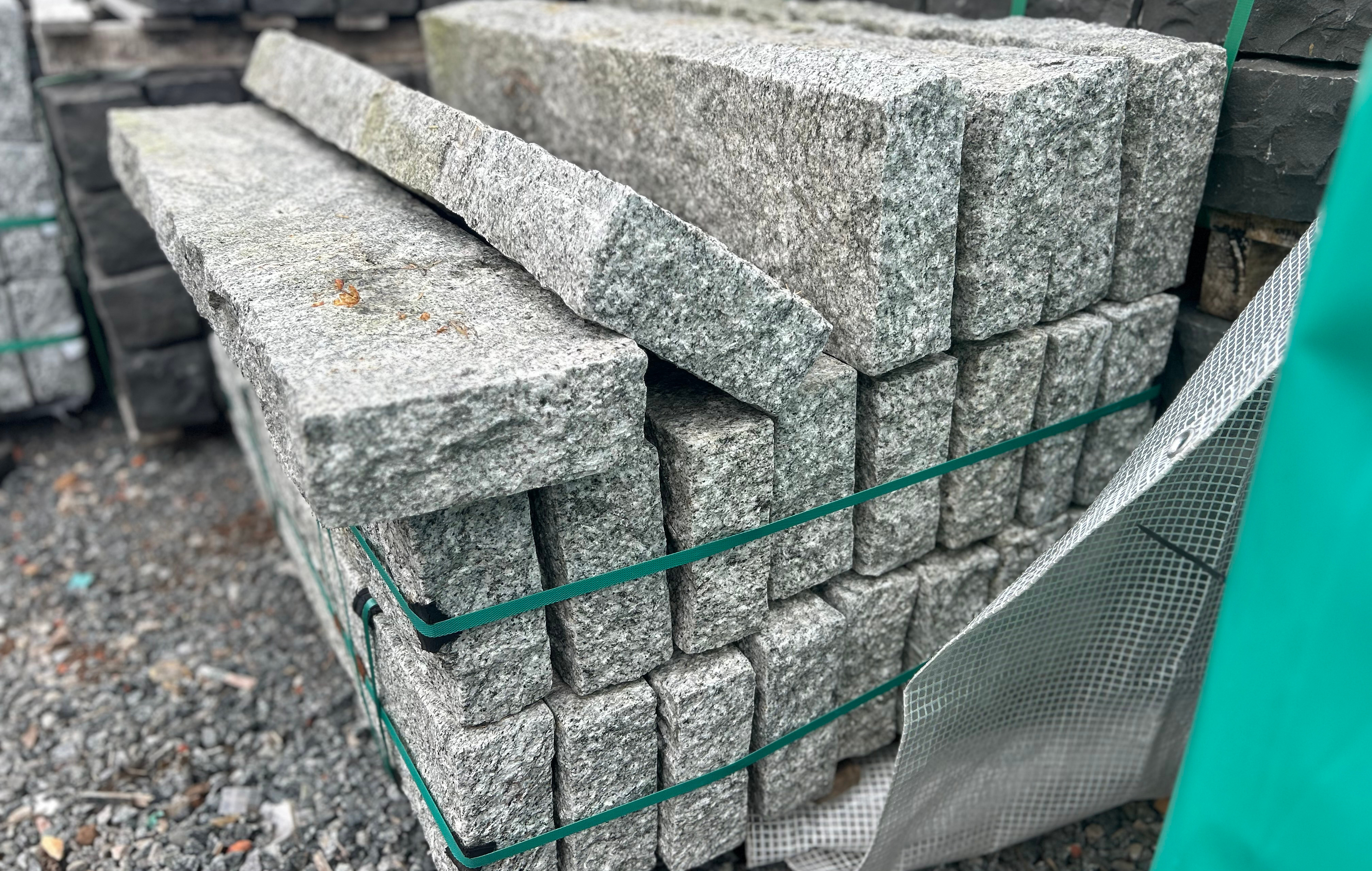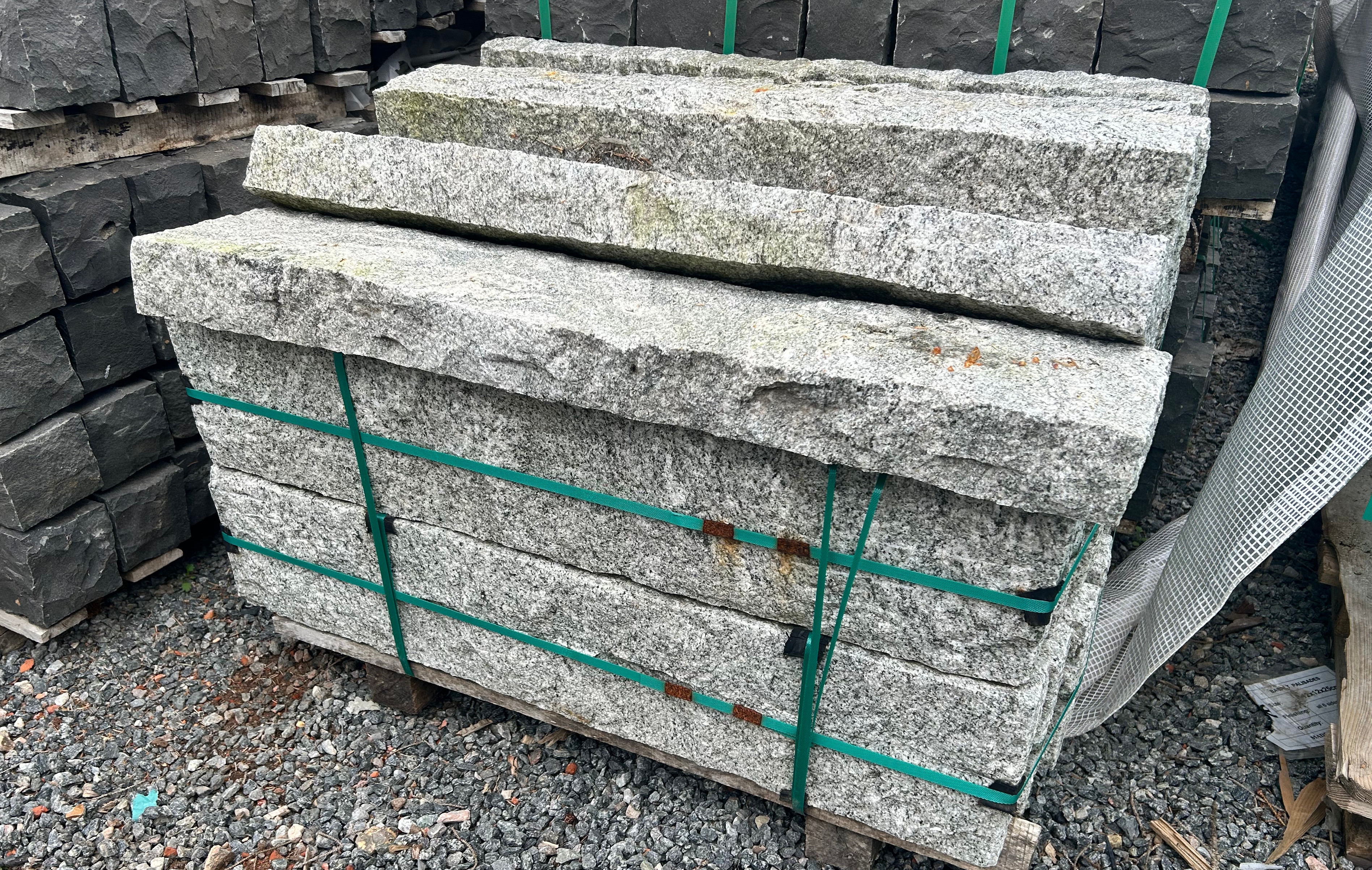 Bunden på kantstenene, der er beregnet til nedgravning, har grovere struktur end top og front.