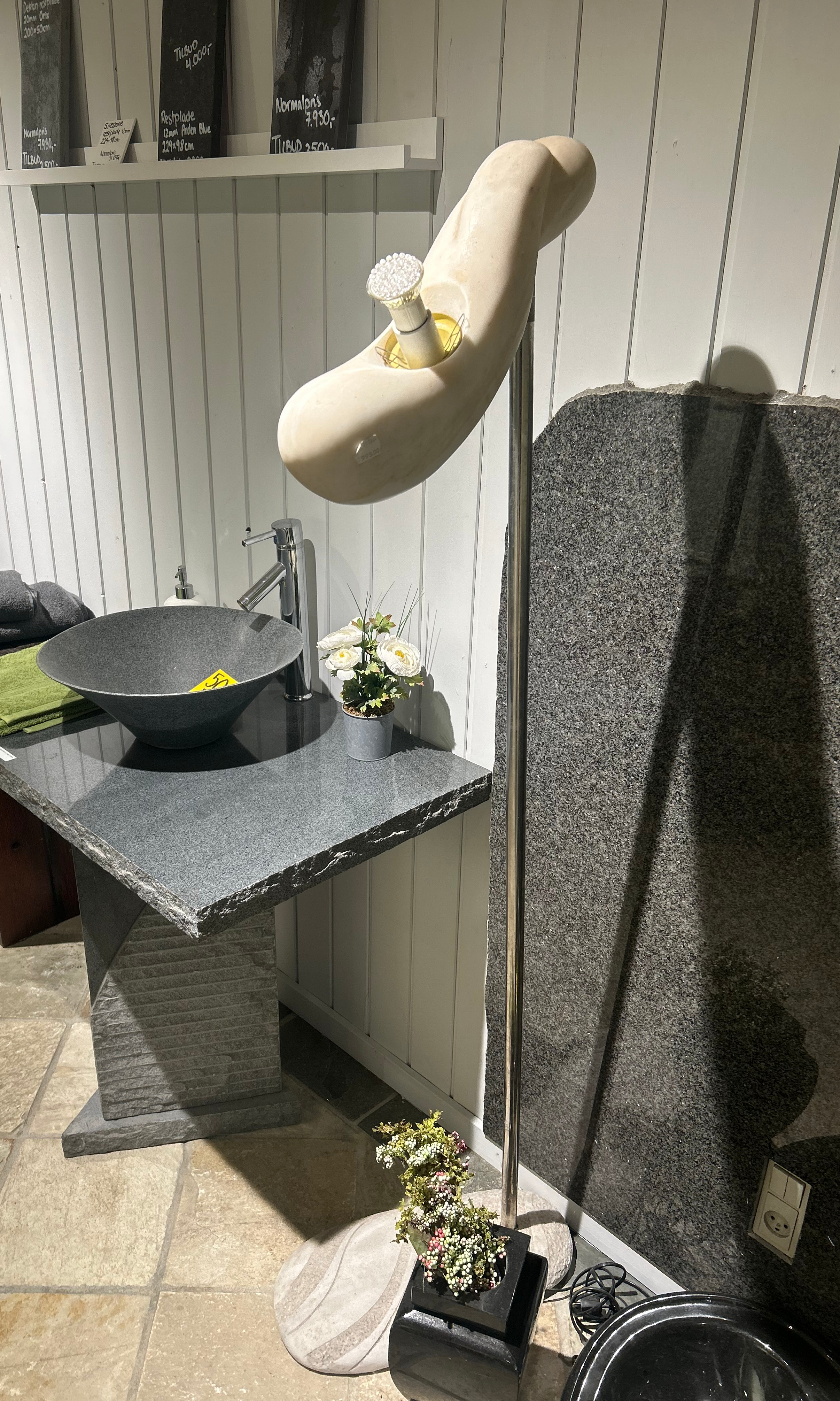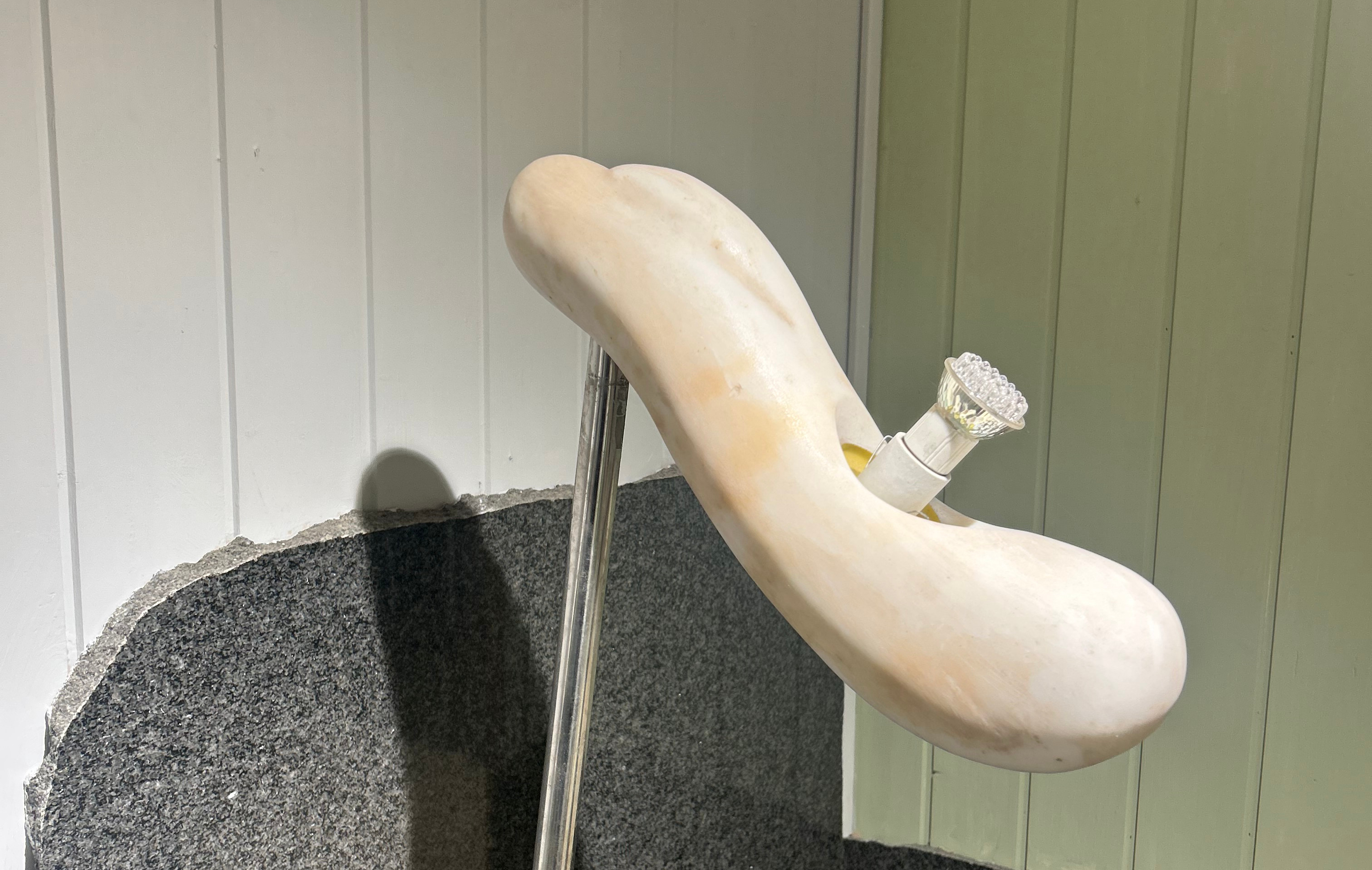 Lampe i hvid marmor som kommer i tre dele. Toppen med fatningen, stangen og foden kommer adskilt for at sikre under transport.