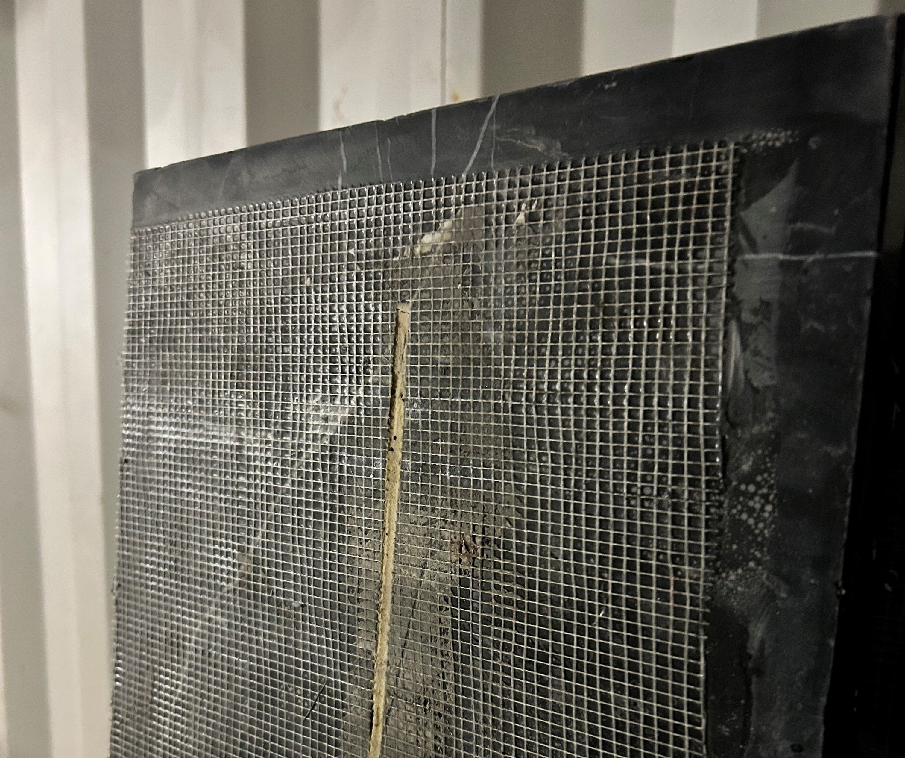 Vindueskarme i den smukke Nero Marquina marmor. Bundstykkerne har ilagt metalforstærkning og plast-net på undersiden, og kan derfor ikke afkortes ret meget, hvis begge ender skal være synlige efter montering. Metalstangen sidder cirka midt på undersiden, så der kan godt være ca 10 cm poleret/synlig ende på den færdige vinduesplade.