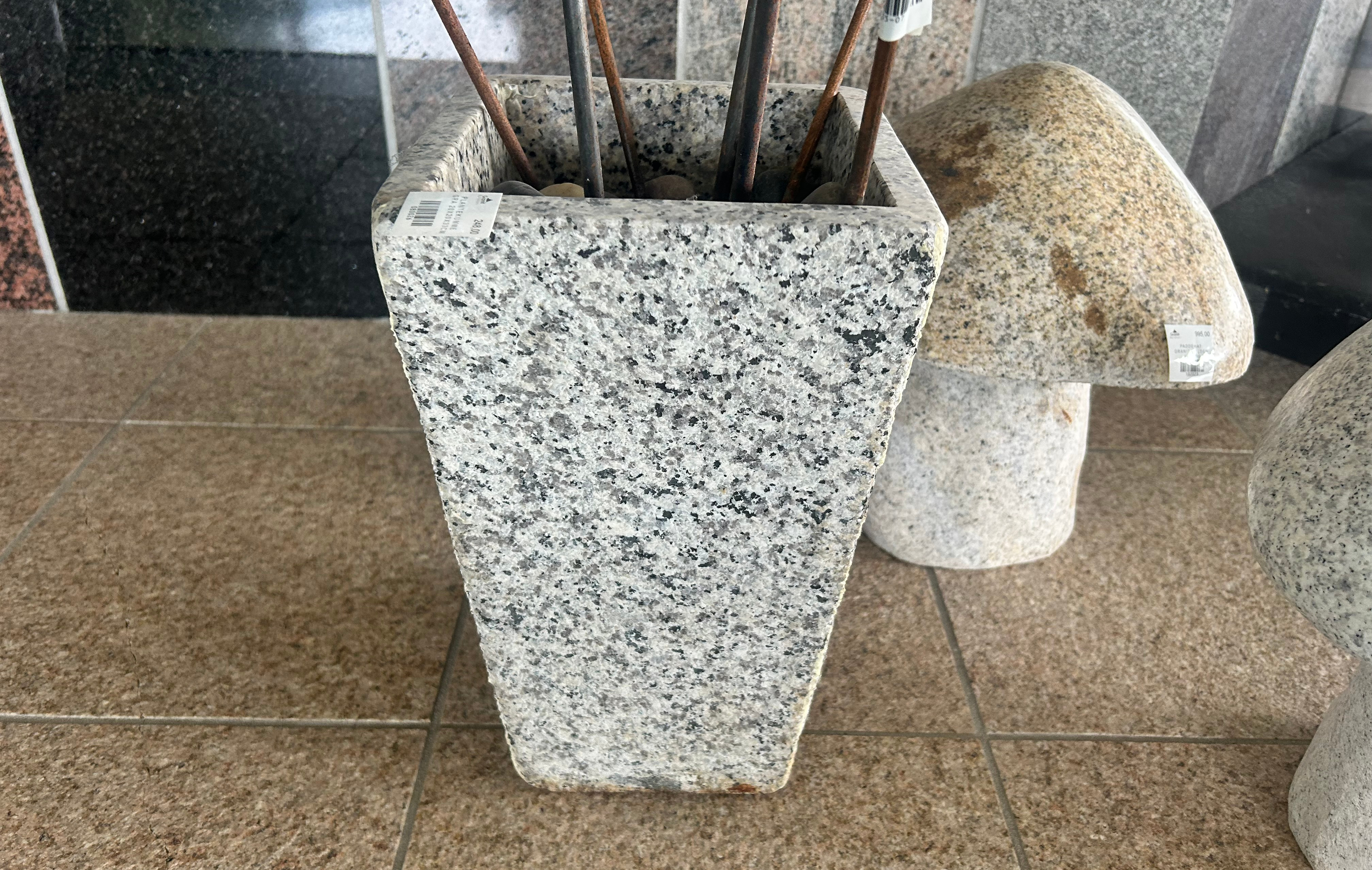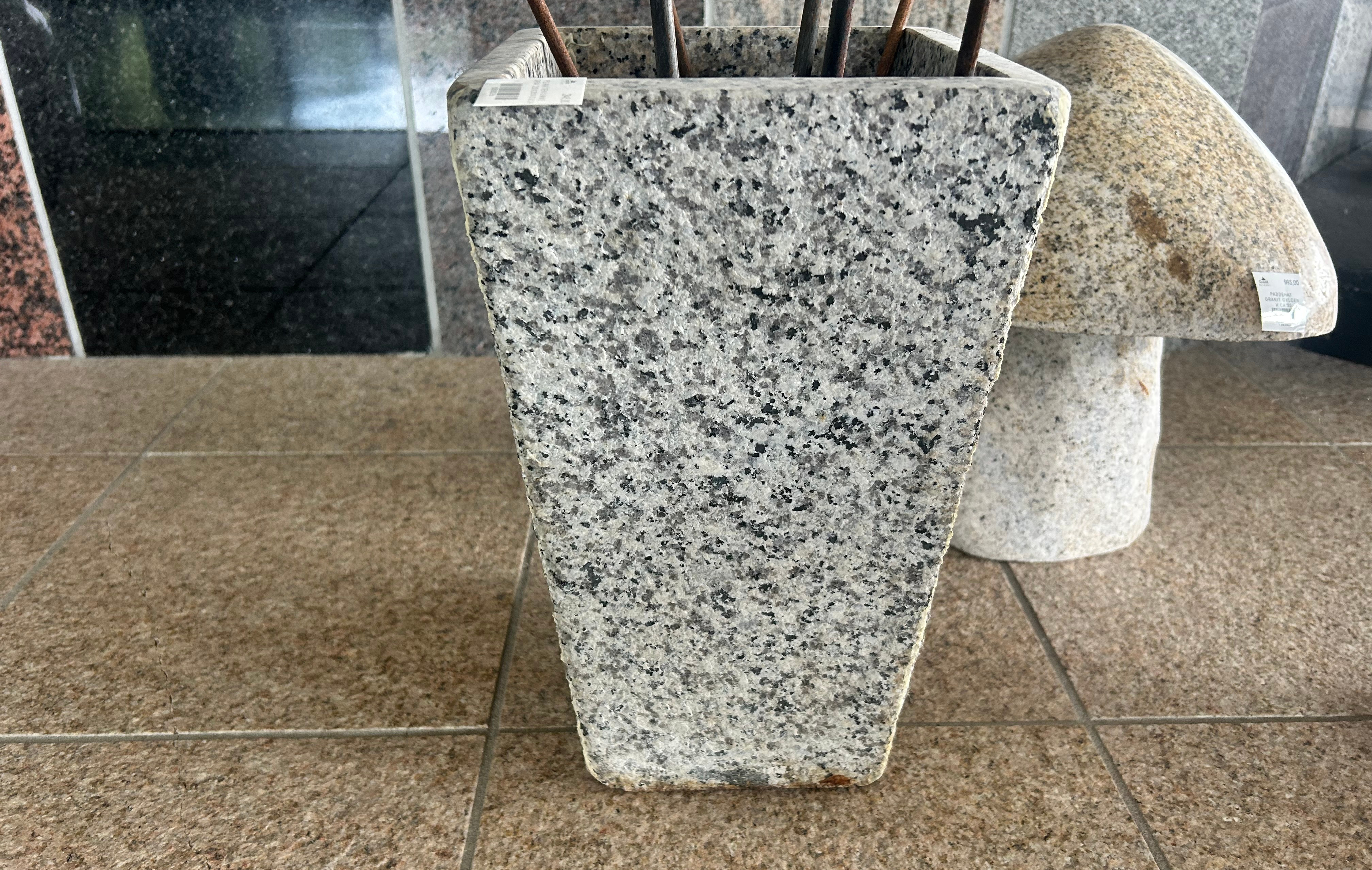 Plantekumme limet i lysgrå granit. Kummen har været beplantet og brugt som pynt i udstilling. Den har derfor brugstegn og er jordslået.