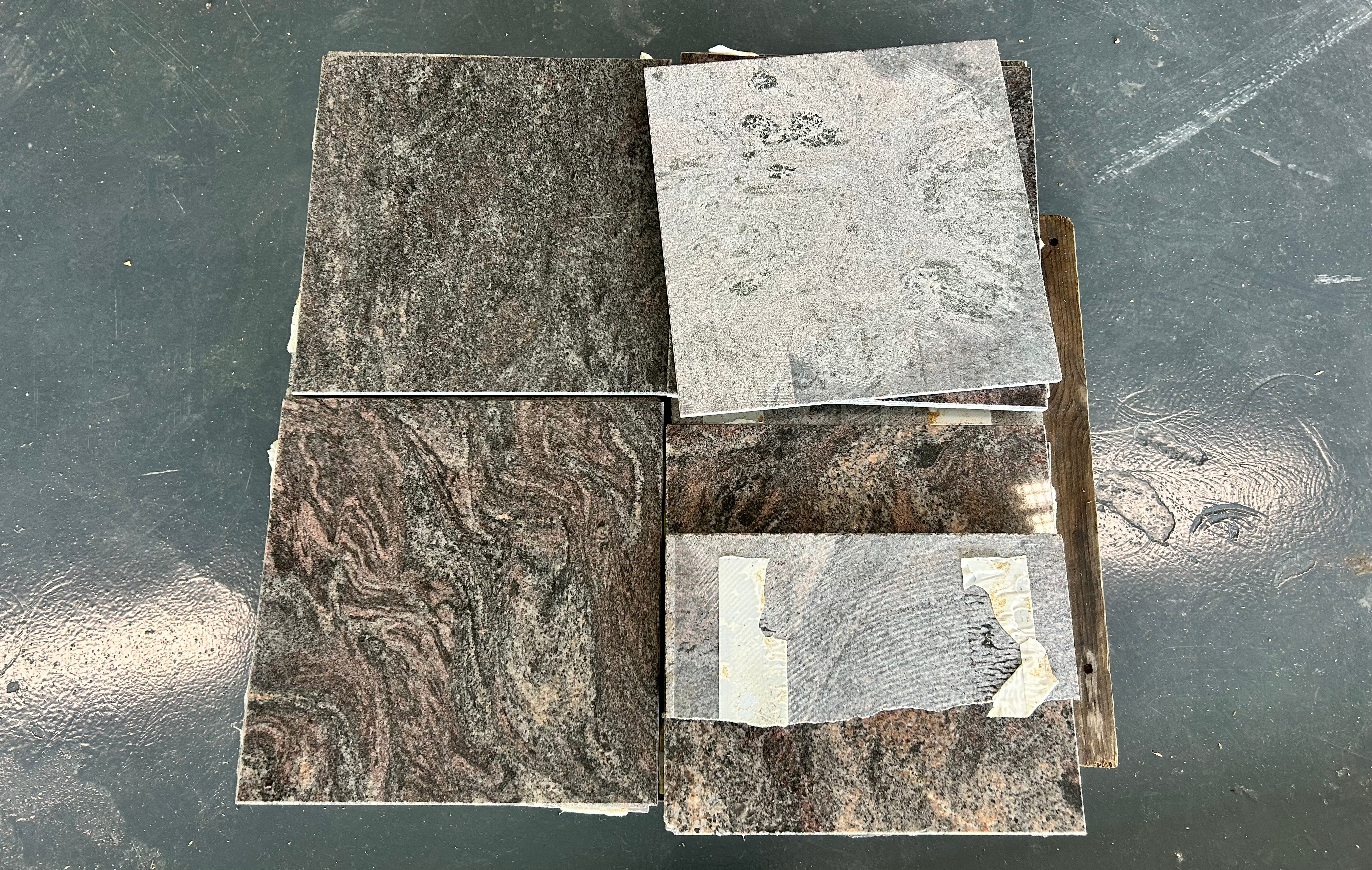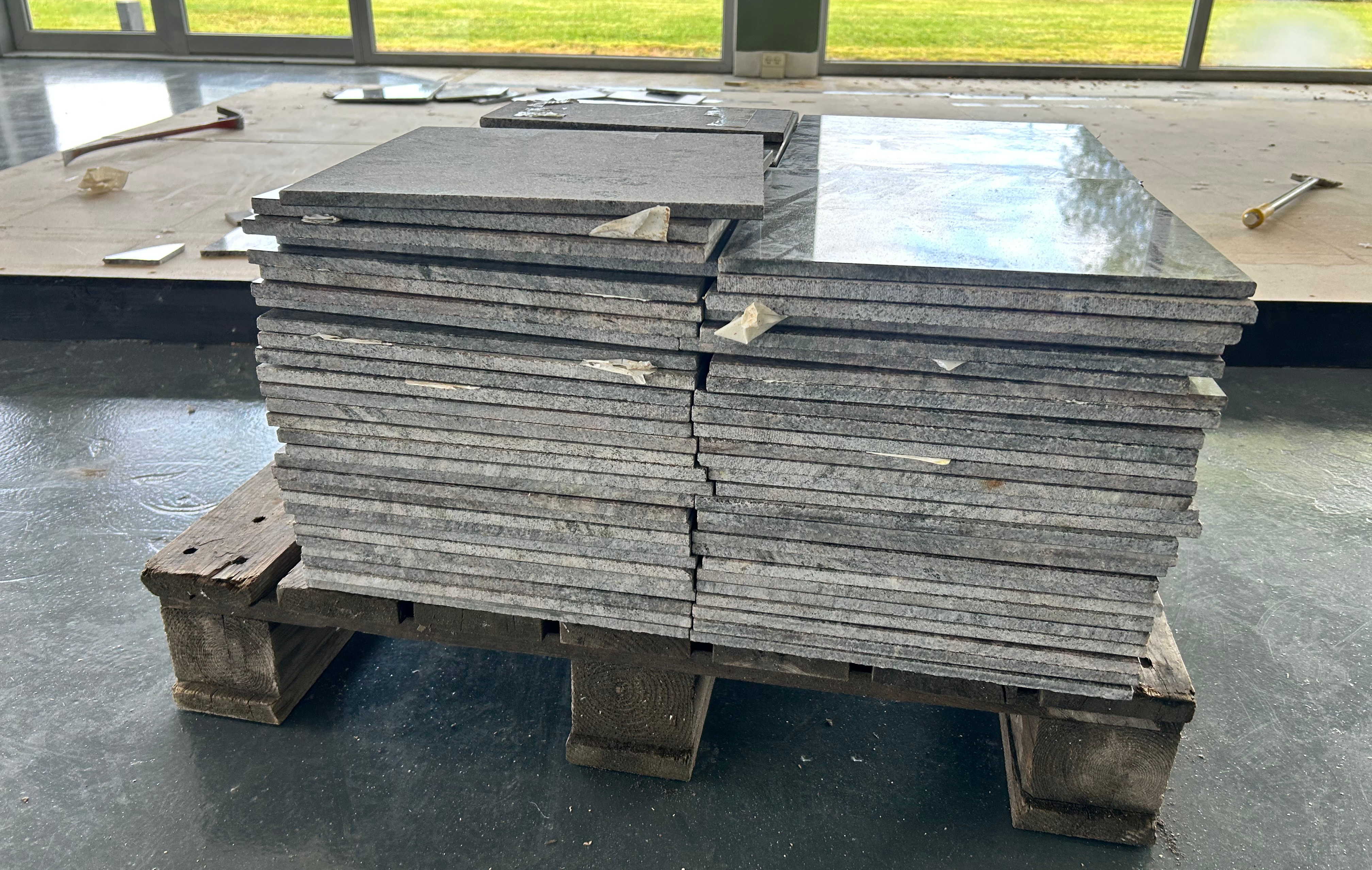 Fliserne har været brugt i udstilling og kan derfor have små ridser - der har dog ikke været gået på dem. Der er dobbeltklæbende tape bag på fliserne (fra montagen i udstilling).