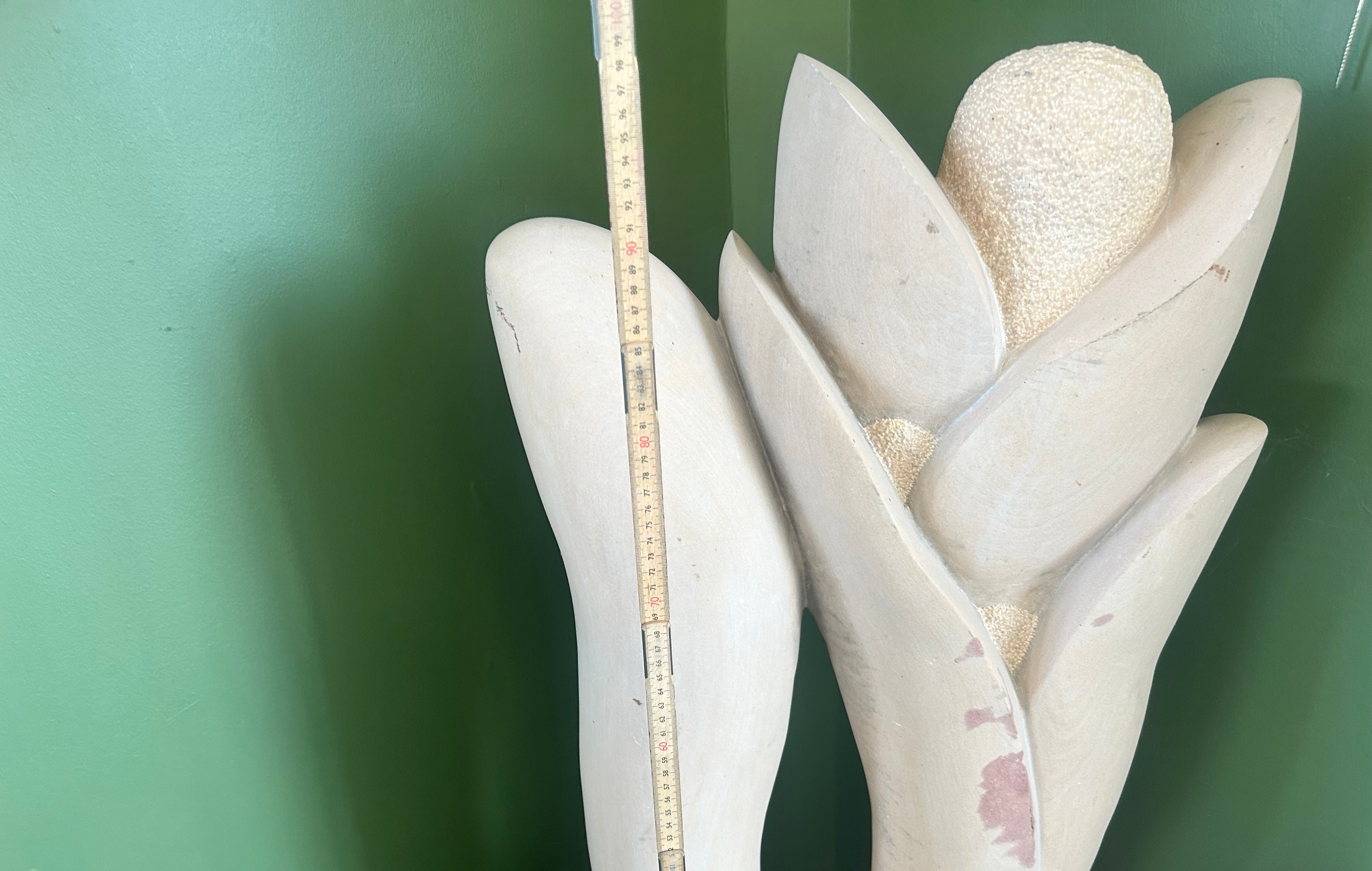 Skulptur blomst i beige/gullig sandsten. Højde ca. 100 x 50 x 30 cm.