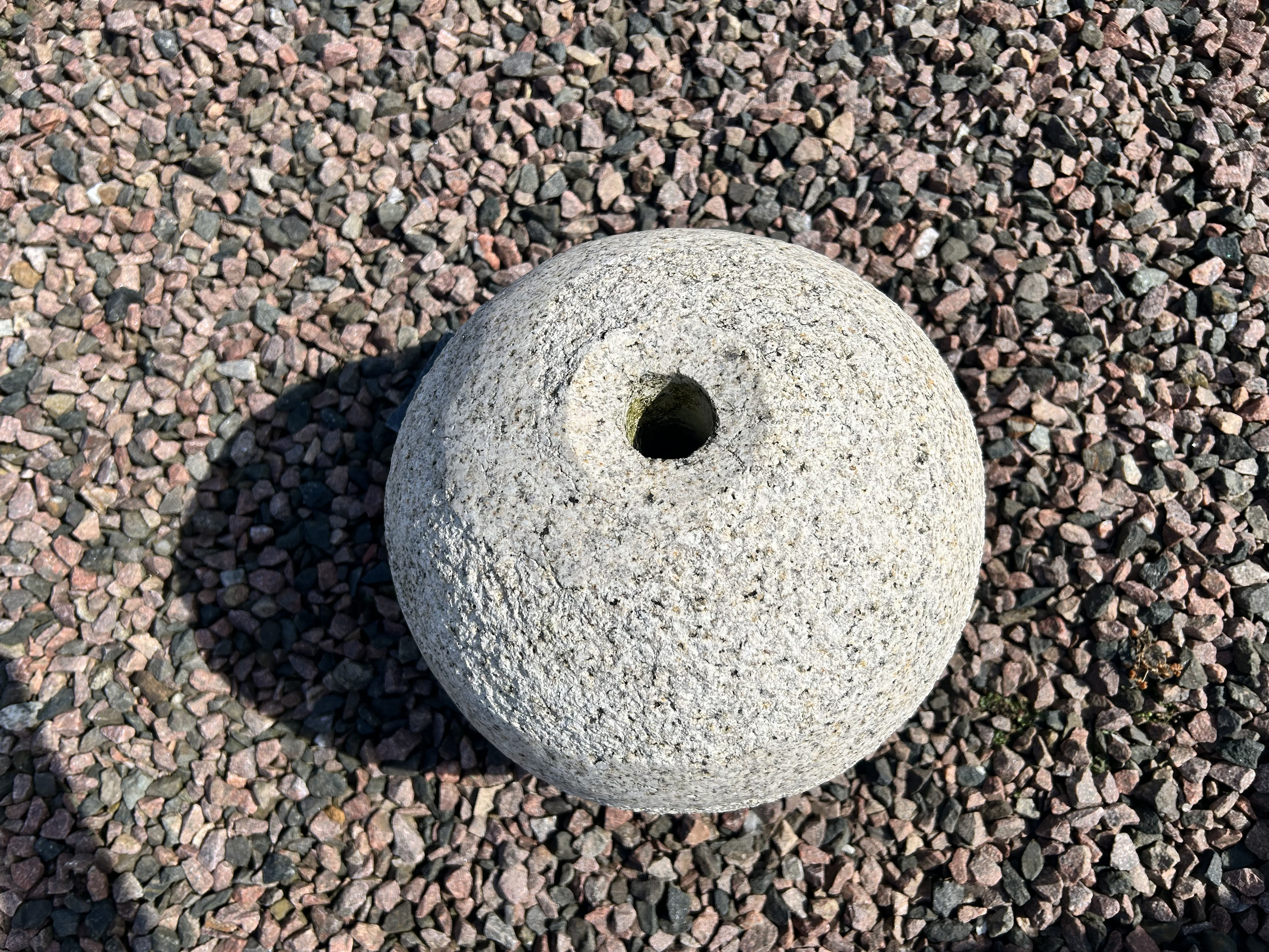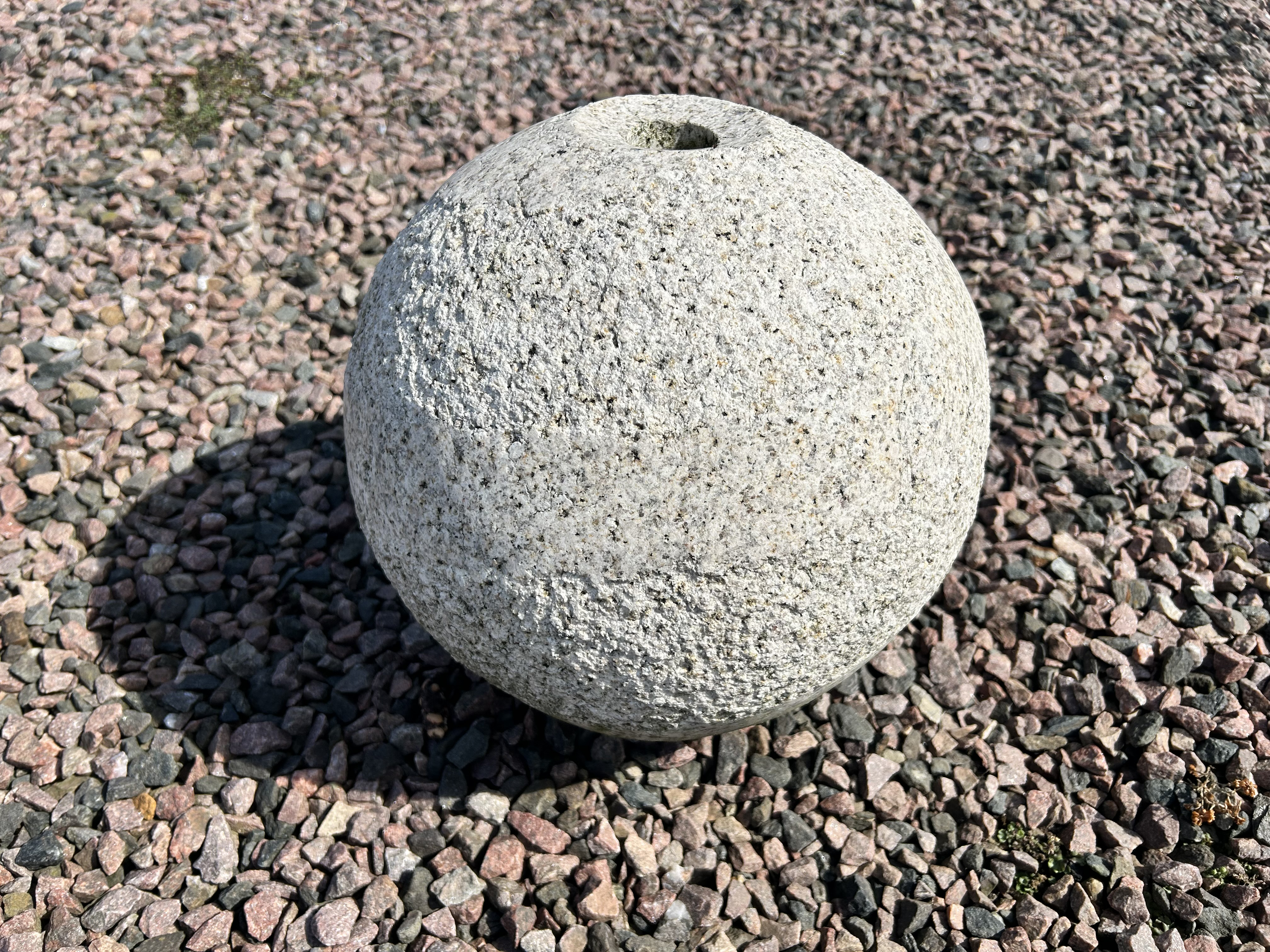 Vandstens kugle i gul granit med poleret stribe som snor sig rundt om kuglen. Diameteren på kuglen er ca. 30 cm.