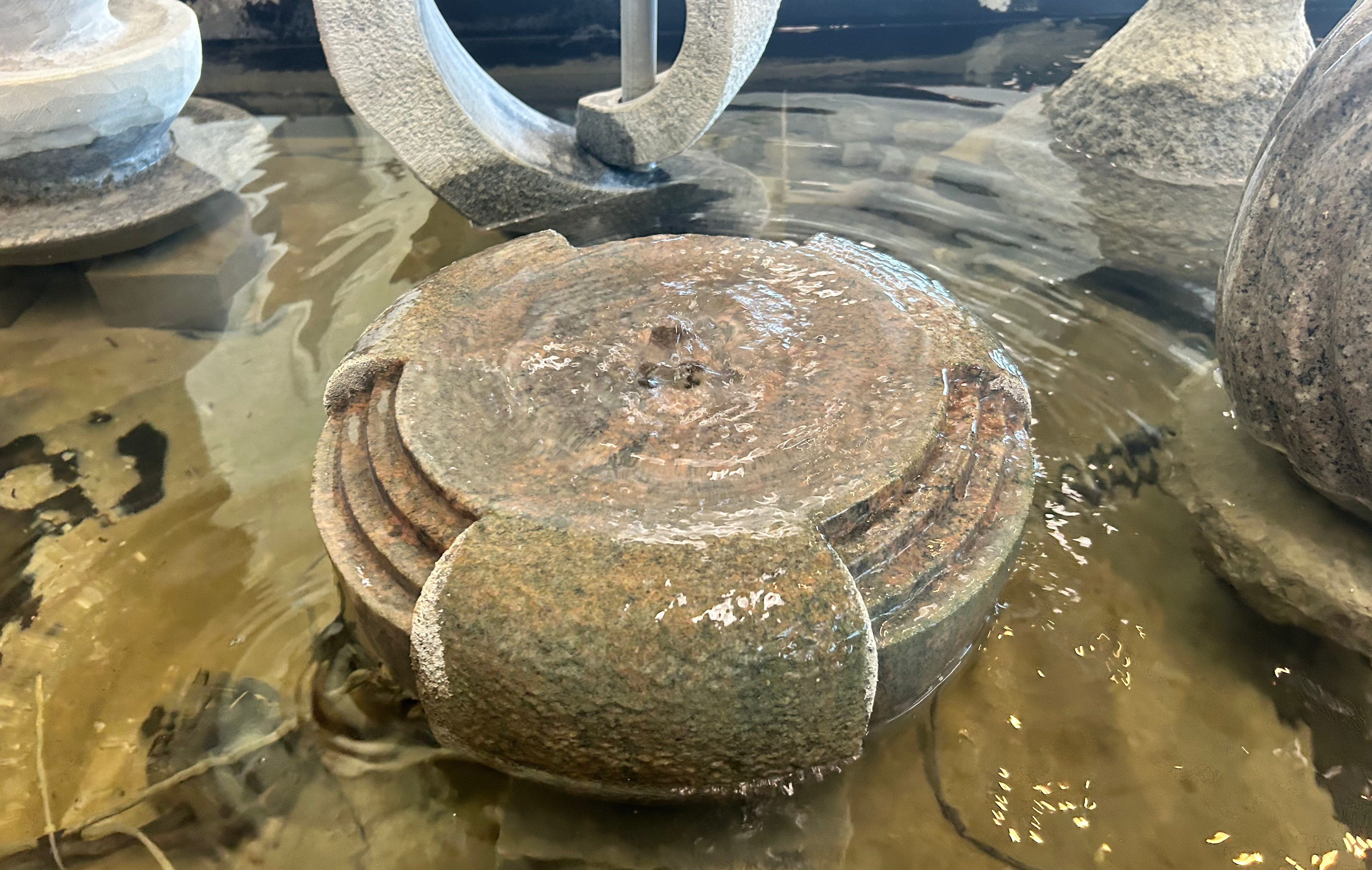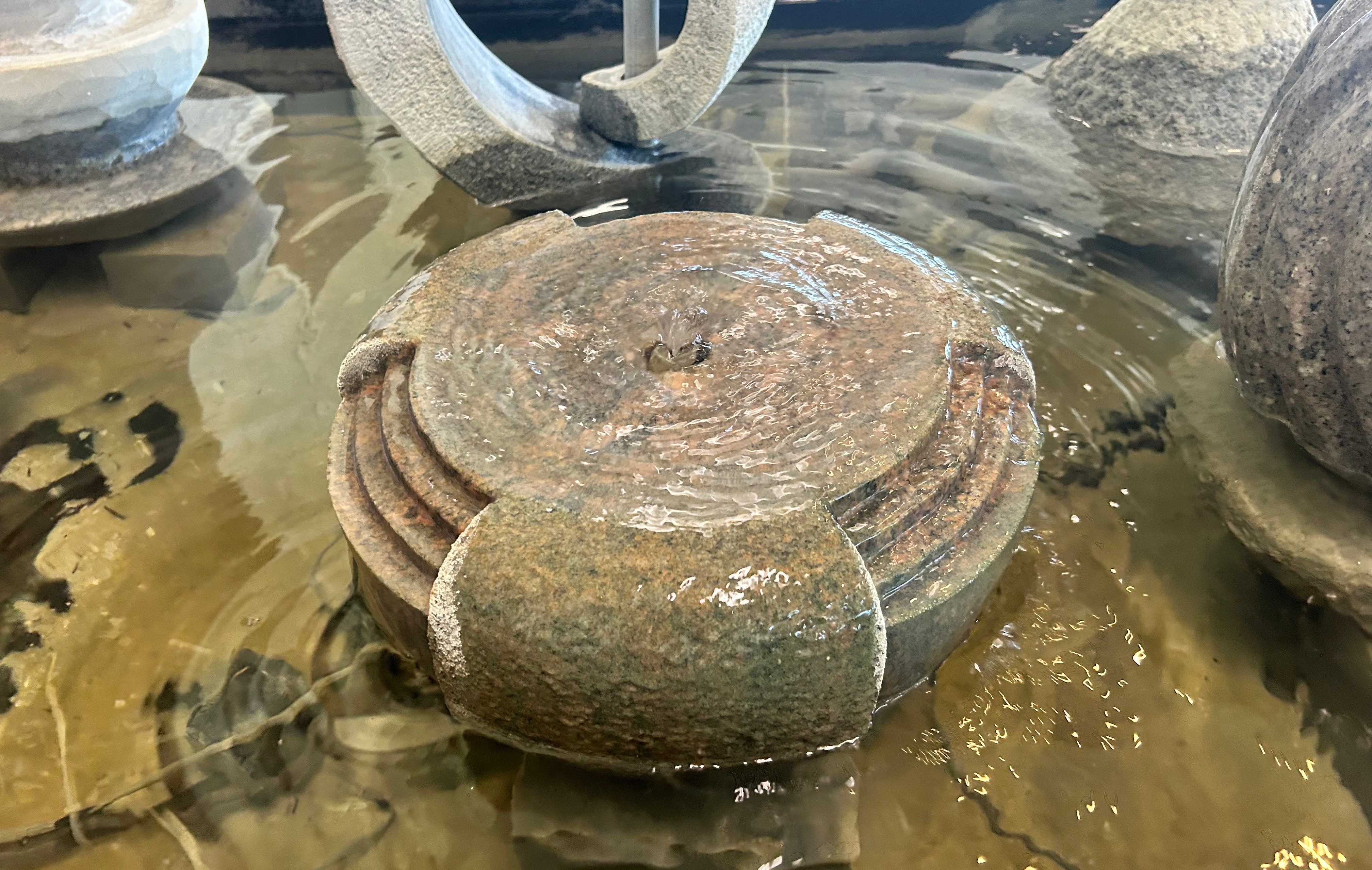 Mette vandstenen i rød granit. Ca. dia 35 x H 20 cm. Brugt i udstilling og har derfor tydelige kalkpletter.