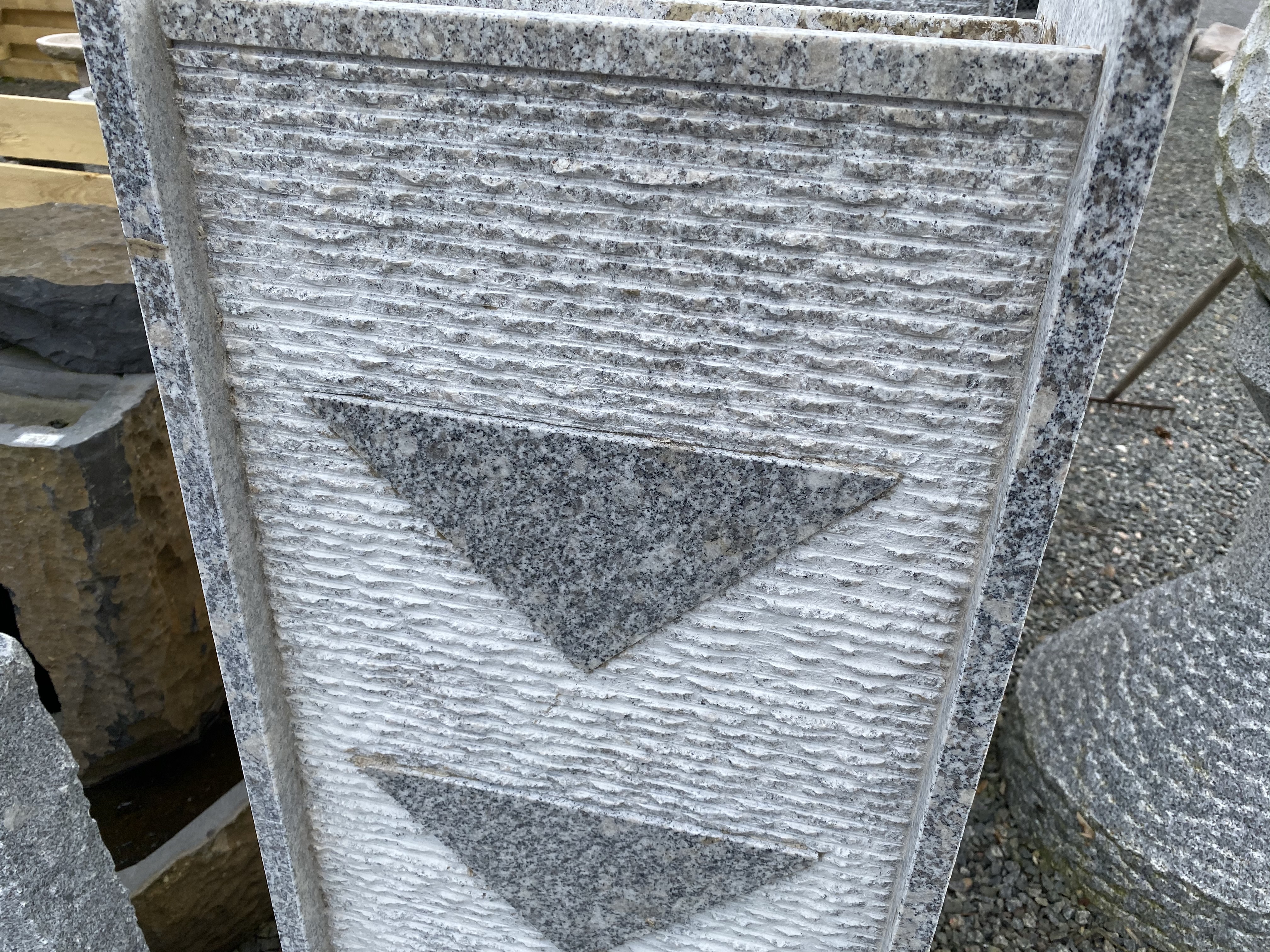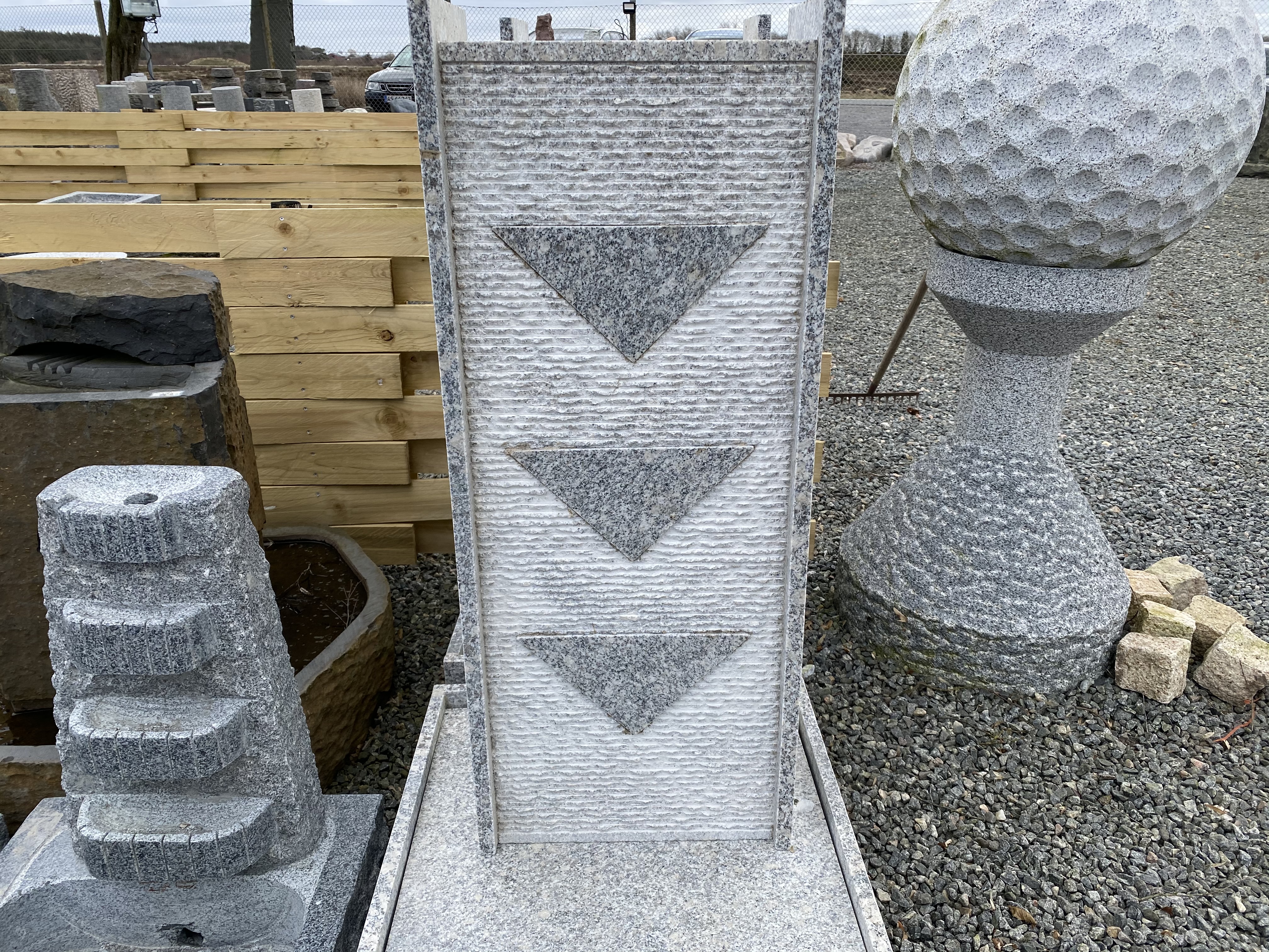 Slimline vandstenen er en væg af rislende vand. Stenen har polerede trekanter i granitten som skaber en kontrast og en baghagelig visuel fornemmelse når man kigger på stenen. Vandet der stille risler ned af væggen er velegnet til at danne ramme for et hyggeligt og afslappende miljø i haven hvor der er plads til afslapning. Stenen er en flot modpol til de grønne træer og buske i haven. Stenen er produceret i lys grå granit.