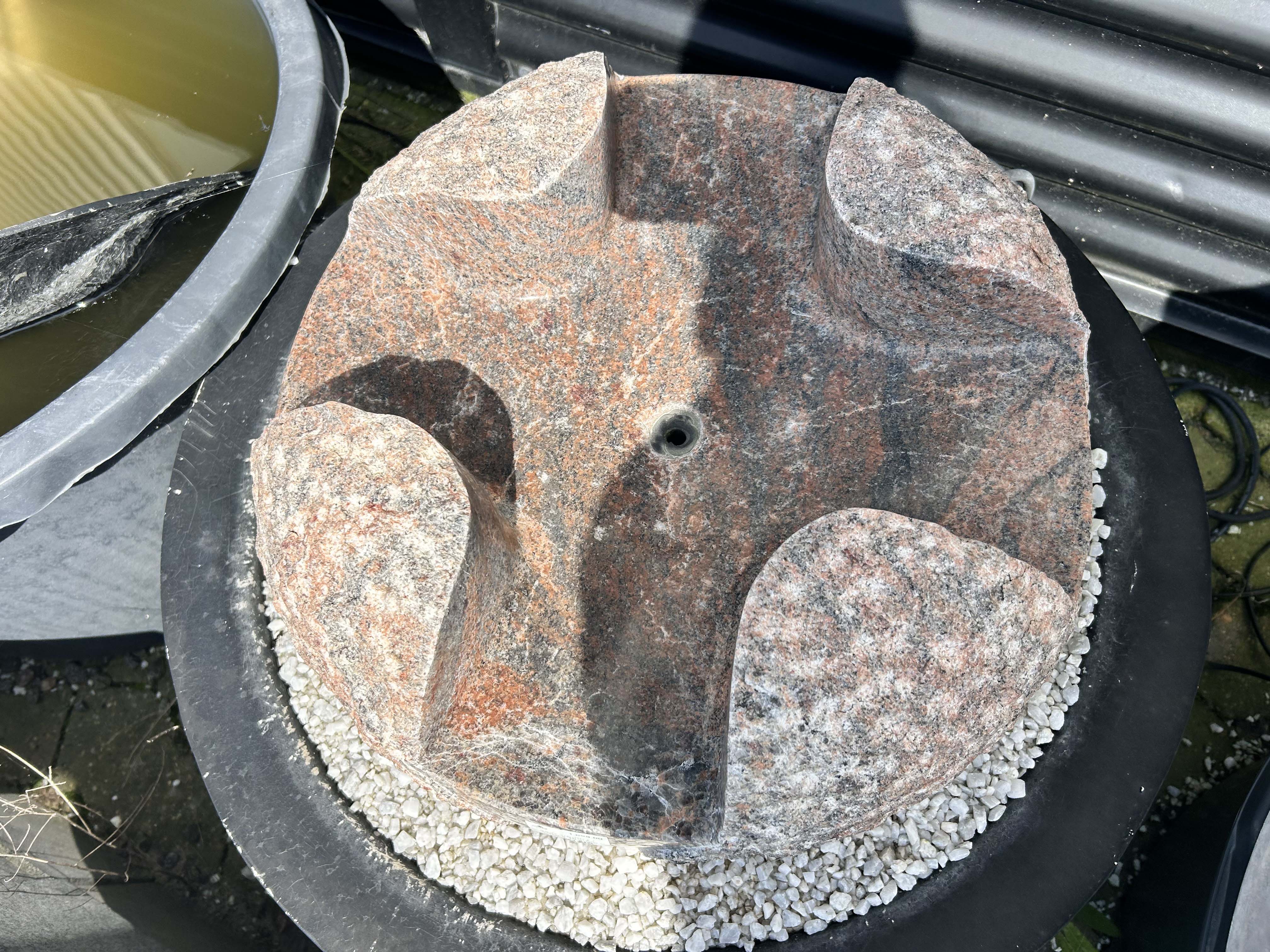 Vandsten Udhulet kugle i rød indisk granit. Med til vandstenen medfølger balje, låg pyntesten og pumpe. Der er ingen garanti på pumpen, da den har været brugt i vores udstilling. Vandstenen har en diameter på ca. 40 cm.