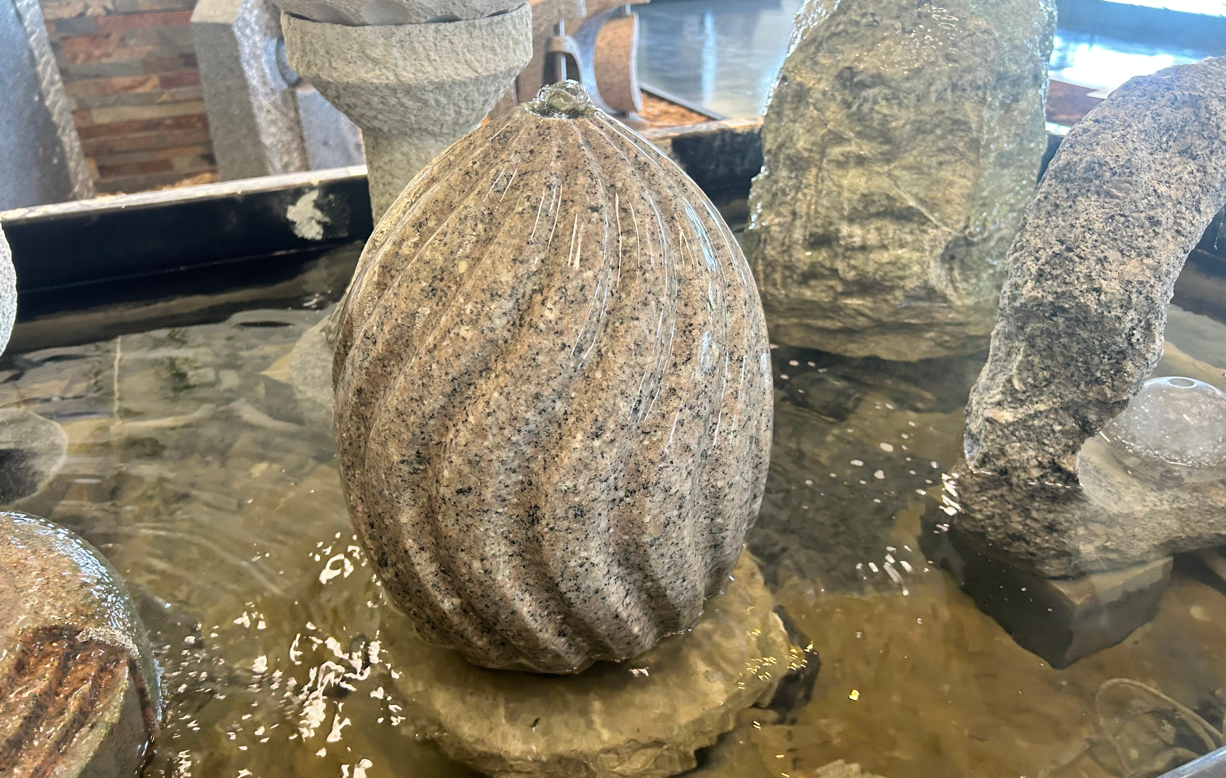 Vandsten Vredet løg i rosa poleret granit. Ca. H 40 cm. Brugt i udstilling og har derfor tydelige kalkpletter.