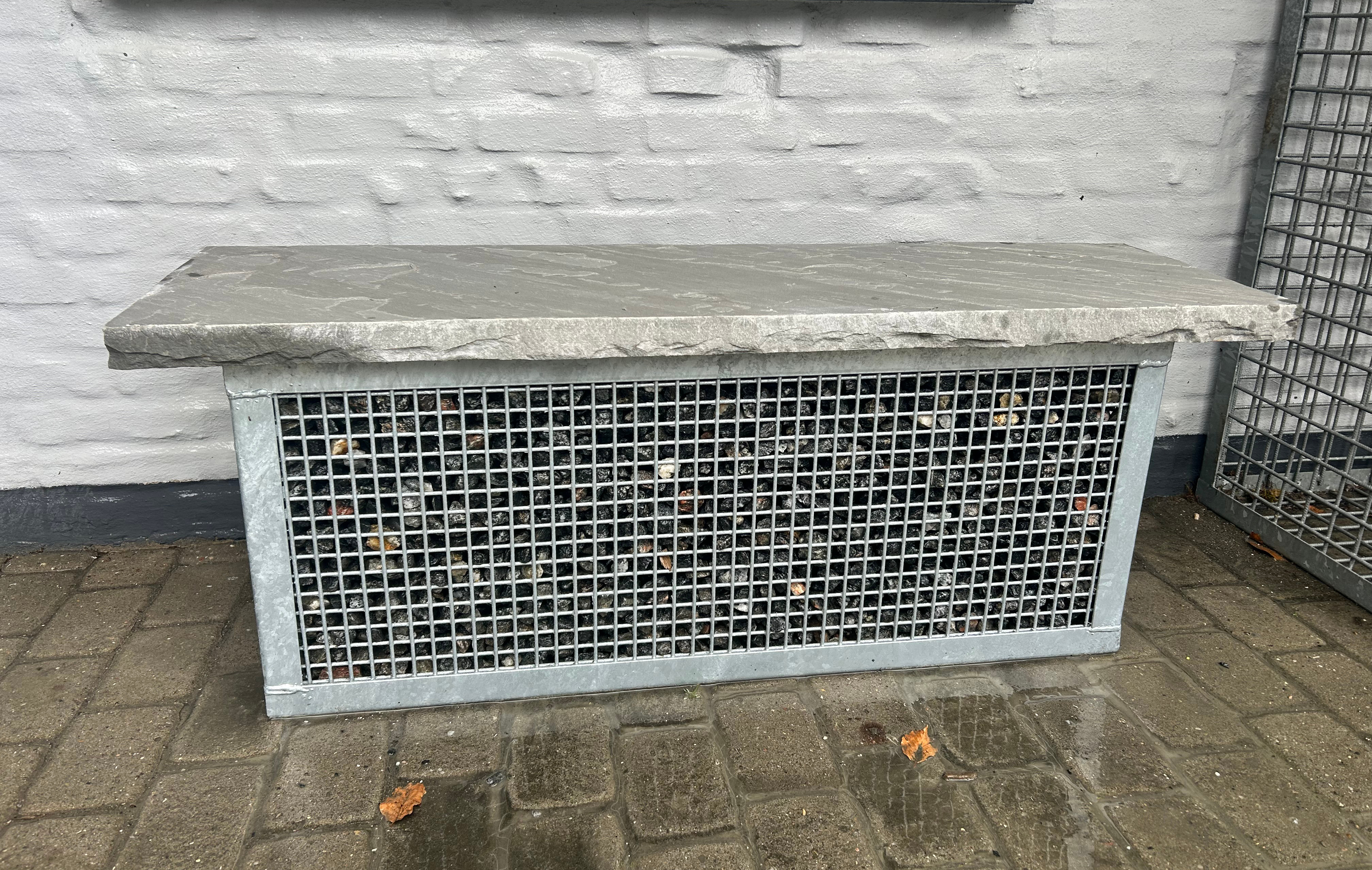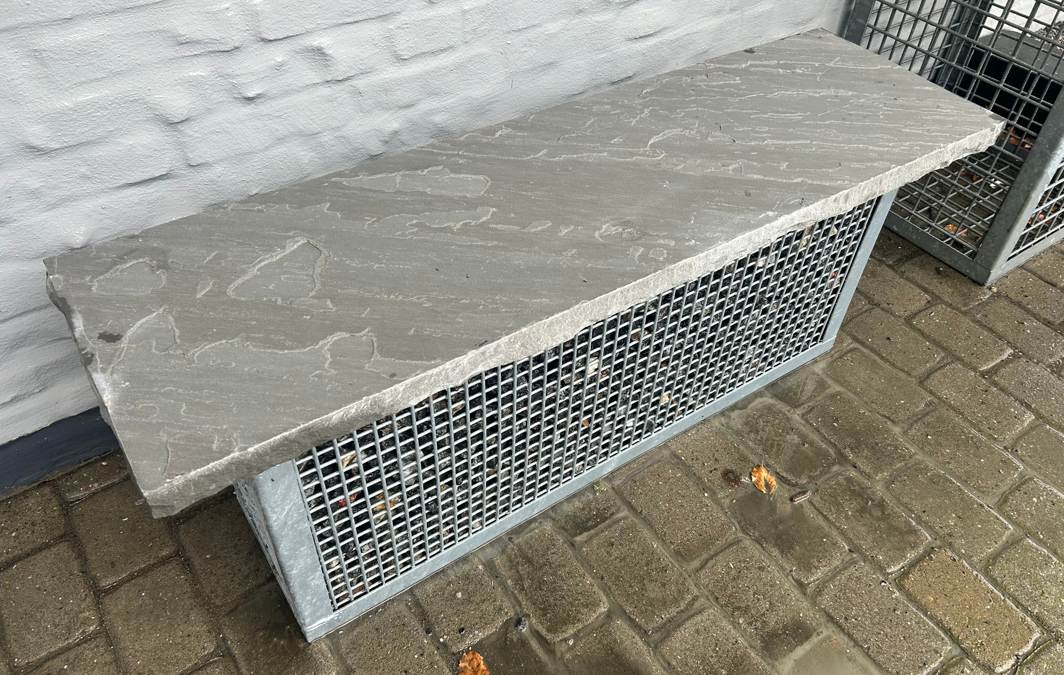 Gabion bænk med svelle og grålige sprængstykker. Sædet er udført i grå Kandla Grey sandsten og har en naturlig kløvet overflade, som giver flot kontrast til det stilrene stål. Fyldet i gabion buret er sprængstykker i gråmix 16/32 mm