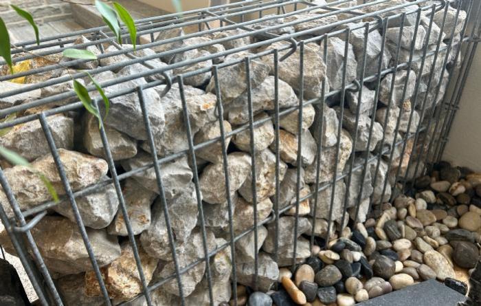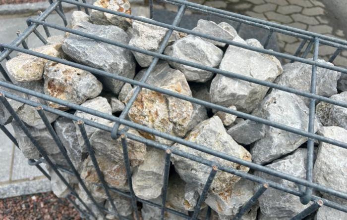 Gabion med beige granit klippestykker til fyld. Kan bruges som bænk eller læmur i haven. Kan også anvendes som indramning af terrassen eller langs gangstien.