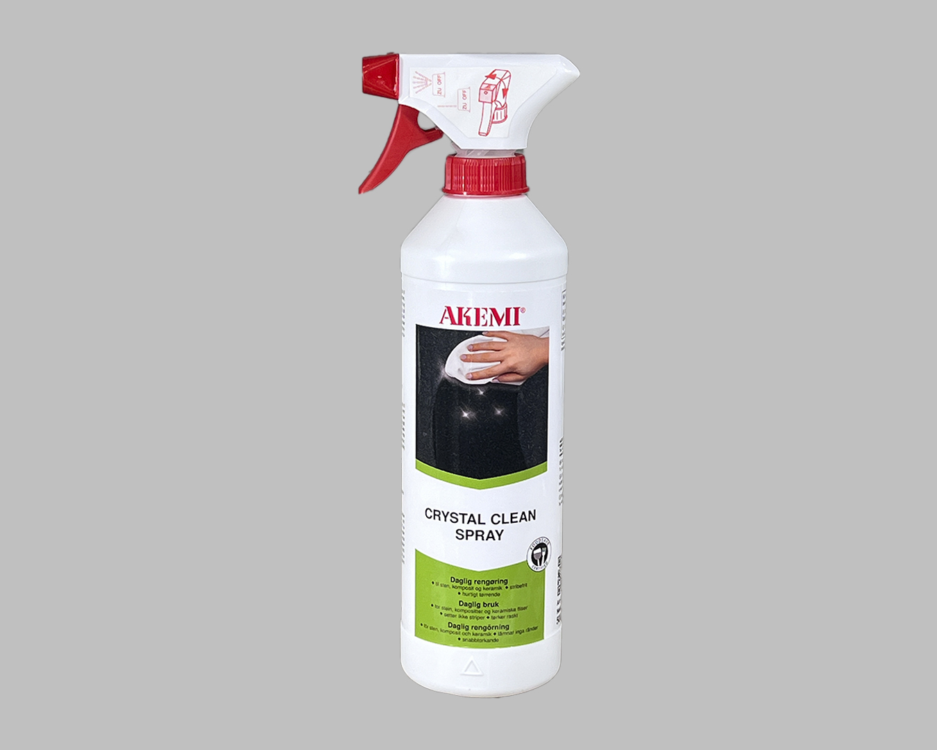 Akemi Crystal Clean spray er en brugsklar rengøringsspray til daglig aftørring af lettere tilsmudsning på alle natur- og kunststen, klinker og keramikflader. Produktet indeholder ikke syre eller lud og angriber derfor ikke fugematerialer. Særdeles velegnet til brug på marmor og kalksten. Tørrer hurtigt og efterlader ingen striber eller slør på overfladen. Passer godt til rengøring af armaturer og brusenicher.