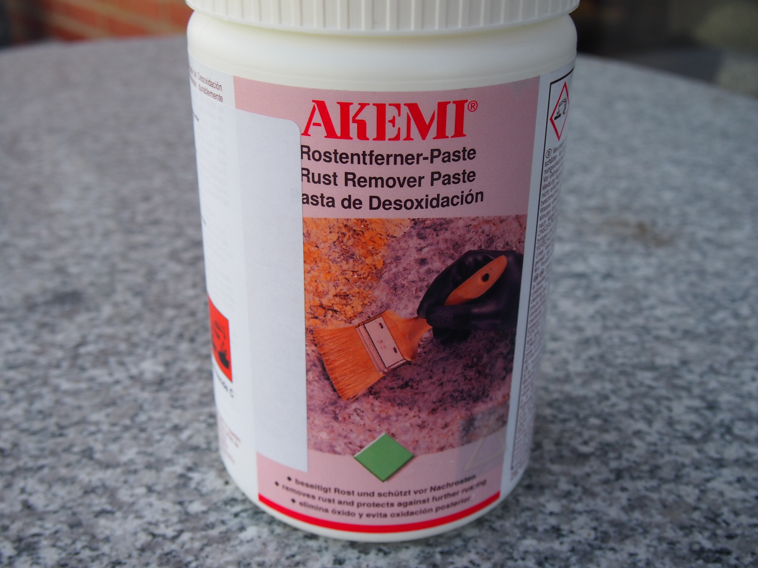 Rustfjerner pasta er et rensemiddel baseret på ikke-organisk syre med ikke-ioniske afspændingsmidler og korrosions inhibitorer. Produktet er syreholdigt men indeholder ikke saltsyre og opløsningsmidler.