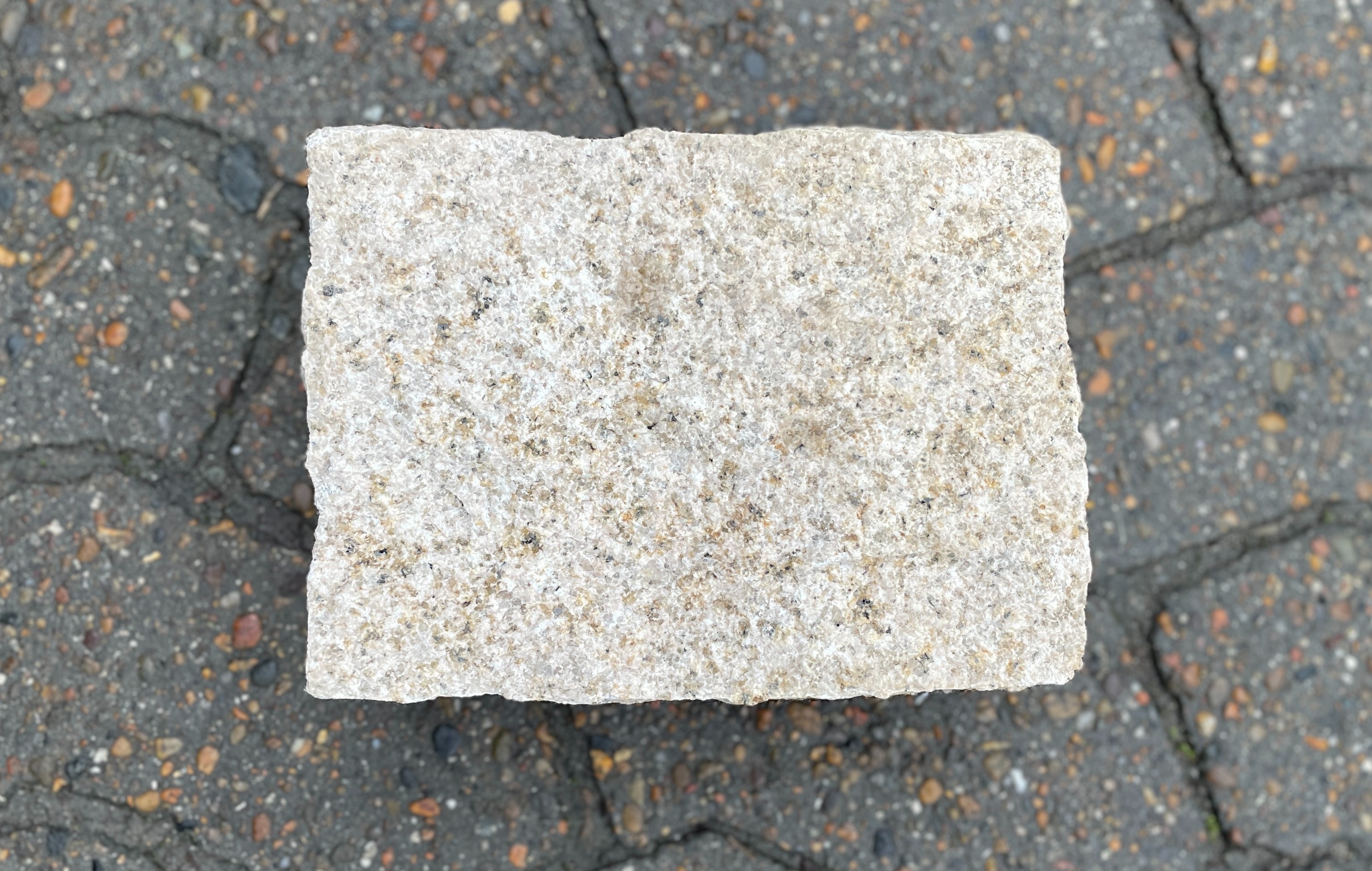 Klosterhvede i gul granit med let kløvet overflade. Kan benyttes til stier som flise eller på højkant som kantsten. Hvederne har en let kløvet overflade, der gør dem ru at se på og røre ved.