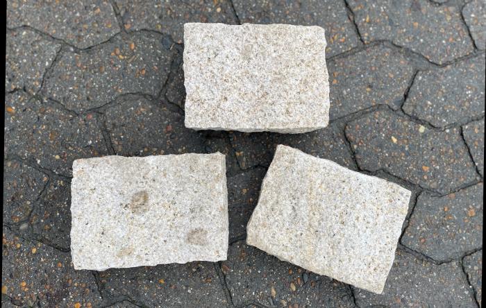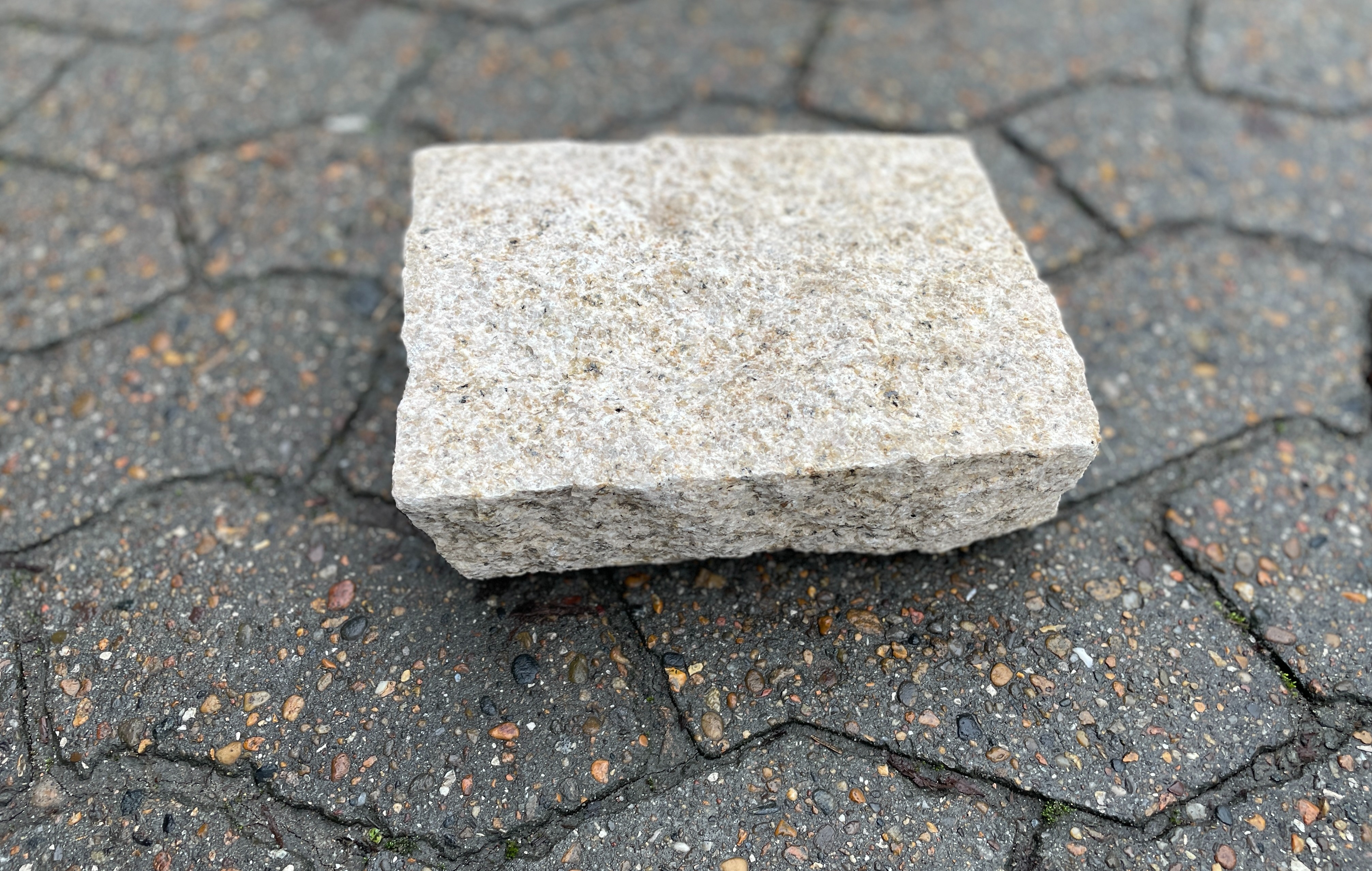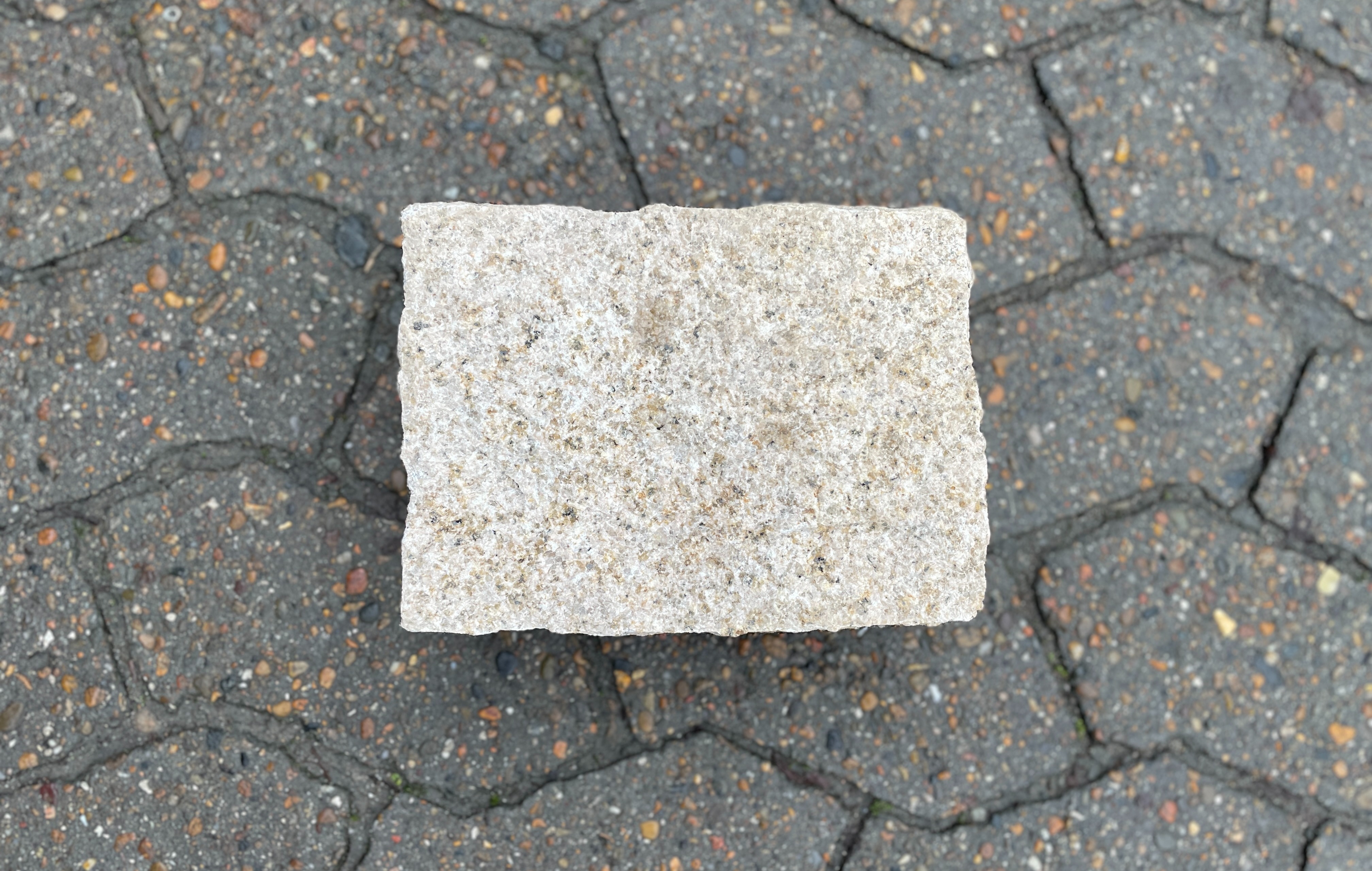Klosterhvede i gul granit med let kløvet overflade. Kan benyttes til stier som flise eller på højkant som kantsten. Hvederne har en let kløvet overflade, der gør dem ru at se på og røre ved.