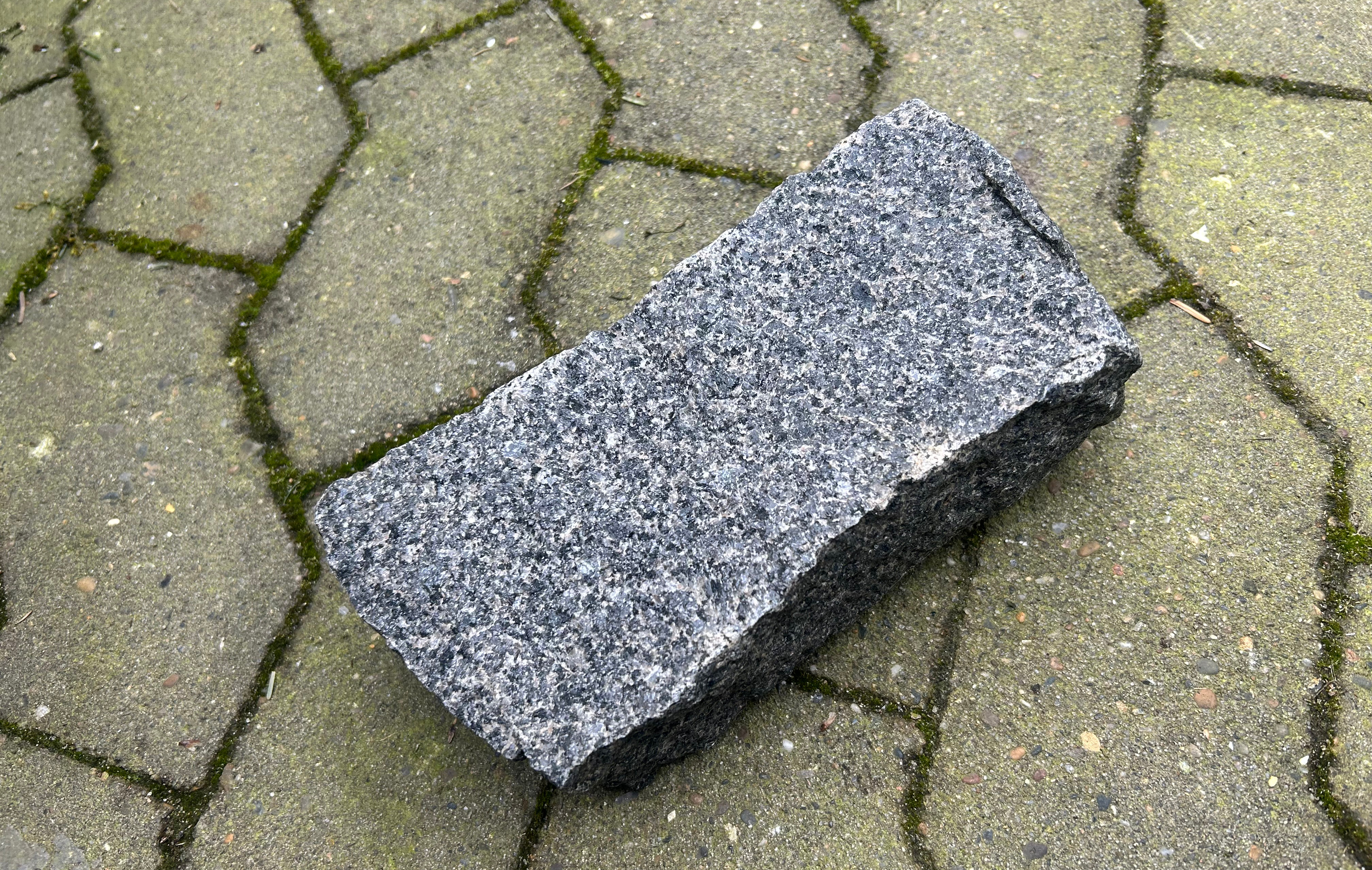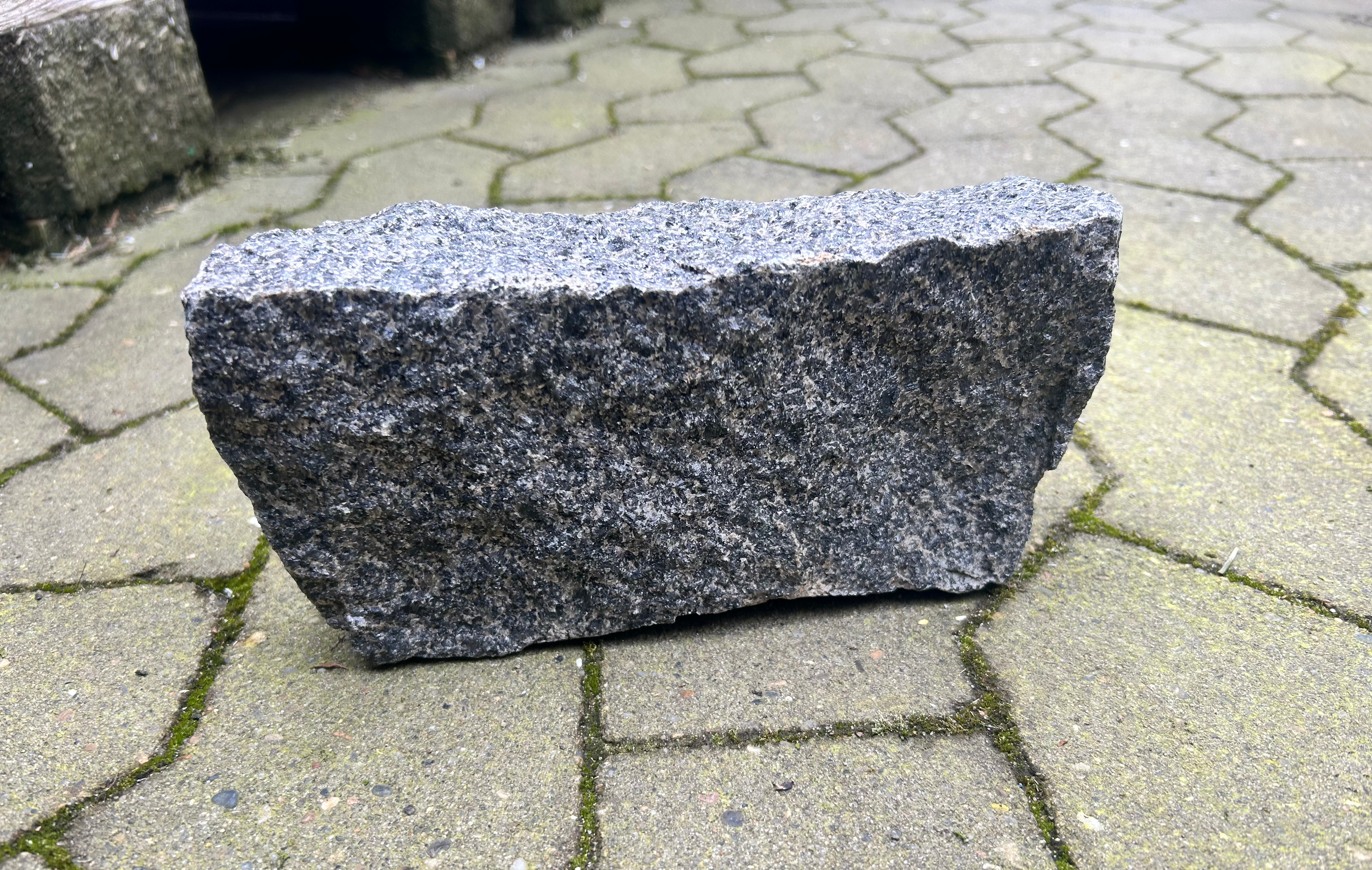 Hvede i Blå Rønne granit med kløvet overflade på alle sider. Granittypen er varierende i blålige nuancer. Kan bruges som kant eller belægning i mindre område.