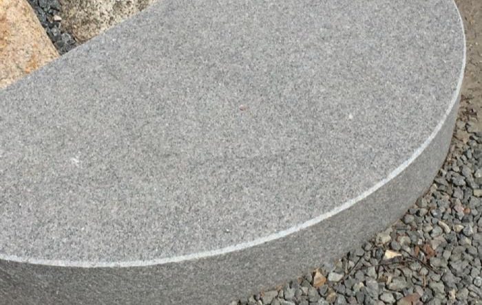 Radius/halvcirkel trappetrin i grå/rødlig granit med jetbrændt, skridsikker overflade. Granittrappetrin i halvcirkelform. Produceret i en smuk rødlig granit, der passer fint til enhver indgang.