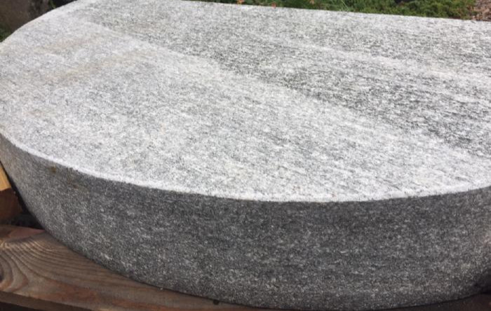 Trappetrin i grå/hvid granit med levende naturlige årer i sorte, grå og hvide nuancer. Trappe i halvcirkelform i 15 cm højde i 3 forskellige diametre. Trinene i diameter 120 og 180 cm kan bruges for sig selv, mens trinnet på 240 cm har en bredde på 34 cm og kommer i 5 dele og bruges med trin ovenpå.