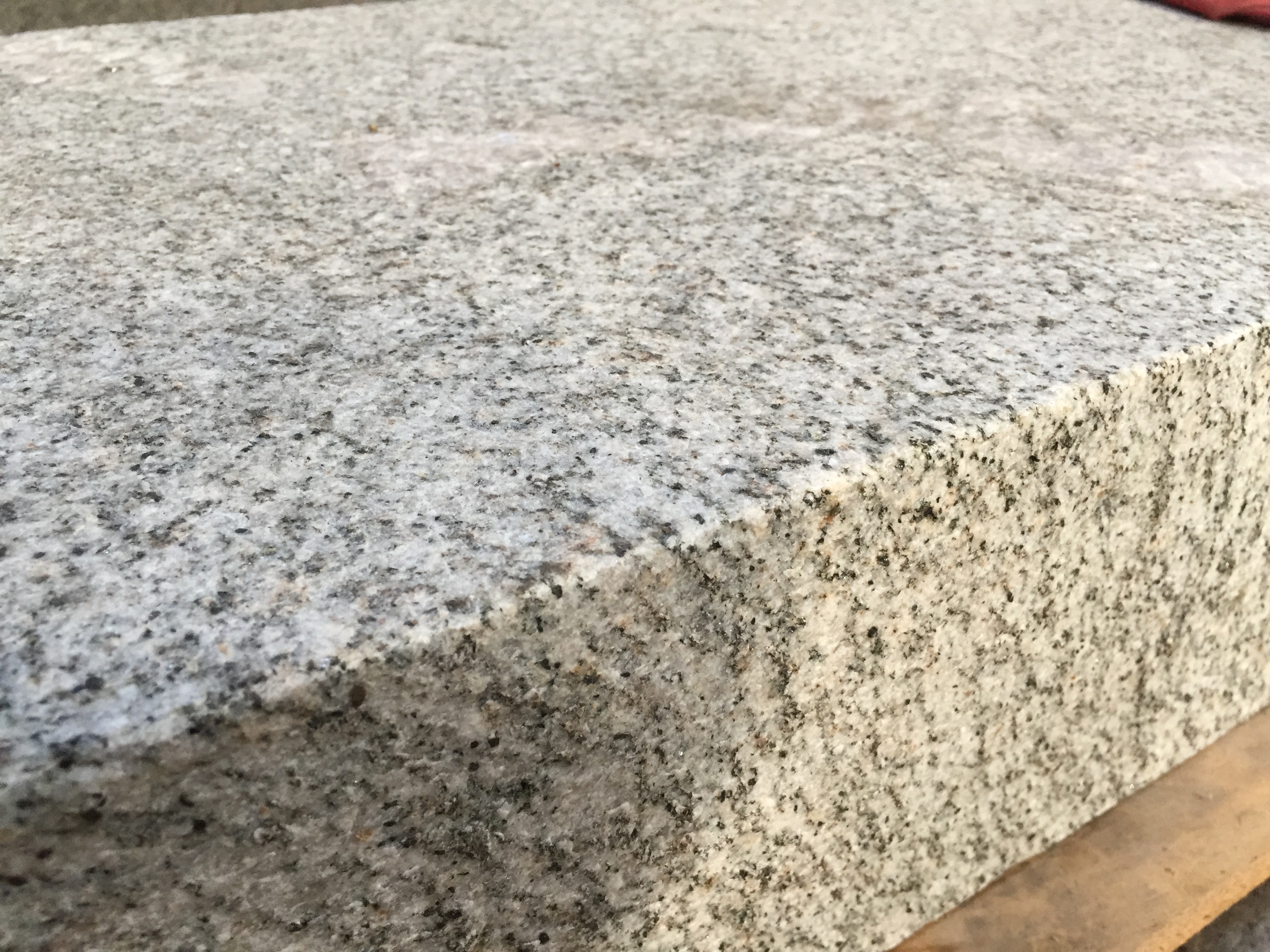 Massivt trappetrin i den smukke lyse granit med flammet skridsikker overflade og sider. Alle kanter er med 3 mm fas og 15 cm trinhøjde. Denne granit fremstår som helt lysgrå. Trappetrinet har smukke naturlige årer og kan variere lidt i farvenuance. Trappetrinet har en jævn, jetbrændt, skridsikker overflade.