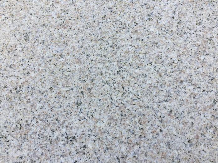 Massiv trappetrin i lys rosa granit med stokhugget, skridsikker overflade. Alle kanter er med 3 mm fas og 15 cm trinhøjde. Trinnet vil fremstå meget lys når tør, men bliver mørkere i våd tilstand.