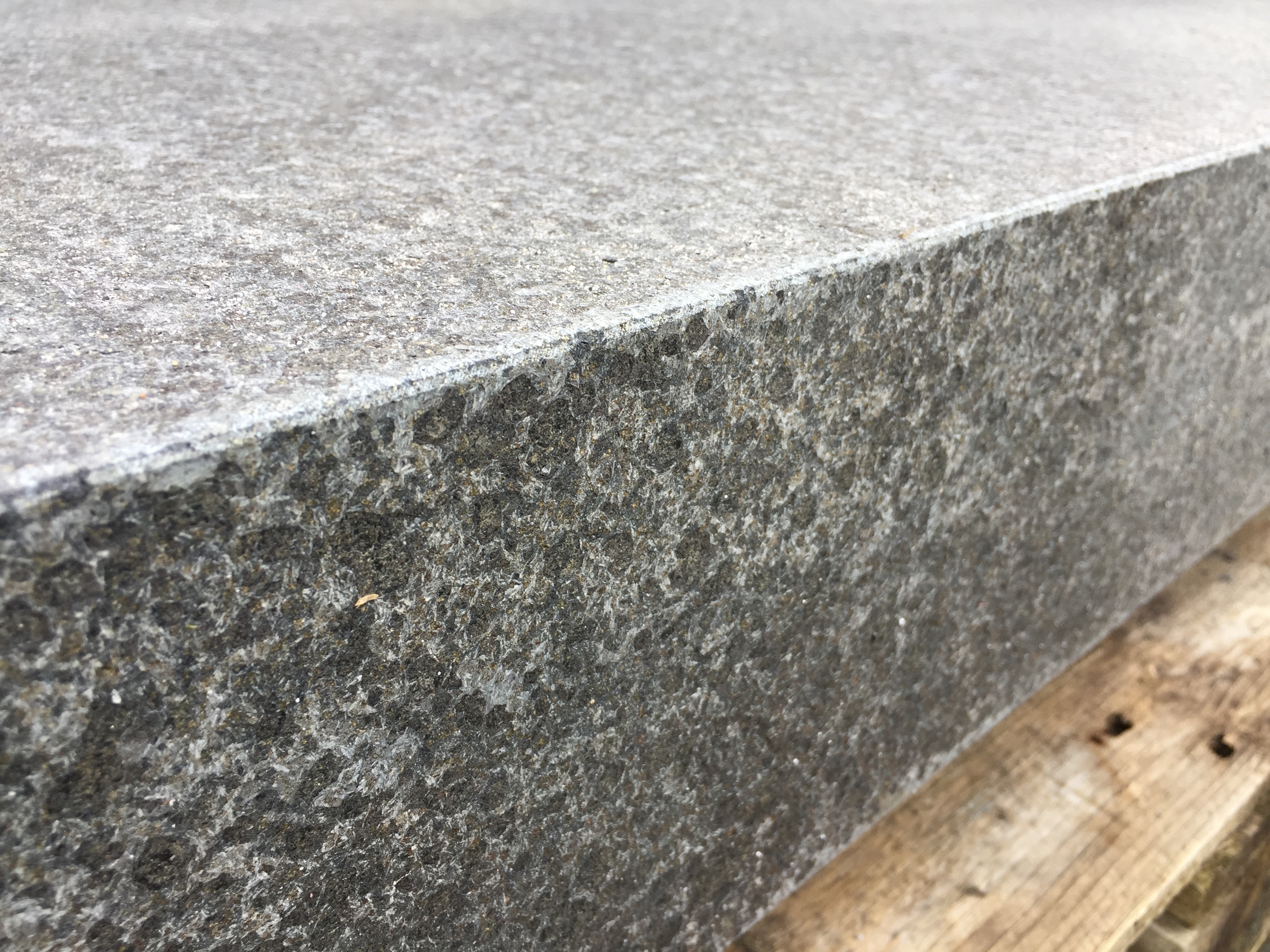 Massivt trappetrin i sort basalt med jetbrændt skridsikker overflade og sider. Alle kanter er med 3 mm fas og en 15 cm trinhøjde. Trappetrin i sort basalt fremstår koksgrå i tør tilstand og helt sort, når trinnet er vådt.
