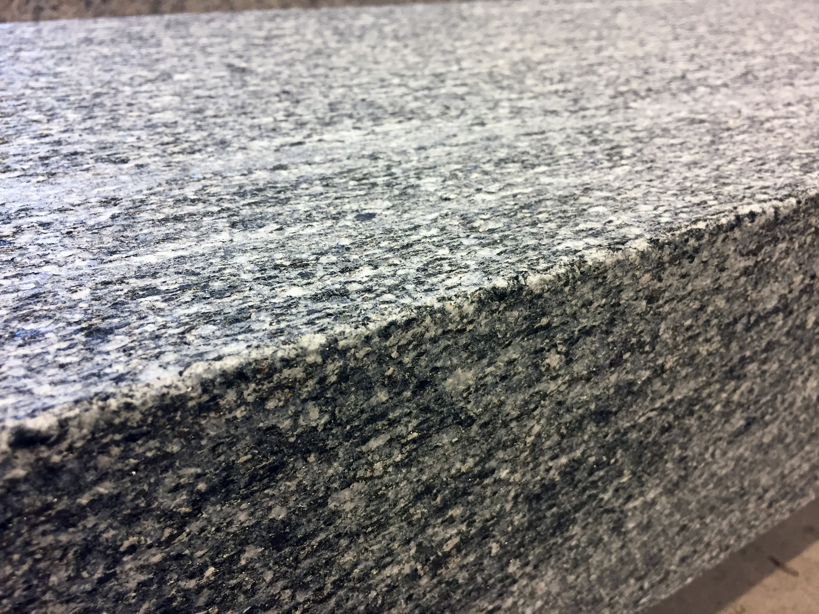 Trappetrin i grålig granit med naturlige hvide årer. Trinene har jetbrændte, skridsikker overflade på top, forkant og to ender.