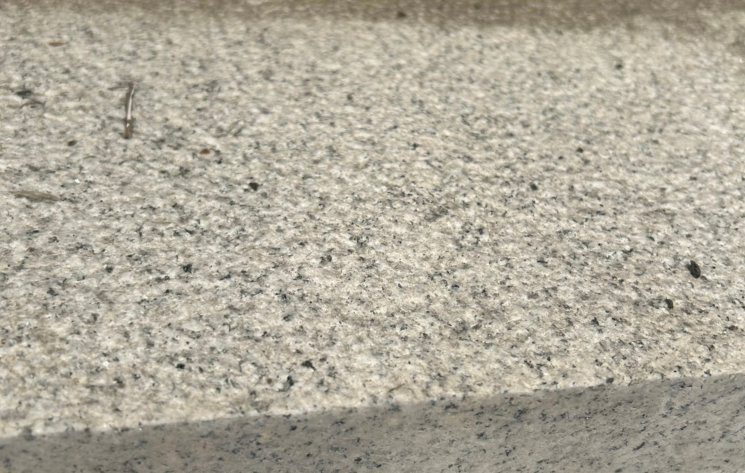 Granitplade i lysgrå granit til beklædning af betontrappe. Lys grå granit med skridsikker, jetbrændt overflade der gør denne plade specielt velegnet til trappetrin. Tilskæres til individuelle mål og med ønskede udskæringer. Slip for fuger, der kan frostsprænge. Monteres med almindelig fliseklæb beregnet til udendørs brug.