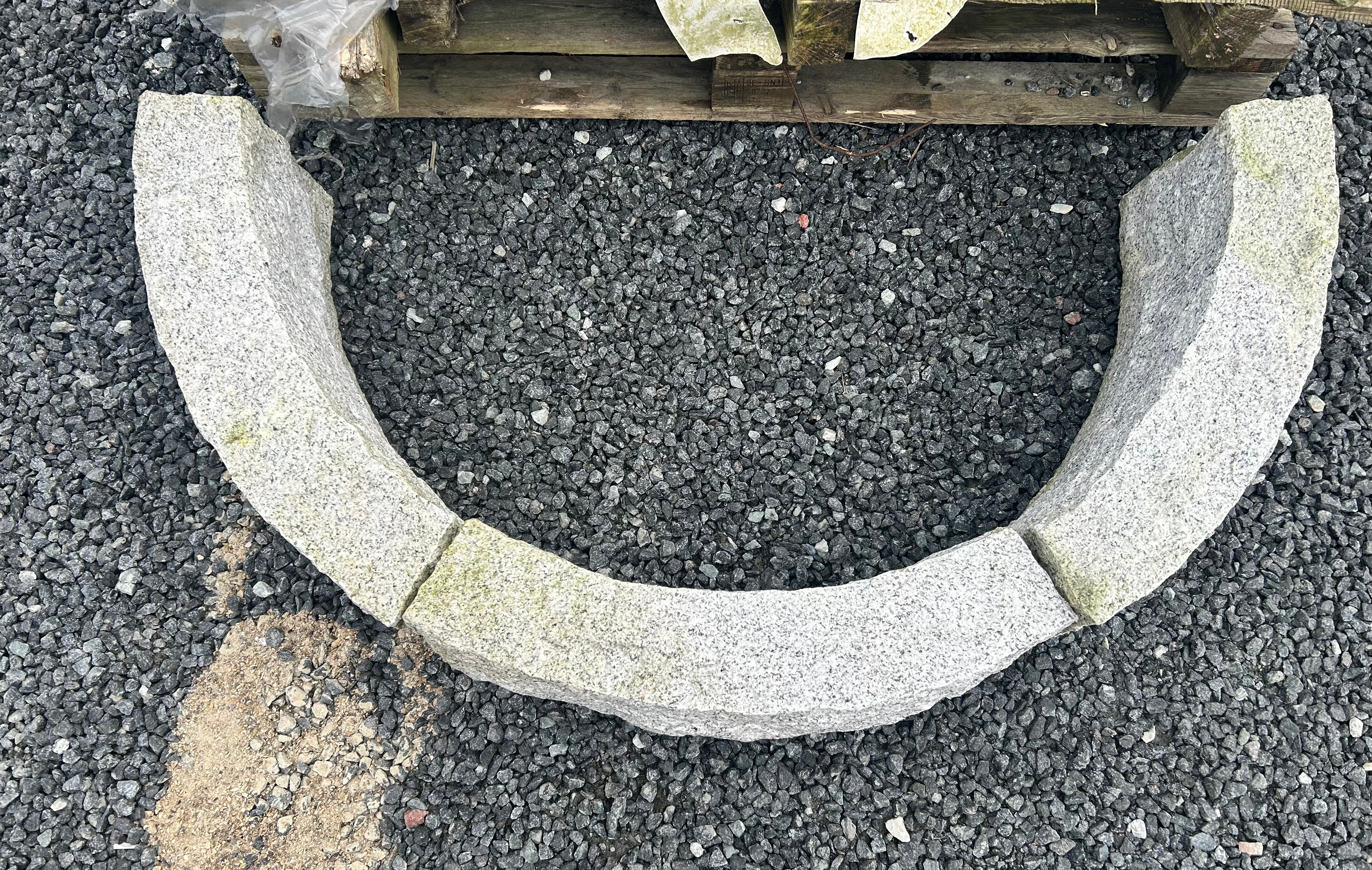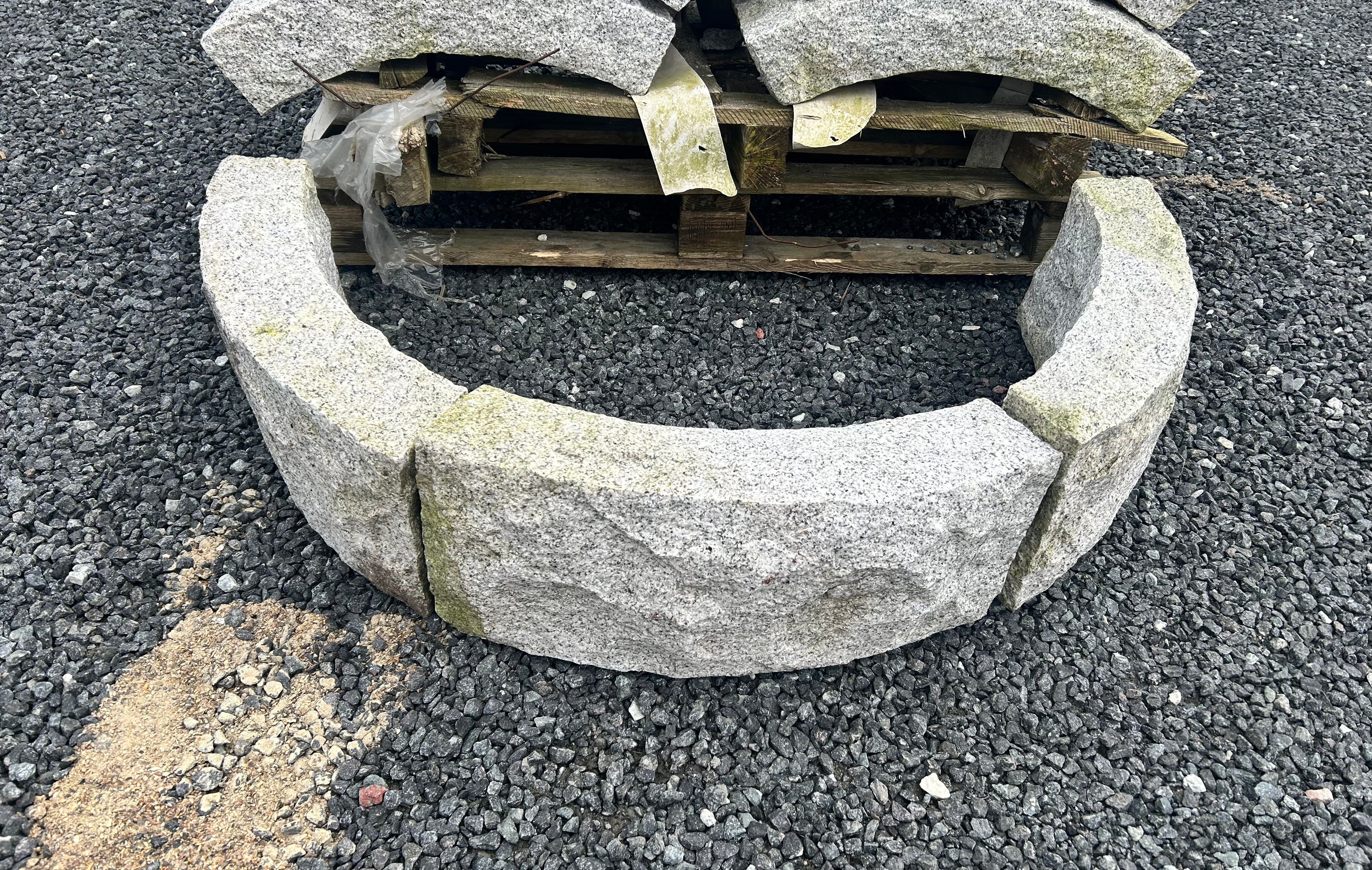 Kantstens trappe i lys grå granit med kløvet overflade.