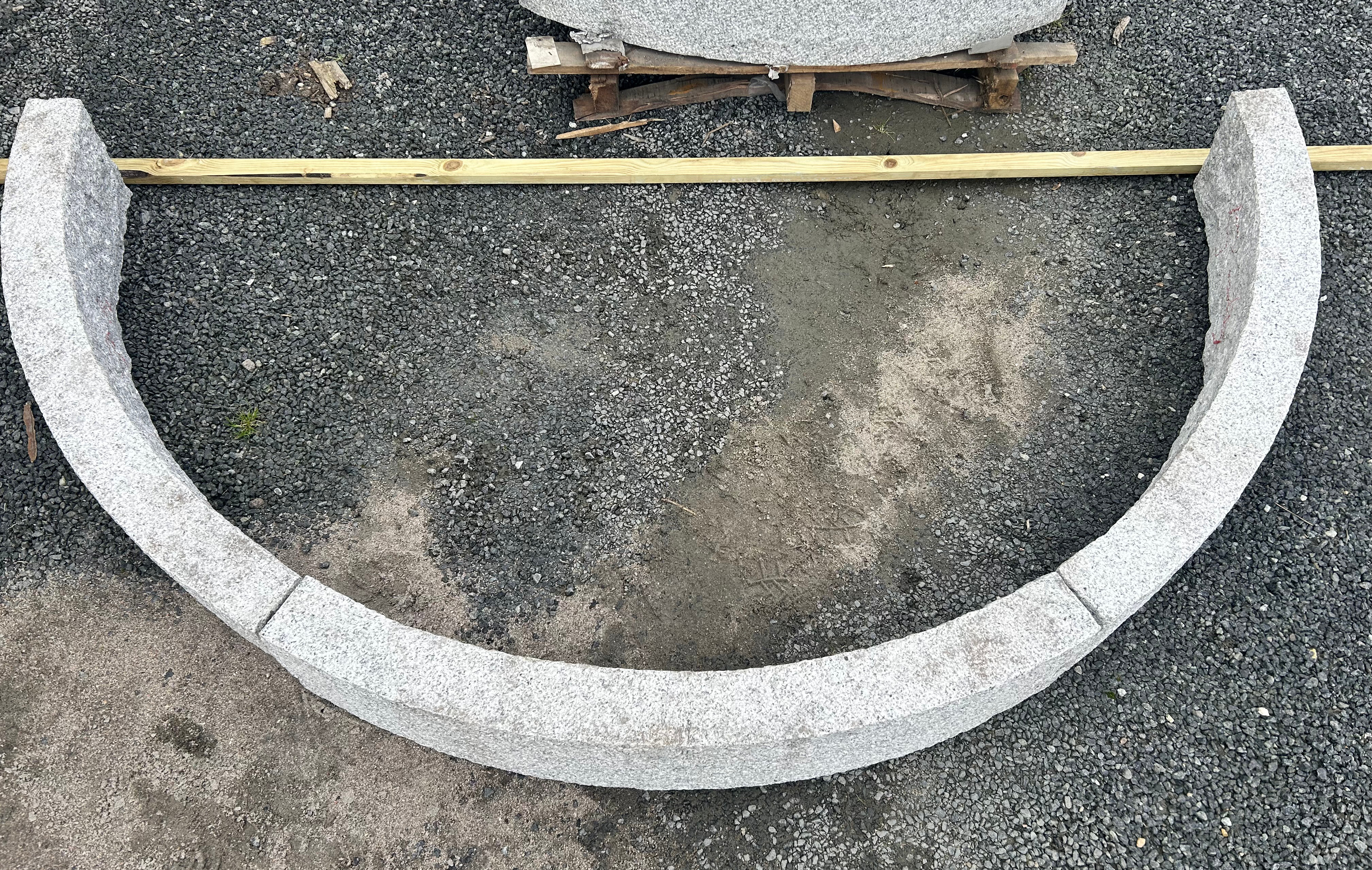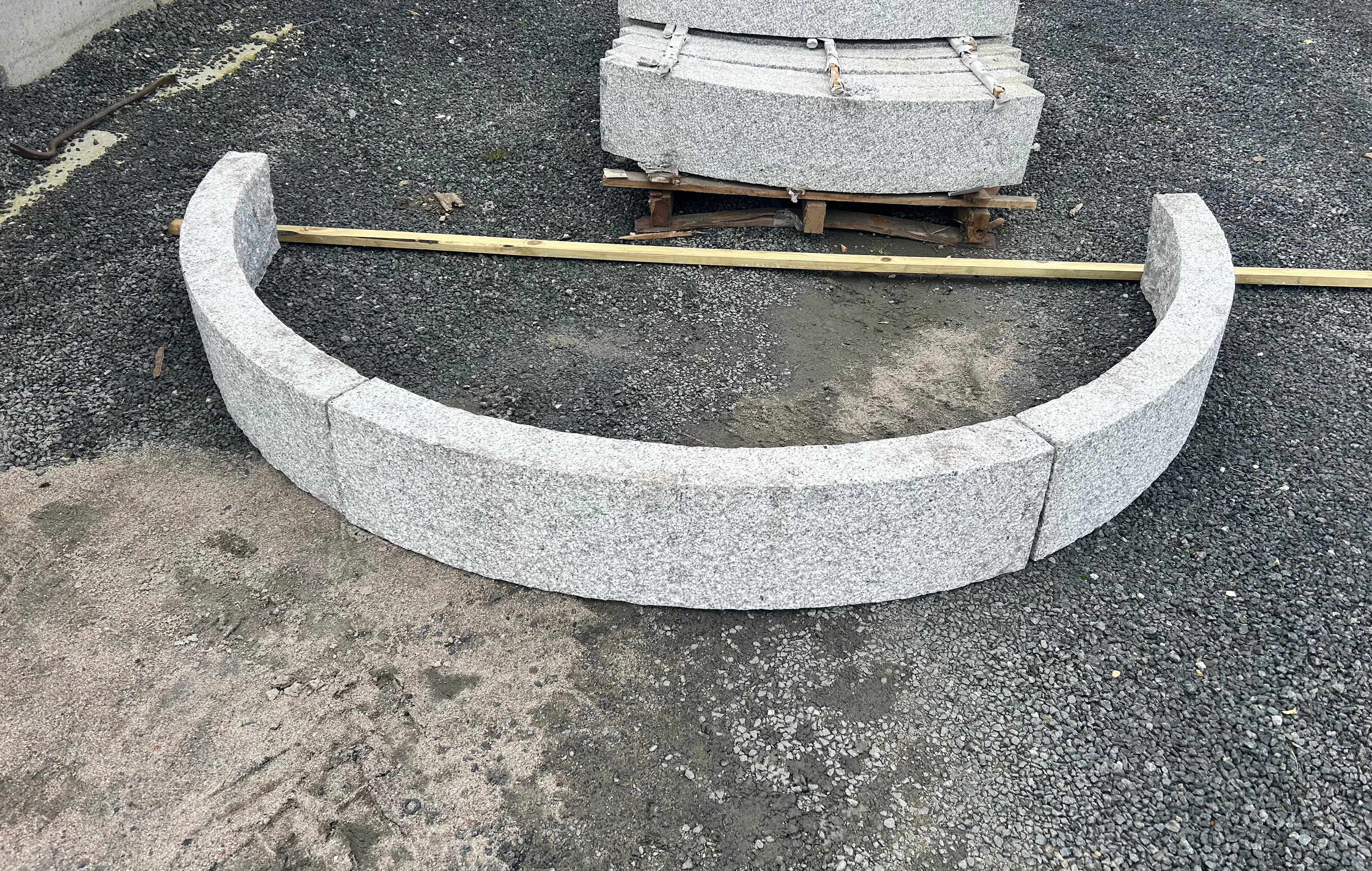 Kantstens trappe i lys grå granit med stokhugget overflade.