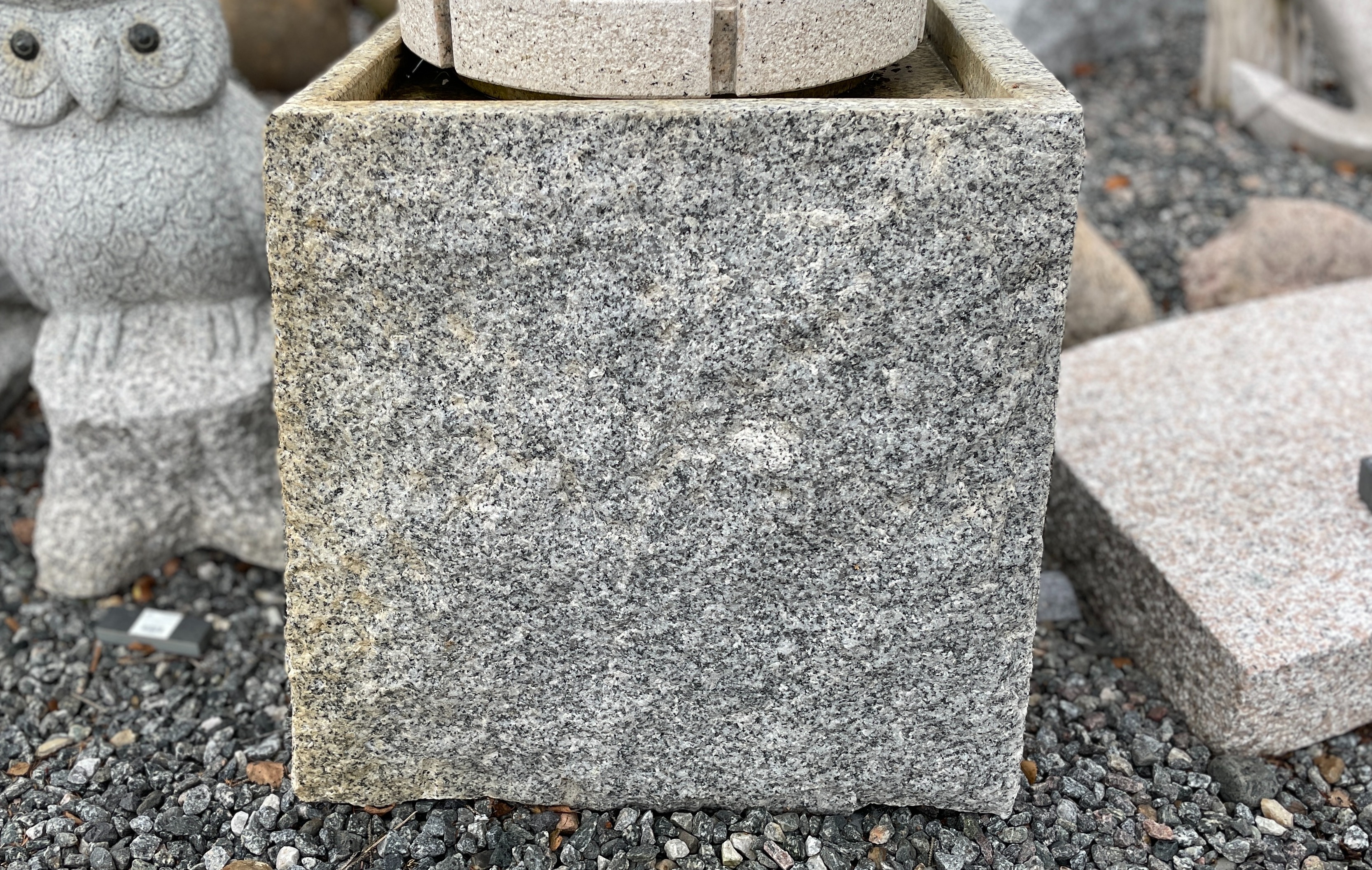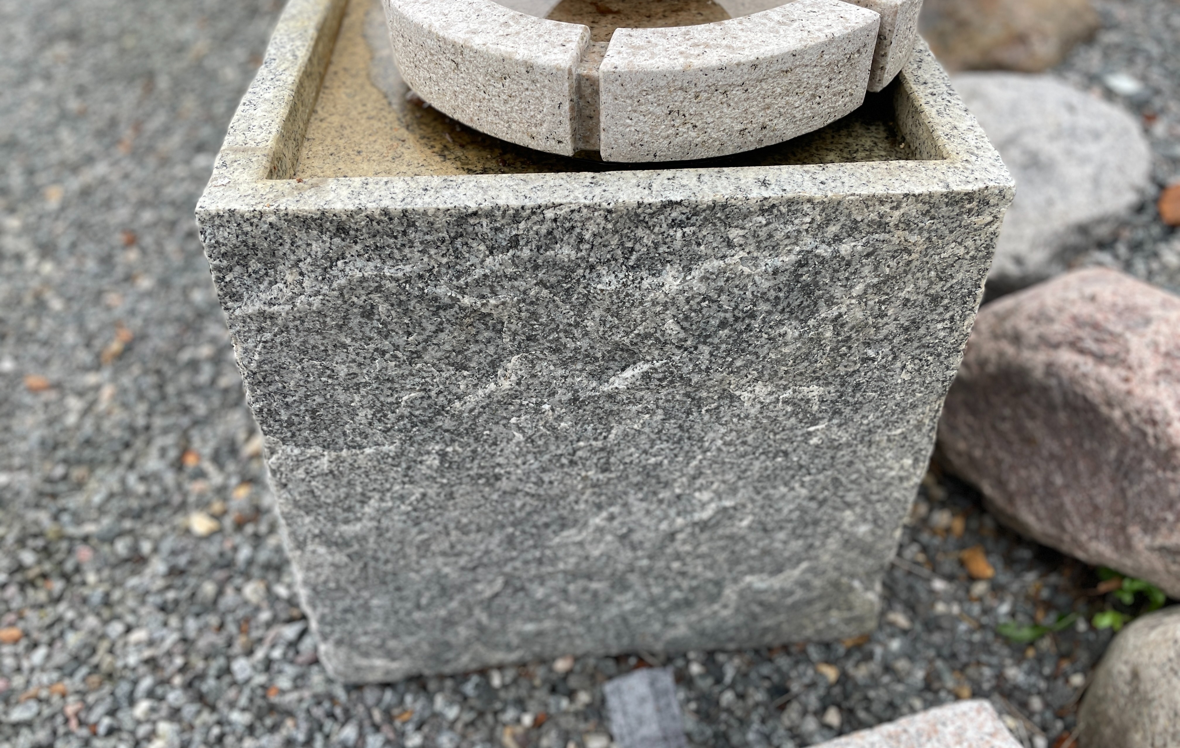 Kar lavet i grå granit med kløvede sider. Karret kan bruges under en vandsten for at give denne højde og blikfang eller blot som andet dekorativt element ved hus og have. Vandsten medfølger ikke.